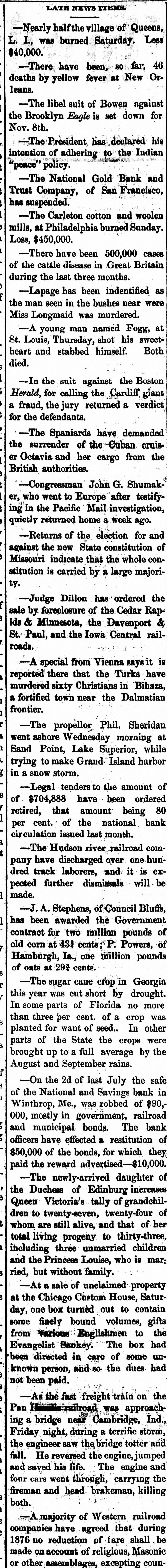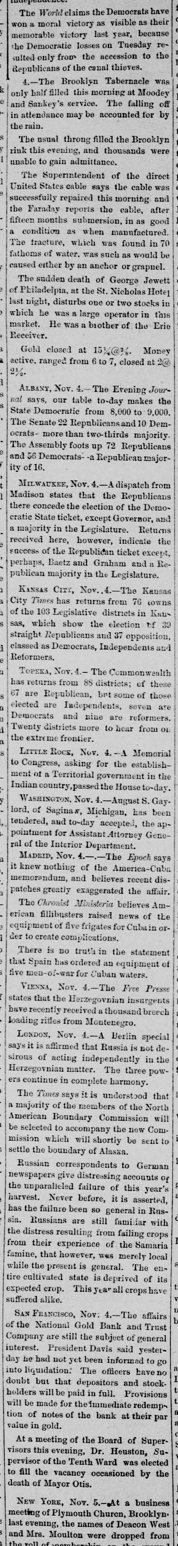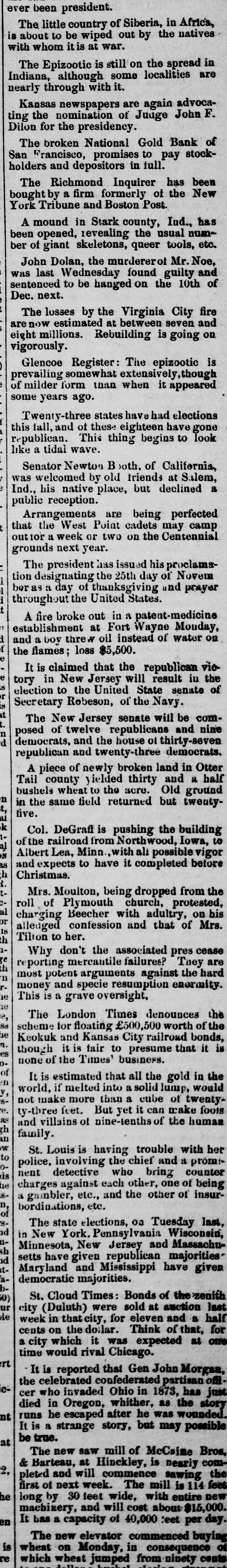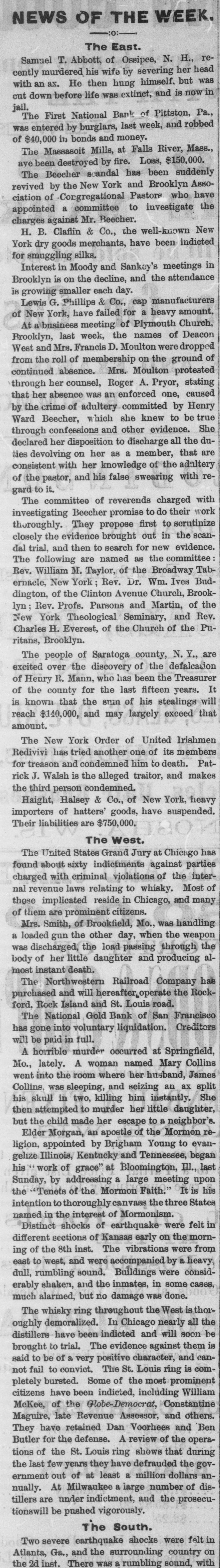 NEWS OF THE WEEK. The East. Samuel T. Abbott, of Ossipee, N. H., recently murdered his wife by severing her head with an ax. He then hung himself, but was cut down before life was extinct, and is now in jail. The First National Bank of Pittston, Pa., was entered by burglars, last week, and robbed of $40,000 in bonds and money. The Massasoit Mills, at Falls River, Mass., ave been destroyed by fire. Loss, $150,000. The Beecher scandal has been suddenly revived by the New York and Brooklyn Association of Corgregational Pastors who have appointed a committee to investigate the charges against Mr. Beecher. H. B. Claflin & Co., the well-known New York dry goods merchants, have been indicted for smuggling silks. Interest in Moody and Sankey's meetings in Brooklyn is on the decline, and the attendance is growing smaller each day. Lewis G. Phillips & Co., cap manufacturers of New York, have failed for a heavy amount. At a business meeting of Plymouth Church, Brooklyn, last week, the names of Deacon West and Mrs. Francis D. Moulton were dropped from the roll of membership on the ground of continued absence. Mrs. Moulton protested through her counsel, Roger A. Pryor, stating that her absence was an enforced one, caused by the crime of adultery committed by Henry Ward Beecher, which she knew to be true through confessions and other evidence. She declared her disposition to discharge all the duties devolving on her as a member, that are consistent with her knowledge of the adultery of the pastor, and his false swearing with regard to it. The committee of reverends charged with investigating Beecher promise to do their work thoroughly. They propose first to scrutinize closely the evidence brought out in the scandal trial, and then to search for new evidence. The following are named as the committee Rev. William M. Taylor, of the Broadway Tabernacle, New York Rev. Dr. Wm. Ives Buddington, of the Clinton Avenue Church, Brooklyn: Rev. Profs. Parsons and Martin, of the New York Theological Seminary, and Rev. Charles H. Everest, of the Church of the Puritans, Brooklyn. The people of Saratoga county, N. Y., are excited over the discovery of the defalcation of Henry R. Mann, who has been the Treasurer of the county for the last fifteen years. It is known that the sum of his stealings will reach $140,000, and may largely exceed that amount. The New York Order of United Irishmen Redivivi has tried another one of its members for treason and condemned him to death. Patrick J. Walsh is the alleged traitor, and makes the third person condemned. Haight, Halsey & Co., of New York, heavy importers of hatters' goods, have suspended. Their liabilities are $750,000. The West. The United States Grand Jury at Chicago has found about sixty indictments against parties charged with criminal violations of the internal revenue laws relating to whisky. Most of these implicated reside in Chicago, and many of them are prominent citizens. Mrs. Smith, of Brookfield, Mo., was handling a loaded gun the other day, when the weapon was discharged, the load passing through the body of her little daughter and producing almost instant death. The Northwestern Railroad Company has purchased and will hereafter,operate the Rockford, Rock Island and St. Louis road. The National Gold Bank of San Francisco has gone into voluntary liquidation. Creditors will be paid in full. A horrible murder occurred at Springfield, Mo., lately. A woman named Mary Collins went into the room where her husband, James Collins, was sleeping, and seizing an ax split his skull in two, killing him instantly. She then attempted to murder her little daughter, but the child made her escape to a neighbor's. Elder Morgan, an apostle of the Mormon religion, appointed by Brigham Young to evangelize Illinois, Kentucky and Tennessee, began his work of grace" at Bloomington, Ill., last Sunday, by addressing a large meeting upon the "Tenets of the Mormon Faith." It is his intention to thoroughly canvass the three States named in the interest of Mormonism. Distinct shocks of earthquake were felt in different sections of Kansas early on the morning of the 8th inst. The vibrations were from east to west, and were accompanied by a heavy, dull, rumbling sound. Buildings were considerably shaken, and the inmates, in some cases, much alarmed, but no damage was done. The whisky ring throughout the West is thoroughly demoralized. In Chicago nearly all the distillers have been indicted and will soon be brought to trial. The evidence against them is said to be of a very positive character, and cannot fail to convict. The St. Louis ring is completely bursted. Some of the most prominent citizens have been indicted, including William McKee, of the Globe-Democrat, Constantine Maguire, late Revenue Assessor, and others. They have retained Dan Voorhees and Ben Butler for the defense. A review of the operations of the St. Louis ring shows that during the last few years they have defrauded the government out of at least a million dollars annually. At Milwaukee a large number of dis-