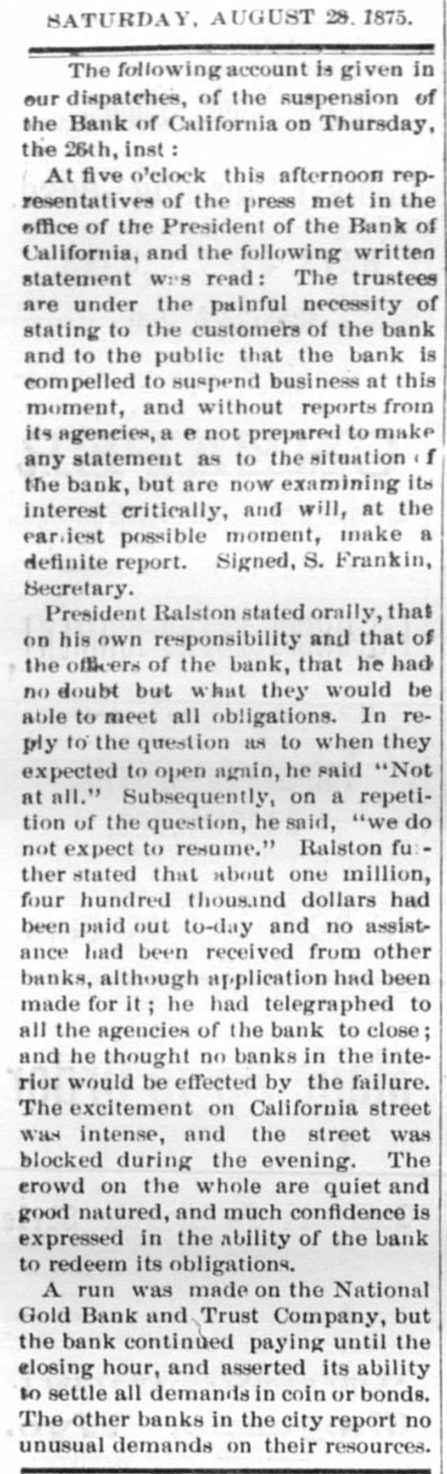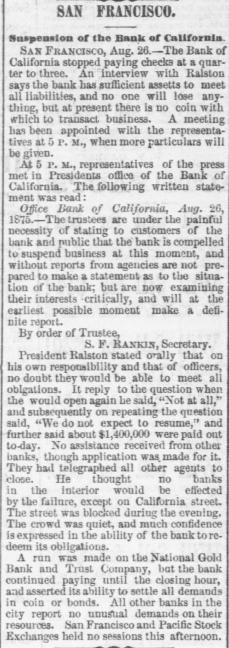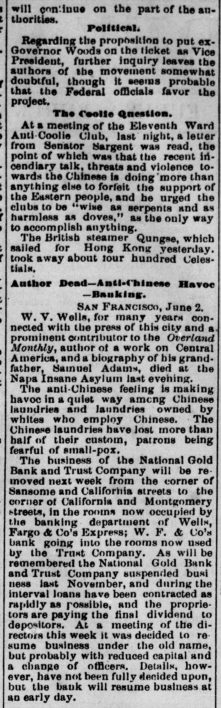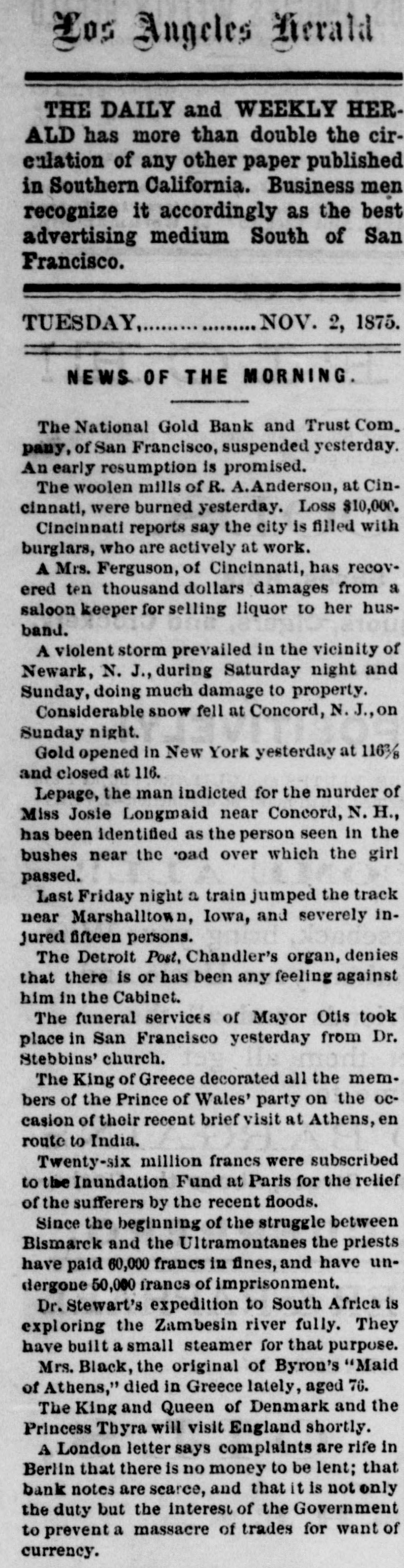 NEWS OF THE WEEK. The East. Samuel T. Abbott, of Ossipee, N. H., recently murdered his wife by severing her head with an ax. He then hung himself, but was cut down before life was extinct, and is now in jail. The First National Bank of Pittston, Pa., was entered by burglars, last week, and robbed of $40,000 in bonds and money. The Massasoit Mills, at Falls River, Mass., ave been destroyed by fire. Loss, $150,000. The Beecher scandal has been suddenly revived by the New York and Brooklyn Association of Corgregational Pastors who have appointed a committee to investigate the charges against Mr. Beecher. H. B. Claflin & Co., the well-known New York dry goods merchants, have been indicted for smuggling silks. Interest in Moody and Sankey's meetings in Brooklyn is on the decline, and the attendance is growing smaller each day. Lewis G. Phillips & Co., cap manufacturers of New York, have failed for a heavy amount. At a business meeting of Plymouth Church, Brooklyn, last week, the names of Deacon West and Mrs. Francis D. Moulton were dropped from the roll of membership on the ground of continued absence. Mrs. Moulton protested through her counsel, Roger A. Pryor, stating that her absence was an enforced one, caused by the crime of adultery committed by Henry Ward Beecher, which she knew to be true through confessions and other evidence. She declared her disposition to discharge all the duties devolving on her as a member, that are consistent with her knowledge of the adultery of the pastor, and his false swearing with regard to it. The committee of reverends charged with investigating Beecher promise to do their work thoroughly. They propose first to scrutinize closely the evidence brought out in the scandal trial, and then to search for new evidence. The following are named as the committee Rev. William M. Taylor, of the Broadway Tabernacle, New York Rev. Dr. Wm. Ives Buddington, of the Clinton Avenue Church, Brooklyn: Rev. Profs. Parsons and Martin, of the New York Theological Seminary, and Rev. Charles H. Everest, of the Church of the Puritans, Brooklyn. The people of Saratoga county, N. Y., are excited over the discovery of the defalcation of Henry R. Mann, who has been the Treasurer of the county for the last fifteen years. It is known that the sum of his stealings will reach $140,000, and may largely exceed that amount. The New York Order of United Irishmen Redivivi has tried another one of its members for treason and condemned him to death. Patrick J. Walsh is the alleged traitor, and makes the third person condemned. Haight, Halsey & Co., of New York, heavy importers of hatters' goods, have suspended. Their liabilities are $750,000. The West. The United States Grand Jury at Chicago has found about sixty indictments against parties charged with criminal violations of the internal revenue laws relating to whisky. Most of these implicated reside in Chicago, and many of them are prominent citizens. Mrs. Smith, of Brookfield, Mo., was handling a loaded gun the other day, when the weapon was discharged, the load passing through the body of her little daughter and producing almost instant death. The Northwestern Railroad Company has purchased and will hereafter,operate the Rockford, Rock Island and St. Louis road. The National Gold Bank of San Francisco has gone into voluntary liquidation. Creditors will be paid in full. A horrible murder occurred at Springfield, Mo., lately. A woman named Mary Collins went into the room where her husband, James Collins, was sleeping, and seizing an ax split his skull in two, killing him instantly. She then attempted to murder her little daughter, but the child made her escape to a neighbor's. Elder Morgan, an apostle of the Mormon religion, appointed by Brigham Young to evangelize Illinois, Kentucky and Tennessee, began his work of grace" at Bloomington, Ill., last Sunday, by addressing a large meeting upon the "Tenets of the Mormon Faith." It is his intention to thoroughly canvass the three States named in the interest of Mormonism. Distinct shocks of earthquake were felt in different sections of Kansas early on the morning of the 8th inst. The vibrations were from east to west, and were accompanied by a heavy, dull, rumbling sound. Buildings were considerably shaken, and the inmates, in some cases, much alarmed, but no damage was done. The whisky ring throughout the West is thoroughly demoralized. In Chicago nearly all the distillers have been indicted and will soon be brought to trial. The evidence against them is said to be of a very positive character, and cannot fail to convict. The St. Louis ring is completely bursted. Some of the most prominent citizens have been indicted, including William McKee, of the Globe-Democrat, Constantine Maguire, late Revenue Assessor, and others. They have retained Dan Voorhees and Ben Butler for the defense. A review of the operations of the St. Louis ring shows that during the last few years they have defrauded the government out of at least a million dollars annually. At Milwaukee a large number of dis-