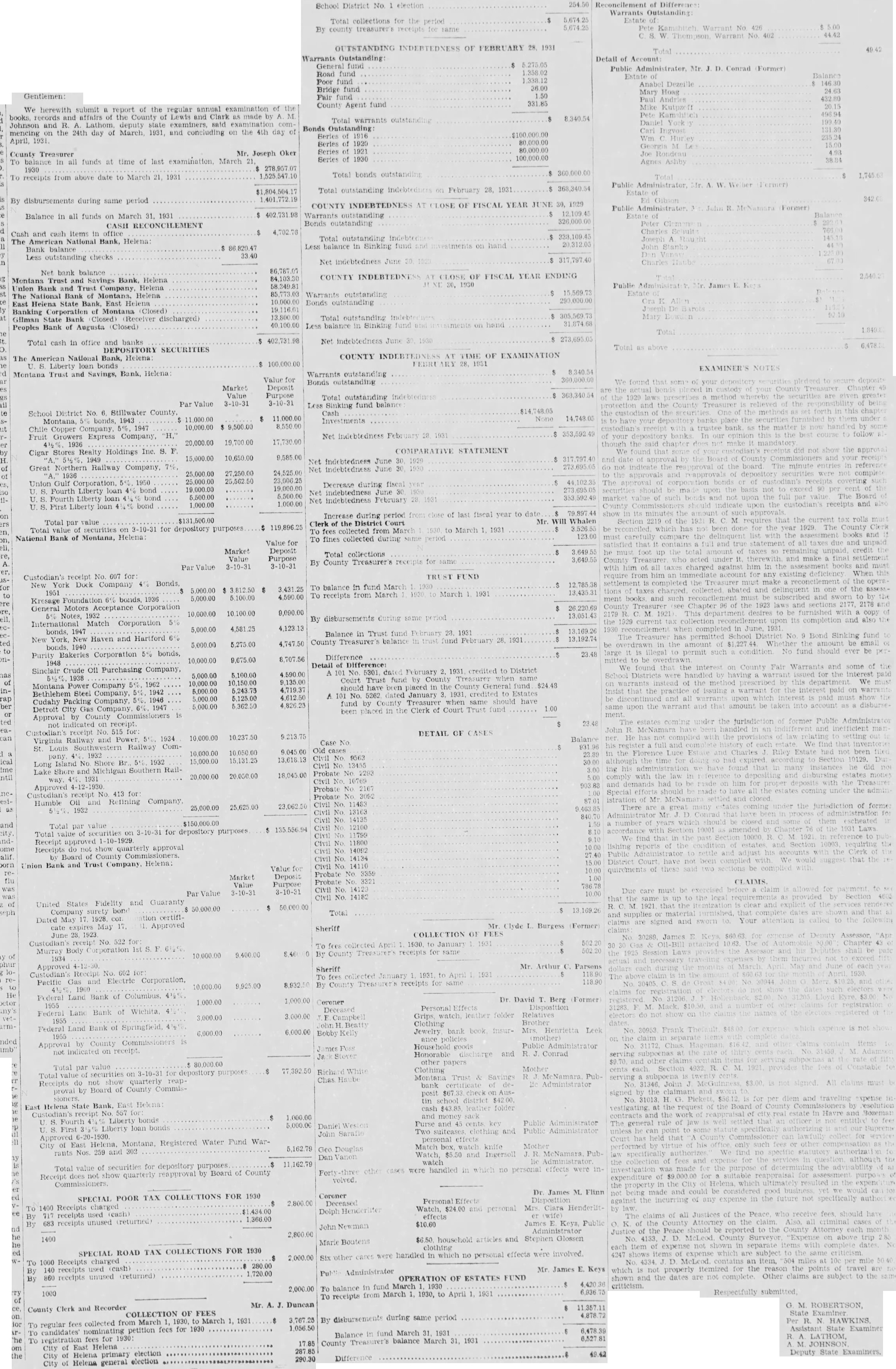 Gentlemen: We herewith submit a report of the regular annual examination of the books, records and affairs of the County of Lewis and Clark RS made by A M Johnson and R. Lathom deputy state examiners, said examination commencing on the 24th day of March 1931, and concluding on the 4th day of April, 1931. Mr. Joseph Oker County Treasurer To balance in all funds at time of last examination. March 21, 278,957.07 1930 1,525,547.10 To receipts from above date to March 21, 1931 By disbursements during same period $1,804,504.17 402,731.98 4,702.76 254.50 COUNTY INDEBTEDNESS AT CLOSE OF FISCAL YEAR JUNE 12,109.45 Warrants outstanding 326,000.00 Bonds outstanding Total outstanding Less balance in Sinking fund on hand INDEBTEDNESS AT CLOSE OF FISCAL YEAR ENDING COUNTY 30, 1930 15,569.73 Warrants outstanding Bonds outstanding Total outstanding fund hand 31,874.68 Less balance in Sinking on 317,797.40 $ Net indebtedness June COUNTY INDEBTEDNESS TIME OF EXAMINATION FEBRI ARY 28, 1931 8,340.54 Warrants outstanding 360,000.00 Bonds outstanding Total outstanding Less Sinking fund balance $14,748.05 Cash None 14,748.05 Investments Net indebtedness February Deceased Campbell Beatty Bobby Poss Stover 13,051.43 Total par value 77,392.50 on 3-10-31 for depository purposes Total value of securities Receipts not show quarterly reapproval by Board of County Commissioners. East Helena State Bank. East Helena: Custodian's receipt No 557 U. S. Fourth Liberty bonds 5,000.00 First Liberty loan bonds City Approved of East Helena, Montana, Registered Water Fund War5,162.79 259 and 302 rants 11,162.79 Total value of securities for depository purposes Receipt does not show quarterly reapproval by Board of County Commissioners. COLLECTIONS FOR 1930 POOR TAX SPECIAL To 1400 Receipts charged $1,434.00 By 717 receipts used (cash) 1,366.00 By 683 receipts unused (returned) 1400 2,800.00 2,800.00 COLLECTIONS FOR 1930 SPECIAL ROAD TAX 2,000.00 To 1000 Receipts charged By 140 receipts used (cash) 1,720.00 By 860 receipts unused (returned) 2,000.00 1000 Mr. A. J. Duncan Clerk and Recorder County COLLECTION OF FEES 1930, to March 3,767.25 collected from March To regular fees for 1930 1,056.50 petition fees candidates' nominating To To registration fees for 1930: 17.85 City East Helena 287.85 City Helena primary election 290.30 election City of Helena general White Chas Haube Daniel John Sarafie Geo Douglas Dan Vanon volved. Dr. David T. Berg Former Personal Disposition Grips, watch, leather folder Relatives Brother Clothing bank book Mrs. Henrietta Leek Jewelry (mother) ance policies goods Public Honorable discharge and Conrad other papers Clothing Mother Montana Trust & Savings Pubbank certificate of de- Administrator posit Austin school district cash $43.85 leather folder and money sack Purse and 45 cents key Public Administrator Two suitcases clothing and Public Administrator personal effects Match box. watch knife Mother $5.50 and Ingersoll Pubwatch were handled in no personal effects were John Dr. James M. Flinn Coroner Personal Disposition Deceased $24.00 personal Mrs Clara HenderlitWatch, effects James Keys, Public $10.60 Administrator $6.50 household articles and Stephen Glossen Marie Boutens clothing Six other cases were handled in which no personal effects were involved. EXAMINER'S NOTES We found that your depository deposits are the actual bonds placed in custody your County Treasurer Chapter of the 1929 laws method whereby are given greater protection and the County Treasurer relieved the responsibility of being the methods forth in this chapter the custodian of the to have banks place the securities furnished by them under the matter by some custodian trustee of your depository banks In our opinion the best course follow though the said chapter make mandatory receipts did not show the approval We and date of approval by Board County and receipts do not indicate the of the board The minute in reference to the approvals reapprovals of depository complete The bonds of custodian's receipts covering such securities should be upon the basis not to exceed 90 per cent of market value of such and not upon the full par value The Board County Commissioners indicate upon the custodian's receipts and show in its minutes the amount of such Section 2219 of the 1931 M requires that the current tax rolls must for the year 1929 The County Clerk be reconciled which not been done must carefully compare the list with the assessment books and satisfied that contains and true statement of all taxes due and unpaid he must foot up of taxes unpaid, credit the County Treasurer who acted under It and make final settlement with him of all taxes charged against him in the books and must require from him an immediate account for any existing deficiency When this settlement completed the must make reconcilement of the operations of taxes charged collected abated and delinquent in one of the assesssubscribed and sworn to by the ment books and such must County Treasurer see Chapter 96 of the 1923 and sections 2177 2178 and M This desires to be furnished with copy 2179 the 1929 tax upon its completion and also the 1930 completed in June The Treasure has permitted District No Bond Sinking fund amount be small be in the amount large illegal permit condition No fund should ever be mitted to be overdrawn We found interest on County Fair Warrants and some of School Districts handled by having warrant issued for the interest paid on warrants instead of the method prescribed this department We must insist that practice of issuing warrant for the interest paid on upon which interest paid must show be discontinued and all same upon the warrant and that amount be taken account as disburse. ment The estates under the jurisdiction former Public Administrator McNamara handled inefficient John R ner has with the setting his We find that inventorie Florence Luce Charles Riley Estate had not been filed in the 30.00 although time expired Section 10129. Dut ing his adm