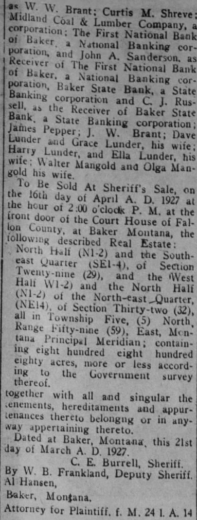 as W. W. Brant: Curtis M. Shreve: Midland Coal & Lumber Company, a corporation: The First National Bank of Baker National Banking corporation, and John A. Sanderson. as of Receiver of The First National Bank Baker, National Banking cor poration, Baker State Bank, State Banking corporation and C. J. Russell, as the Receiver of Baker State Bank a State Banking corporation; James Pepper; J. W. Brant; Dave Lunder and Grace Lunder, his wife; Harry Lunder, and Ella Lunder, his gold wife his alter wife. Mangold and Olga ManTo Be Sold At Sheriff's Sale, on the 16th day of April A. D. 1927 at the hour of 2:00 o'clock P. M. at the front door of the Court House of Fallon County, at Baker Montana, the following described Real Estate: North Half (N1-2) and the Southeast Quarter (SE1-4), of Section Twenty nine (29), and the West Half W1-2) and the North Half (N1-2) of the North-east (NE14). of Section Thirty two (32), all in Township Five, (5) North. Range Fifty-nine (59), East, Montana Principal Meridian; containing eight hundred eight hundred eighty acres, more or less according thereof. to the Government survey together with all and singular the tenements, hereditaments and appurtenances thereto belongng or in anyway appertaining thereto. Dated at Baker, Montana, this 21st day of March A D. 1927. C. E. By W. B. Frankland, Burrell, Deputy Sheriff. Sheriff. Al Hansen, Attorney for Plaintiff. f. M. 24 A. 14