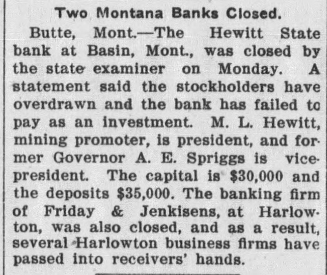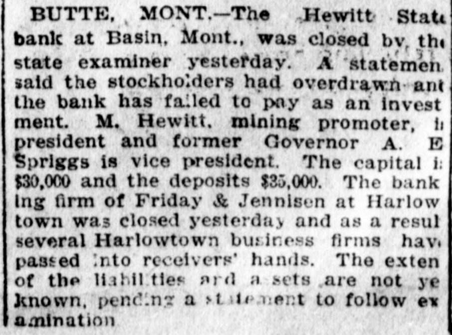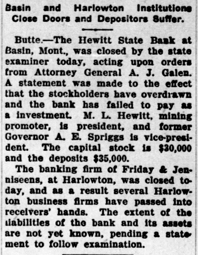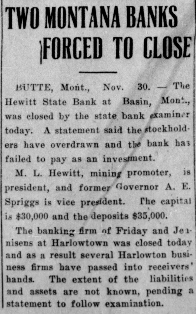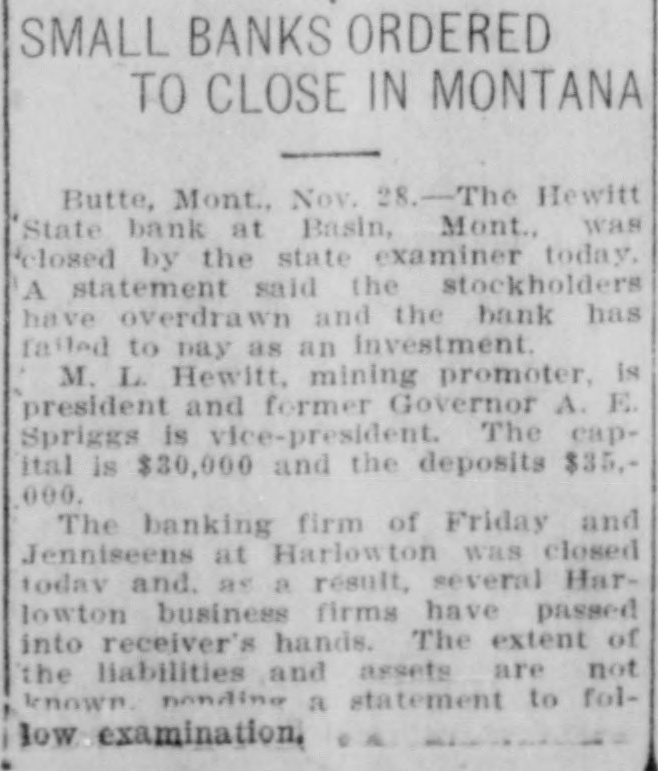 SMALL BANKS ORDERED TO CLOSE IN MONTANA | Butte, Mont., Nov. 28.-The Hewitt State bank at Basin, Mont., was closed by the state examiner today. A statement said the stockholders have overdrawn and the bank has failed to pay as an investment. M. L. Hewitt, mining promoter, is president and former Governor A. E. Spriggs is vice-president. The capital is $30,000 and the deposits $35.000. The banking firm of Friday and Jenniseens at Harlowton was closed today and. as a result, several Harlowton business firms have passed into receiver's hands. The extent of the liabilities and assets are not known. ponding a statement to follow examination,