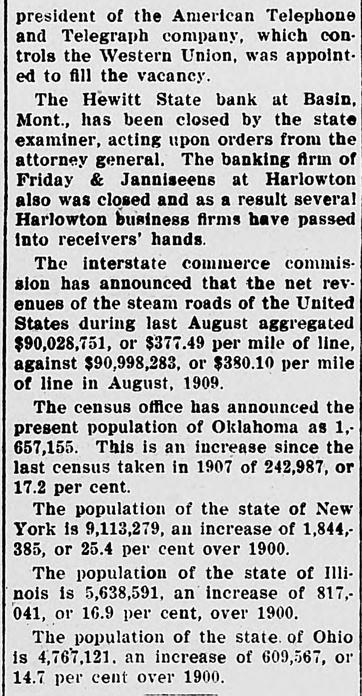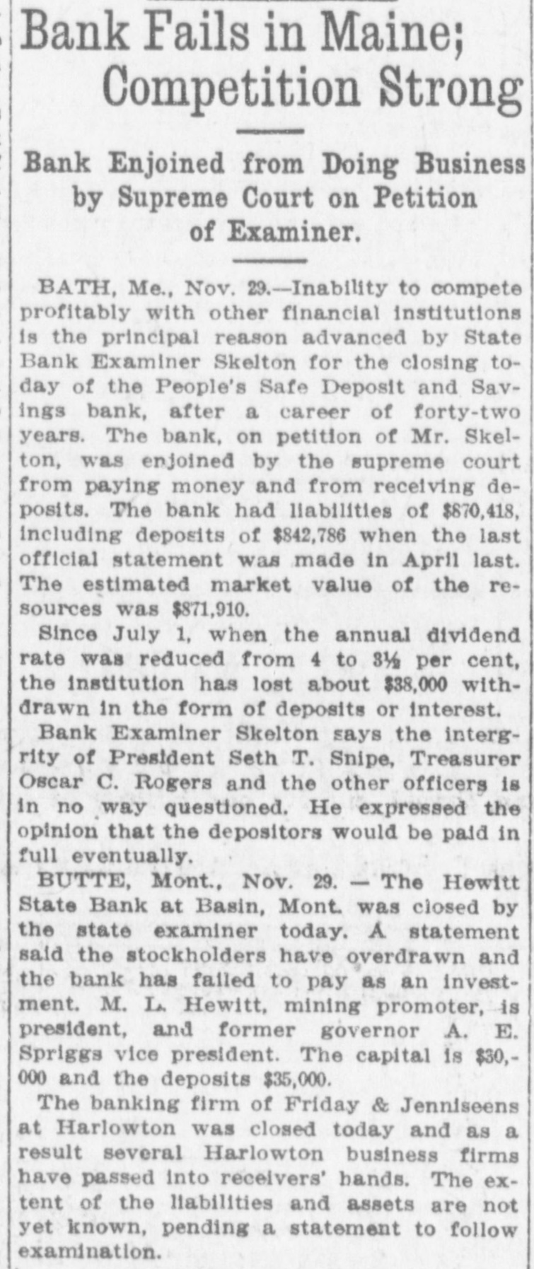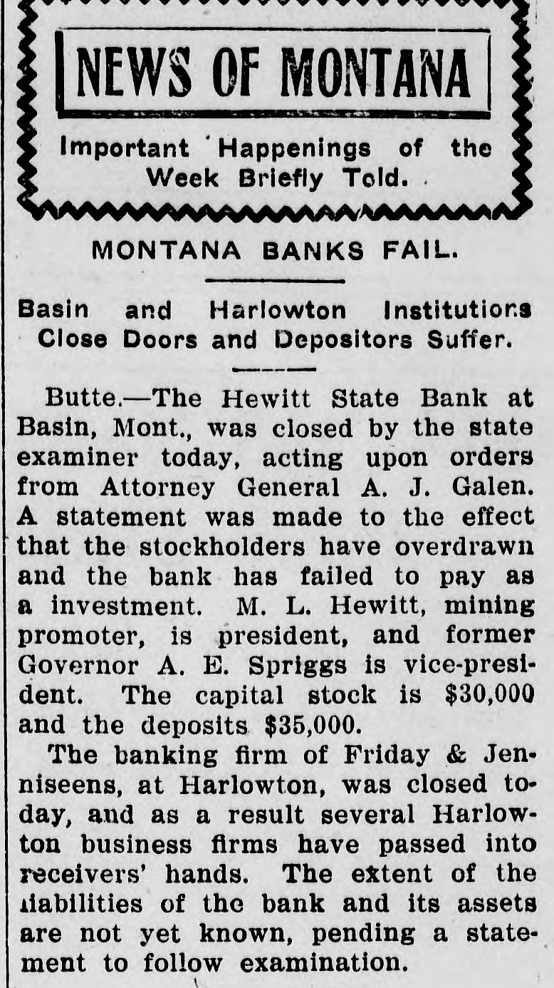 SMALL BANKS ORDERED TO CLOSE IN MONTANA | Butte, Mont., Nov. 28.-The Hewitt State bank at Basin, Mont., was closed by the state examiner today. A statement said the stockholders have overdrawn and the bank has failed to pay as an investment. M. L. Hewitt, mining promoter, is president and former Governor A. E. Spriggs is vice-president. The capital is $30,000 and the deposits $35.000. The banking firm of Friday and Jenniseens at Harlowton was closed today and. as a result, several Harlowton business firms have passed into receiver's hands. The extent of the liabilities and assets are not known. ponding a statement to follow examination,