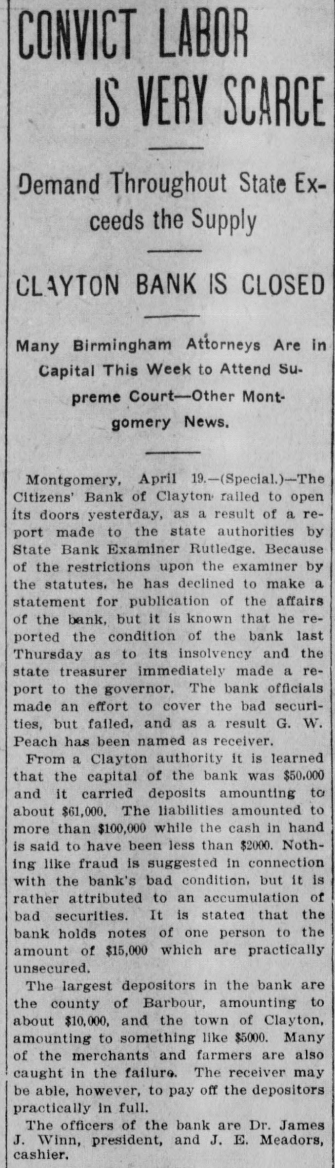 CONVICT LABOR IS VERY SCARCE Demand Throughout State Exceeds the Supply CLAYTON BANK IS CLOSED Many Birmingham Attorneys Are in Capital This Week to Attend Supreme Court-Other Montgomery News. Montgomery, April 19.-(Special.)-The Citizens' Bank of Clayton railed to open its doors yesterday, as a result of a report made to the state authorities by State Bank Examiner Rutledge. Because of the restrictions upon the examiner by the statutes. he has declined to make a statement for publication of the affairs of the bank, but it is known that he reported the condition of the bank last Thursday as to its insolvency and the state treasurer immediately made a report to the governor. The bank officials made an effort to cover the bad securities, but failed, and as a result G. W. Peach has been named as receiver. From a Clayton authority it is learned that the capital of the bank was $50,000 and it carried deposits amounting to about $61,000. The liabilities amounted to more than $100,000 while the cash in hand is said to have been less than $2000. Nothing like fraud is suggested in connection with the bank's bad condition, but it is rather attributed to an accumulation of bad securities. It is stated that the bank holds notes of one person to the amount of $15,000 which are practically unsecured. The largest depositors in the bank are the county of Barbour, amounting to about $10,000, and the town of Clayton, amounting to something like $5000. Many of the merchants and farmers are also caught in the failure. The receiver may be able, however, to pay off the depositors practically in full. The officers of the bank are Dr. James J. Winn, president, and J. E. Meadors, cashier.