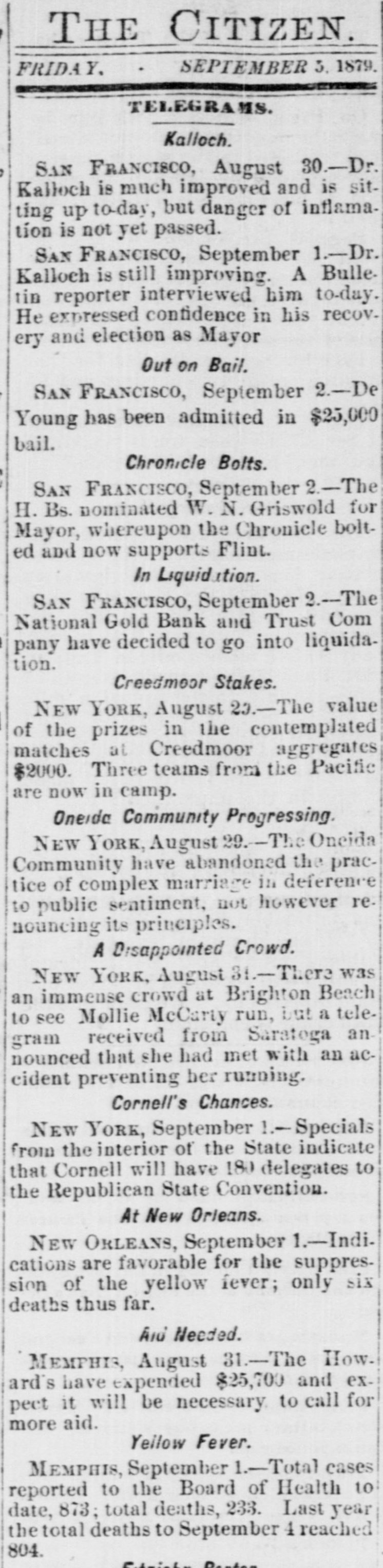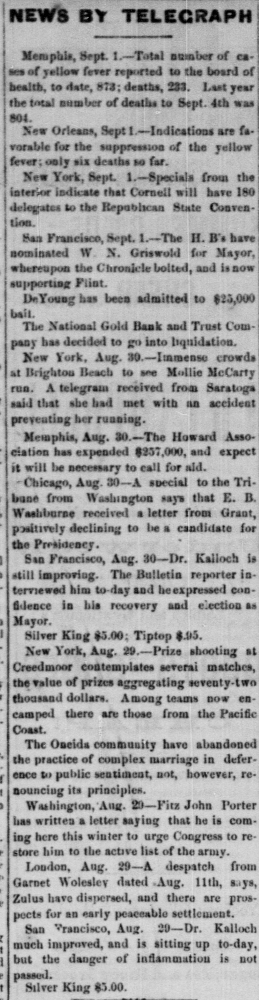 NEWS BY TELEGRAPH Memphis, Sept. 1.-Total number of cases of yellow fever reported to the board of health, to date, 873; deaths, 233. Last year the total number of deaths to Sept. 4th was 804. New Orleans, Sept 1.-Indications are favorable for the suppression of the yellow fever; only six deaths so far. New York, Sept. 1.-Specials from the interior indicate that Cornell will have 180 delegates to the Republican State Convention. San Francisco, Sept. 1.-The H. B's have nominated W. N. Griswold for Mayor, whereupon the Chronicle bolted, and isnow supporting Flint. DeYoung has been admitted to $25,000 bail. The National Gold Bank and Trust Company has decided to go into liquidation. New York, Aug. 30.-Immense crowds at Brighton Beach to see Mollie McCarty run. A telegram received from Saratoga said that she had met with an accident preventing her running. Memphis, Aug. 30.-The Howard Assoclation has expended $257,000, and expect it will be necessary to call for ald. Chicago, Aug. 30-A special to the Tribase from Washington says that E. B. Washburne received a letter from Grant, positively declining to be a candidate for the Presidency. San Francisco, Aug. 30-Dr. Kalloch is still improving. The Bulletin reporter interviewed him to-day and heexpressed confidence in his recovery and election as Mayor. Silver King $5.00; Tiptop $.95. New York, Aug. 29.-Prize shooting at Creedmoor contemplates several matches, the value of prizes aggregating seventy-two thousand dollars. Among teams now encamped there are those from the Pacific Coast. The Oncida community have abandoned the practice of complex marriage in deference to public sentiment, not, however, renouncing its principles. Washington, Aug. 20-Fitz John Porter has written a letter saying that he is coming here this winter to urge Congress to restore him to the active list of the army. London, Aug. 29-A despatch from Garnet Wolesley dated Aug. 11th, says, Zulus have dispersed, and there are prospects for an early peaceable settlement. San Francisco, Aug. 29-Dr. Kalloch much improved, and is sitting up to-day, but the danger of inflammation is not passed. Silver King $5.00.