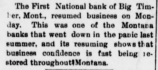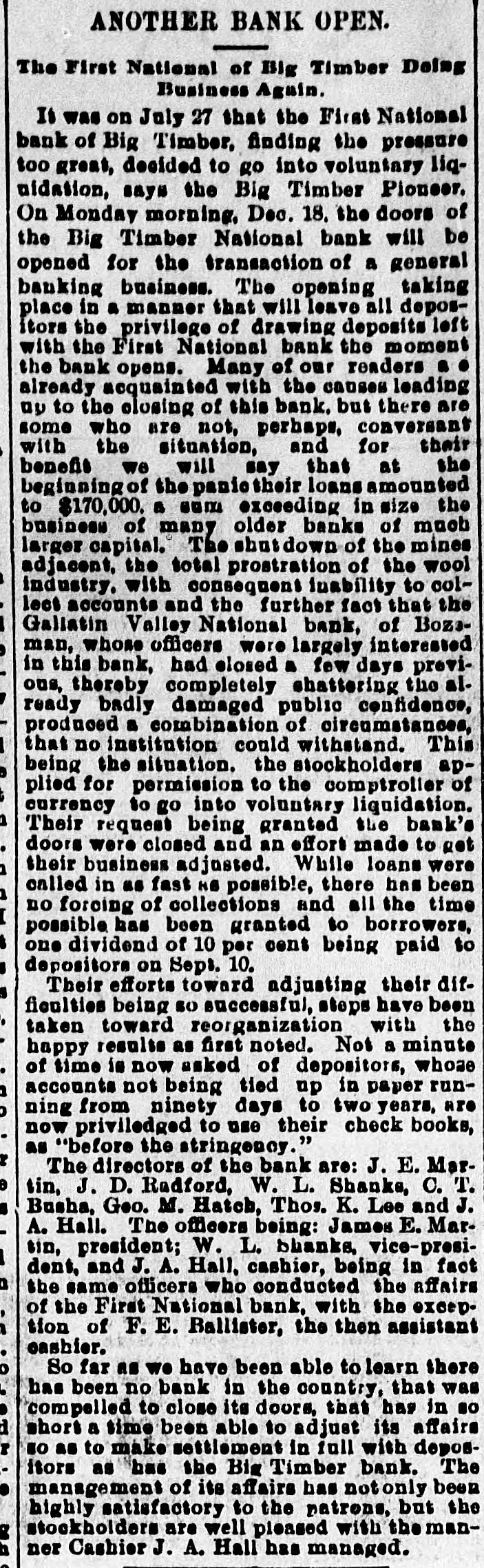 ANOTHER BANK OPEN. The First National of Big Timber Doing Business Aguin. It was on July 27 that the First National bank of Big Timber, finding the pressure too great, decided to go into voluntary liquidation, sayu the Big Timber Pioneer. On Monday morning, Dec. 18. the doors of the Big Timber National bank will be opened for the transaction of a general business. The opening taking a manner that of drawing banking place itors the in privilege will leave deposits all depos- left with the First National bank the moment the bank opens. Many of our readers a . already acquainted with the causes leading up to the closing of this bank. but there are some who are not, perhaps, conversant with the situation, and for their benefit we will say that at she of older to beginning business $170,000. of a the many sum panic exceeding their banks loans amounted in of mize much the larger capital. The shutdown of the mines adjacent, the total prostration of the wool industry. with consequent luability to collect accounts and the further fact that the Galiatin Valley National bank, of Bozsman, whose officers were largely intercased in this bank, had closed a few days previous, thereby completely shattering the al. ready badly damaged public confidence, produced a combination of circumstances, that no institution could withstand. This being the situation. the stockholders applied for permission to the comptroller of currency to go into voluntary liquidation. Their request being granted the bank's doors were closed and an effort made to get their business ad djusted. While loans were called in as fast HS possible, there has been no forcing of collections and all the time possible has been granted to borrowers, one dividend of 10 per cent being paid to depositors on Seps. 10. Their efforts toward adjusting their diffioulties being so successful, steps have been taken toward reorganization with the happy results as first noted. Not a minute of time is now asked of depositors, whoae accounts not being tied up in paper running from ninety days to two years, are now priviledged to use their check books, as "before the stringency." The directors of the bank are: J. E. Mare tin, J. D. Radford, W. L. Shanks, C. T. Busha, Goo. M. Hatch, Thos. K. Lee and J. A. Hall. The officers being: James E. Marsin, president; W. L. bhanks, vice-president, and J. A. Hall, cashier, being in fact the same officers who conducted the affairs of the First National bank, with the exception of F. E. Ballister, the then assistant eashier. So far as we have been able to learn there has been no bank in the country, that was compelled to close its doors, that has in so short a time been able to adjust its affairs NO as to make settlement in full with depositors as has the Big Timber bank. The management of its affairs has notonly been highly satisfactory to the patrons, but the stockholders are well pleased with the manner Cashier J. A. Hall has managed.