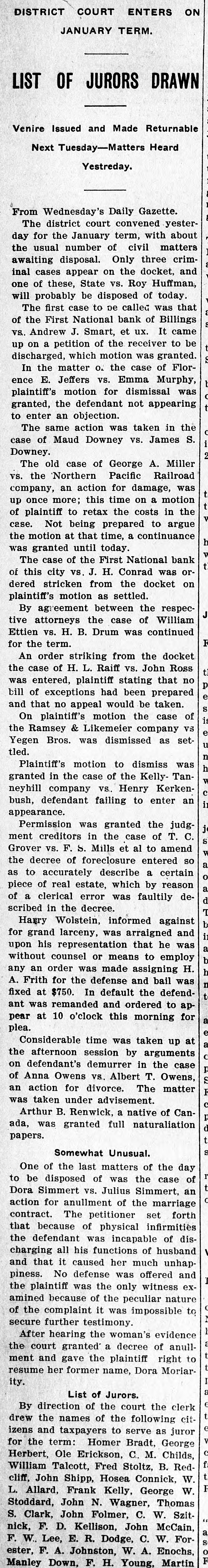 DISTRICT COURT ENTERS ON JANUARY TERM. LIST OF JURORS DRAWN Venire Issued and Made Returnable Next Tuesday-Matters Heard Yestreday. From Wednesday's Daily Gazette. The district court convened yesterday for the January term, with about the usual number of civil matters awaiting disposal. Only three criminal cases appear on the docket, and one of these, State vs. Roy Huffman, will probably be disposed of today. The first case to be called was that of the First National bank of Billings VS. Andrew J. Smart, et ux. It came up on a petition of the receiver to be discharged, which motion was granted. In the matter O2 the case of Florence E. Jeffers vs. Emma Murphy, plaintiff's motion for dismissal was granted, the defendant not appearing to enter an objection. The same action was taken in the case of Maud Downey vs. James S. Downey. The old case of George A. Miller vs. the Northern Pacific Railroad company, an action for damage, was motion e uo time this more occe dn of plaintiff to retax the costs in the case. Not being prepared to argue the motion at that time, a continuance was granted until today. The case of the First National bank of this city vs. J. H. Conrad was ordered stricken from the docket on plaintiff's motion as settled. By agreement between the respective attorneys the case of William Ettien vs. H. B. Drum was continued for the term. An order striking from the docket the case of H. L. Raiff vs. John Ross was entered, plaintiff stating that no bill of exceptions had been prepared and that no appeal would be taken. On plaintiff's motion the case of the Ramsey & Likemeier company VS Yegen Bros. was dismissed as settled. Plaintiff's motion to dismiss was granted in the case of the Kelly- Tanneyhill company vs.. Henry Kerkenbush, defendant failing to enter an appearance. Permission was granted the judgment creditors in the case of T. C. Grover VS. F. S. Mills et al to amend the decree of foreclosure entered SO as to accurately describe a certain piece of real estate, which by reason of a clerical error was faultily described in the decree. Harry Wolstein, informed against for grand larceny, was arraigned and upon his representation that he was without counsel or means to employ any an order was made assigning H. A. Frith for the defense and bail was fixed at $750. In default the defendant was remanded and ordered to appear at 10 o'clock this morning for plea. Considerable time was taken up at the afternoon session by arguments on defendant's demurrer in the case of Anna Owens VS. Albert T. Owens, an action for divorce. The matter was taken under advisement. Arthur B. Renwick, a native of Canada, was granted full naturaliation papers. Somewhat Unusual. One of the last matters of the day to be disposed of was the case of Dora Simmert vs. Julius Simmert, an action for anullment of the marriage contract. The petitioner set forth that because of physical infirmities the defendant was incapable of discharging all his functions of husband and that it caused her much unhappiness. No defense was offered and the plaintiff was the only witness examined because of the peculiar nature of the complaint it was impossible to