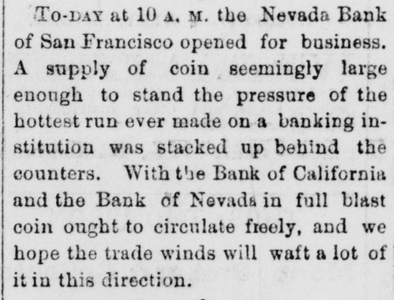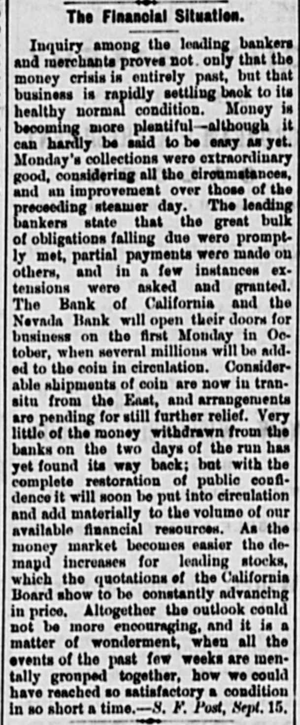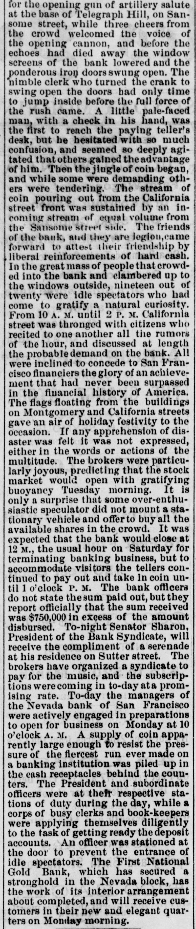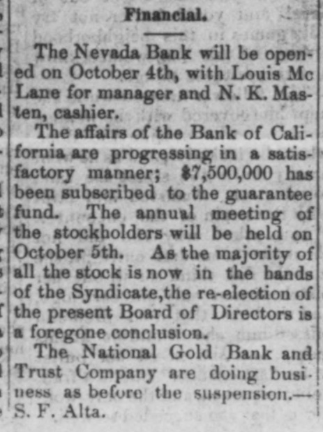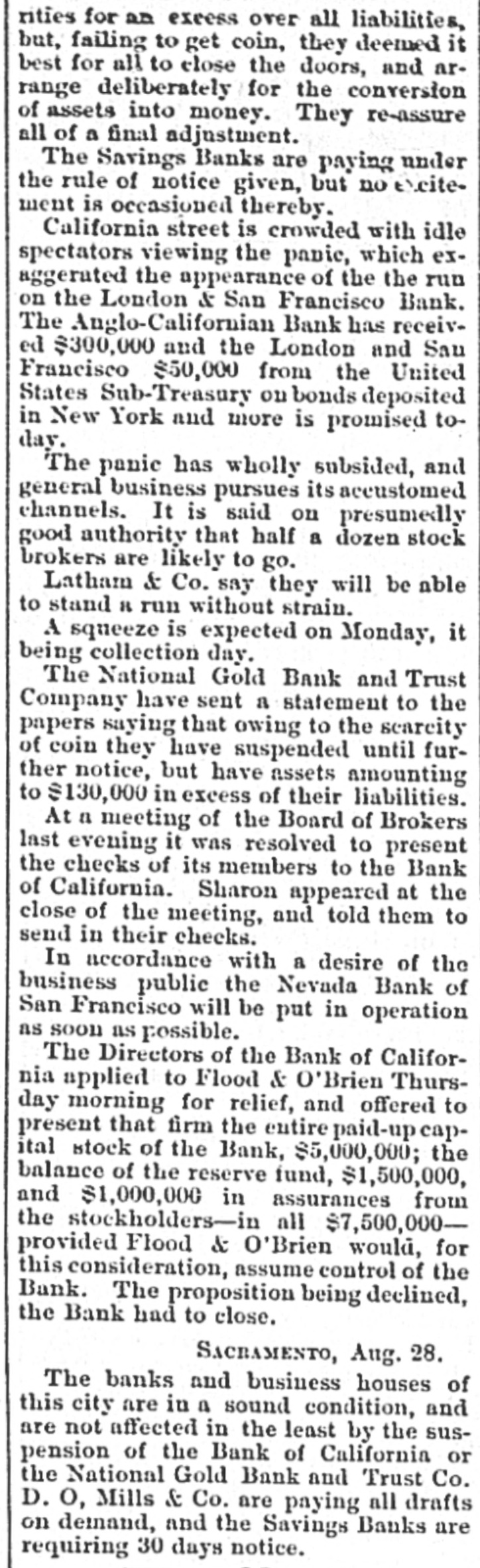 rities for an excess over all liabilities, but, failing to get coin, they deemed it best for all to close the doors, and arrange deliberately for the conversion of assets into money. They re-assure all of a final adjustment. The Savings Banks are paying under the rule of notice given, but no exitement is occasioned thereby. California street is crowded with idle spectators viewing the panic, which exaggerated the appearance of the the run on the London s San Francisco Bank. The Anglo-Californian Bank has received $300,000 and the London and Sau Francisco $50,000 from the United States Sub-Treasury on bonds deposited in New York and more is promised today. The panic has wholly subsided, and general business pursues its accustomed channels. It is said on presumedly good authority that half a dozen stock brokers are likely to go. Latham & Co. say they will be able to stand R run without strain. A squeeze is expected on Monday, it being collection day. The National Gold Bank and Trust Company have sent a statement to the papers saying that owing to the seareity of coin they have suspended until further notice, but have assets amounting to $130,000 in excess of their liabilities. At a meeting of the Board of Brokers last evening it was resolved to present the checks of its members to the Bank of California. Sharon appeared at the close of the meeting, and told them to send in their checks. In accordance with a desire of the business public the Nevada Bank of San Francisco will be put in operation as soon as possible. The Directors of the Bank of California applied to Flood & O'Brien Thursday morning for relief, and offered to present that firm the entire paid-upea ital stock of the Bank, $5,000,000; the balance of the reserve fund, $1,500,000, and $1,000,000 in assurances from the stockholders-in all $7,500,000provided Flood & O'Brien would, for this consideration, assume control of the Bank. The proposition being declined, the Bank had to close. SACRAMENTO, Aug. 28. The banks and business houses of this city are in a sound condition, and are not affected in the least by the suspension of the Bank of California or the National Gold Bank and Trust Co. D. o, Mills & Co. are paying all drafts on demand, and the Savings Banks are requiring 30 days notice.