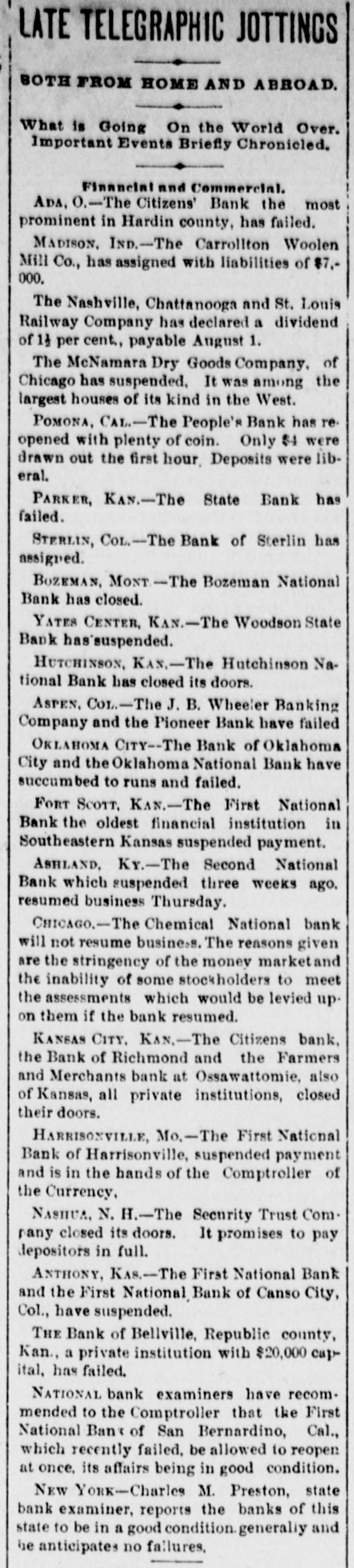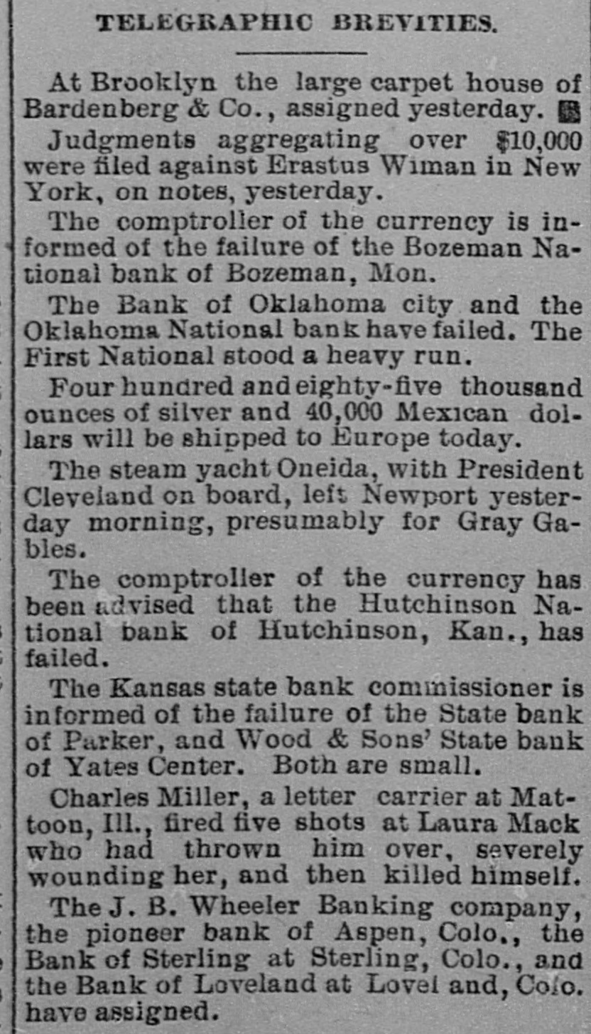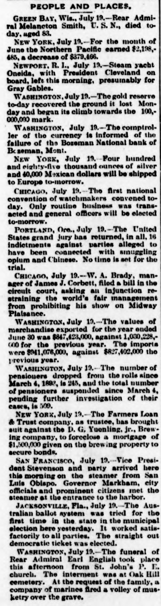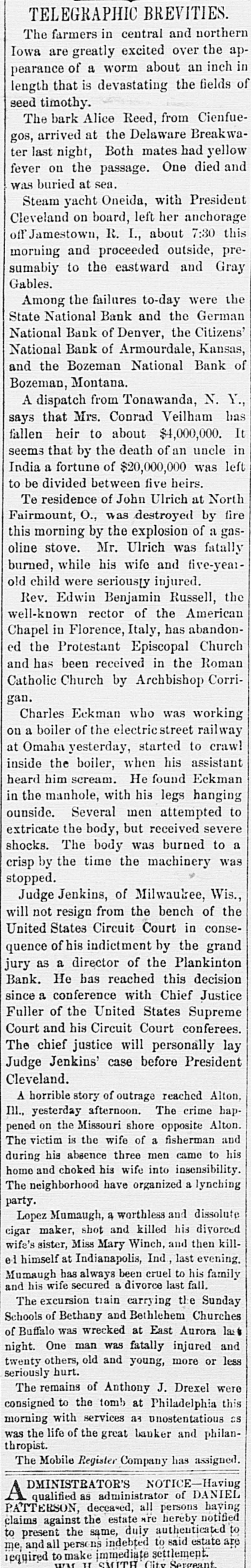 TELEGRAPHIC BREVITIES. The farmers in central and northern Iowa are greatly excited over the appearance of a worm about an inch in length that is devastating the fields of seed timothy. The bark Alice Reed, from Cienfuegos, arrived at the Delaware Breakwater last night, Both mates had yellow fever on the passage. One died and was buried at sea. Steam yacht Oneida, with President Cleveland on board, left her anchorage off Jamestown, R. I., about 7:30 this morning and proceeded outside, presumabiy to the eastward and Gray Gables. Among the failures to-day were the State National Bank and the German National Bank of Denver, the Citizens' National Bank of Armourdale, Kansas, and the Bozeman National Bank of Bozeman, Montana. A dispatch from Tonawanda, N. Y., says that Mrs. Conrad Veilham has fallen heir to about $4,000,000. It seems that by the death of an uncle in India a fortune of $20,000,000 was left to be divided between five heirs. Te residence of John Ulrich at North Fairmount, O., was destroyed by fire this morning by the explosion of a gasoline stove. Mr. Ulrich was fatally burned, while his wife and five-yearold child were seriously injured. Rev. Edwin Benjamin Russell, the well-known rector of the American Chapel in Florence, Italy, has abandoned the Protestant Episcopal Church and has been received in the Roman Catholic Church by Archbishop Corrigan. Charles Eckman who was working on a boiler of the electricstreet railway at Omaha yesterday, started to crawl inside the boiler, when his assistant heard him scream. He found Eckman in the manhole, with his legs hanging ounside. Several men attempted to extricate the body, but received severe shocks. The body was burned to a crisp by the time the machinery was stopped. Judge Jenkins, of Milwaukee, Wis., will not resign from the bench of the United States Circuit Court in consequence of his indictment by the grand jury as a director of the Plankinton Bank. He has reached this decision since a conference with Chief Justice Fuller of the United States Supreme Court and his Circuit Court conferees. The chief justice will personally lay Judge Jenkins' case before President Cleveland. A horrible story of outrage reached Alton, III., yesterday afternoon. The crime happened on the Missouri shore opposite Alton. The victim is the wife of a fisherman and during his absence three men came to his home and choked his wife into insensibility. The neighborhood have organized a lynching party. Lopez Mumaugh, a worthless and dissolute cigar maker, shot and killed his divorced wife's sister, Miss Mary Winch, and then killed himself at Indianapolis, Ind, last evening. Mumaugh has always been cruel to his family and his wife secured a divorce last fall. The excursion train carrying the Sunday Schools of Bethany and Bethlehem Churches of Buffalo was wrecked at East Aurora last night. One man was fatally injured and twenty others, old and young, more or less seriously hurt. The remains of Anthony J. Drexel were consigned to the tomb at Philadelphia this morning with services as unostentatious CS was the life of the great banker and philanthropist. The Mobile Register Company has assigned. DDINISTRATOR'S NOTICE-Having A qualified as administrator of DANIEL PATTERSON, deceased, all persons having claims against the estate are hereby notified to to me, are present and all persons the same, immediate indebted duty settlement. to authenticated said estate required to make was SMITH City Sergeant