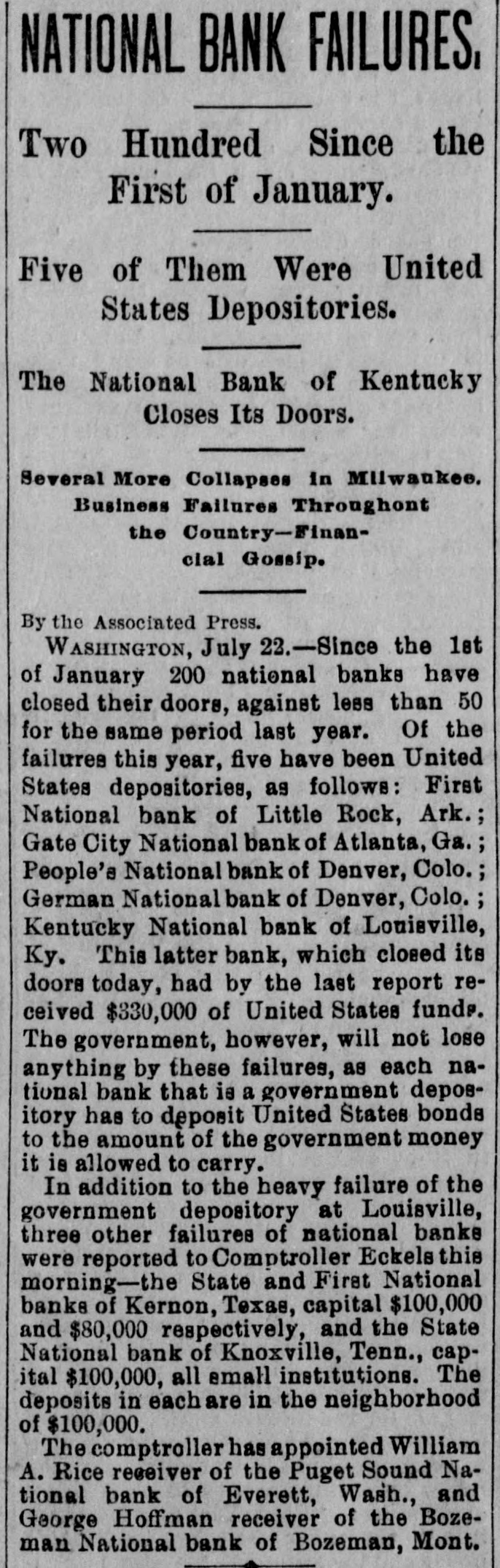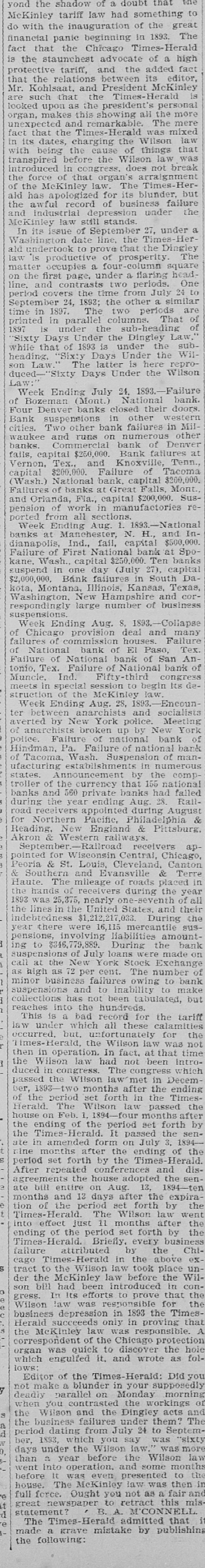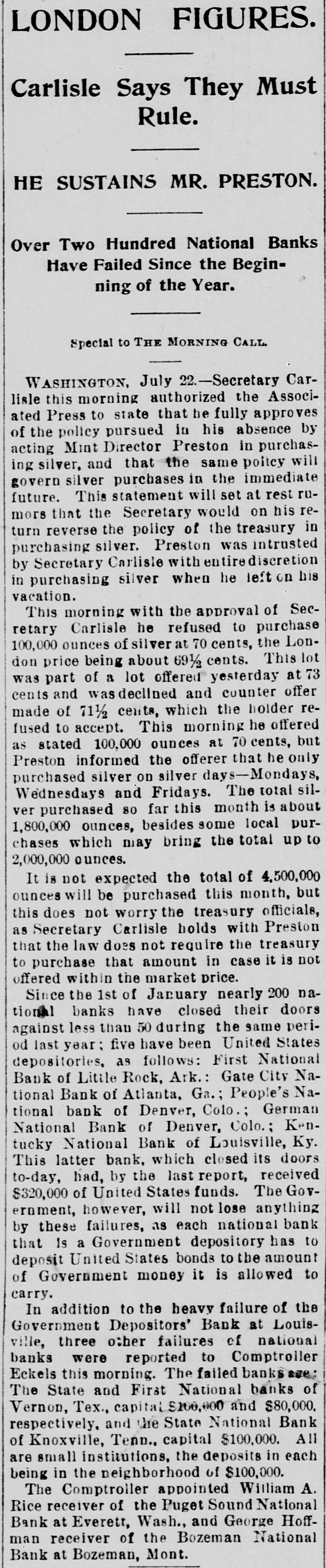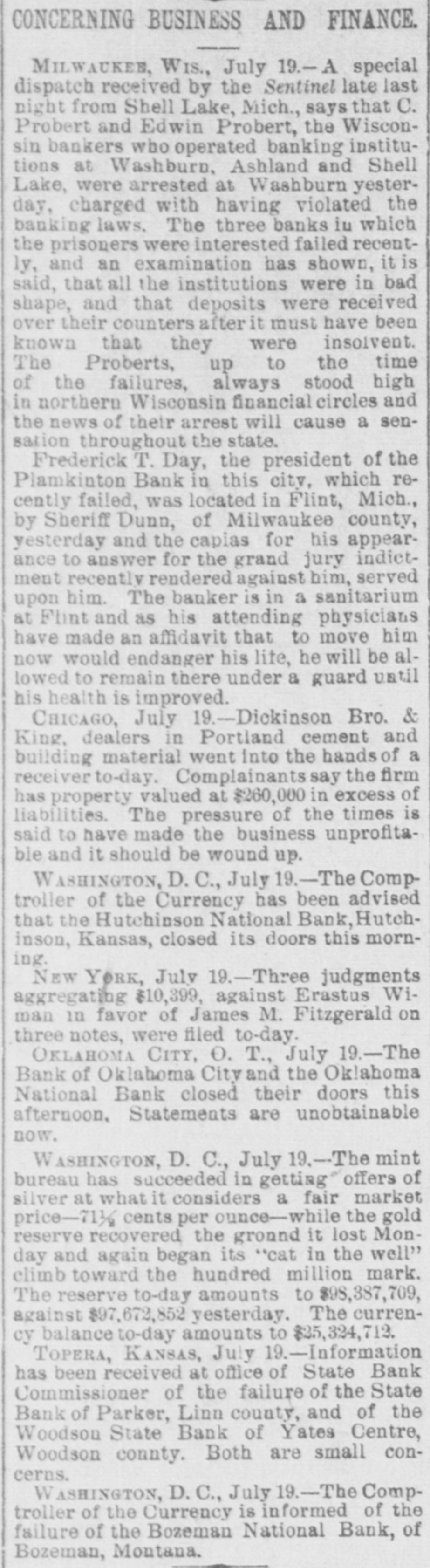 TELEGRAPHIC BREVITIES. The farmers in central and northern Iowa are greatly excited over the appearance of a worm about an inch in length that is devastating the fields of seed timothy. The bark Alice Reed, from Cienfuegos, arrived at the Delaware Breakwater last night, Both mates had yellow fever on the passage. One died and was buried at sea. Steam yacht Oneida, with President Cleveland on board, left her anchorage off Jamestown, R. I., about 7:30 this morning and proceeded outside, presumabiy to the eastward and Gray Gables. Among the failures to-day were the State National Bank and the German National Bank of Denver, the Citizens' National Bank of Armourdale, Kansas, and the Bozeman National Bank of Bozeman, Montana. A dispatch from Tonawanda, N. Y., says that Mrs. Conrad Veilham has fallen heir to about $4,000,000. It seems that by the death of an uncle in India a fortune of $20,000,000 was left to be divided between five heirs. Te residence of John Ulrich at North Fairmount, O., was destroyed by fire this morning by the explosion of a gasoline stove. Mr. Ulrich was fatally burned, while his wife and five-yearold child were seriously injured. Rev. Edwin Benjamin Russell, the well-known rector of the American Chapel in Florence, Italy, has abandoned the Protestant Episcopal Church and has been received in the Roman Catholic Church by Archbishop Corrigan. Charles Eckman who was working on a boiler of the electricstreet railway at Omaha yesterday, started to crawl inside the boiler, when his assistant heard him scream. He found Eckman in the manhole, with his legs hanging ounside. Several men attempted to extricate the body, but received severe shocks. The body was burned to a crisp by the time the machinery was stopped. Judge Jenkins, of Milwaukee, Wis., will not resign from the bench of the United States Circuit Court in consequence of his indictment by the grand jury as a director of the Plankinton Bank. He has reached this decision since a conference with Chief Justice Fuller of the United States Supreme Court and his Circuit Court conferees. The chief justice will personally lay Judge Jenkins' case before President Cleveland. A horrible story of outrage reached Alton, III., yesterday afternoon. The crime happened on the Missouri shore opposite Alton. The victim is the wife of a fisherman and during his absence three men came to his home and choked his wife into insensibility. The neighborhood have organized a lynching party. Lopez Mumaugh, a worthless and dissolute cigar maker, shot and killed his divorced wife's sister, Miss Mary Winch, and then killed himself at Indianapolis, Ind, last evening. Mumaugh has always been cruel to his family and his wife secured a divorce last fall. The excursion train carrying the Sunday Schools of Bethany and Bethlehem Churches of Buffalo was wrecked at East Aurora last night. One man was fatally injured and twenty others, old and young, more or less seriously hurt. The remains of Anthony J. Drexel were consigned to the tomb at Philadelphia this morning with services as unostentatious CS was the life of the great banker and philanthropist. The Mobile Register Company has assigned. DDINISTRATOR'S NOTICE-Having A qualified as administrator of DANIEL PATTERSON, deceased, all persons having claims against the estate are hereby notified to to me, are present and all persons the same, immediate indebted duty settlement. to authenticated said estate required to make was SMITH City Sergeant