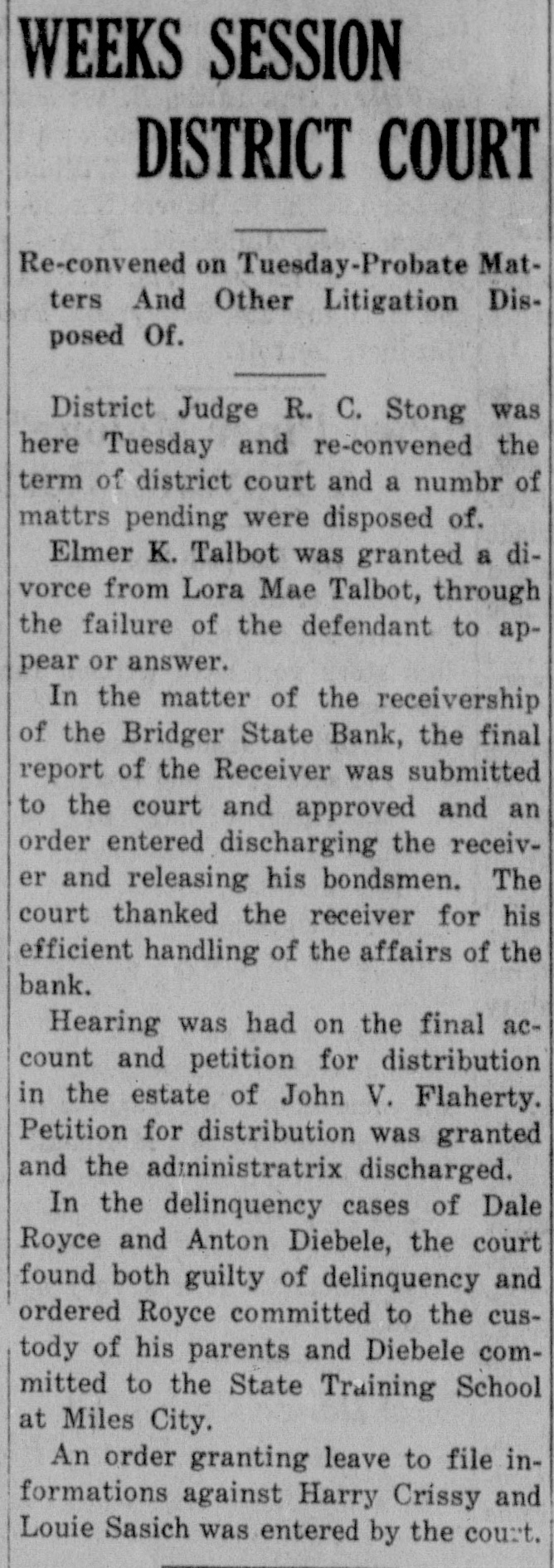 WEEKS SESSION DISTRICT COURT Re-convened on Tuesday-Probate Matters And Other Litigation Disposed Of. District Judge R. C. Stong was here Tuesday and re-convened the term of district court and a numbr of mattrs pending were disposed of. Elmer K. Talbot was granted a divorce from Lora Mae Talbot, through the failure of the defendant to appear or answer. In the matter of the receivership of the Bridger State Bank, the final report of the Receiver was submitted to the court and approved and an order entered discharging the receiver and releasing his bondsmen. The court thanked the receiver for his efficient handling of the affairs of the bank. Hearing was had on the final account and petition for distribution in the estate of John V. Flaherty. Petition for distribution was granted and the ad:ninistratrix discharged. In the delinquency cases of Dale Royce and Anton Diebele, the court found both guilty of delinquency and ordered Royce committed to the custody of his parents and Diebele committed to the State Training School at Miles City. An order granting leave to file informations against Harry Crissy and Louie Sasich was entered by the court.