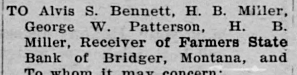 TO Alvis S. Bennett, H. B. Miller, George W. Patterson, H. B. Miller, Receiver of Farmers State Bank of Bridger, Montana, and To whom it may concern: