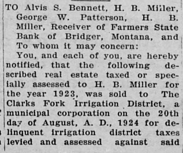 TO Alvis S. Bennett, H. B. Miller, George W. Patterson, H. B. Miller, Receiver of Farmers State Bank of Bridger, Montana, and To whom it may concern: You, and each of you, are hereby notified, that the following described real estate taxed or specially assessed to H. B. Miller for the year 1923, was sold to The Clarks Fork Irrigation District, a municipal corporation on the 20th day of August, A. D., 1924 for delinquent irrigation district taxes levied and assessed against said