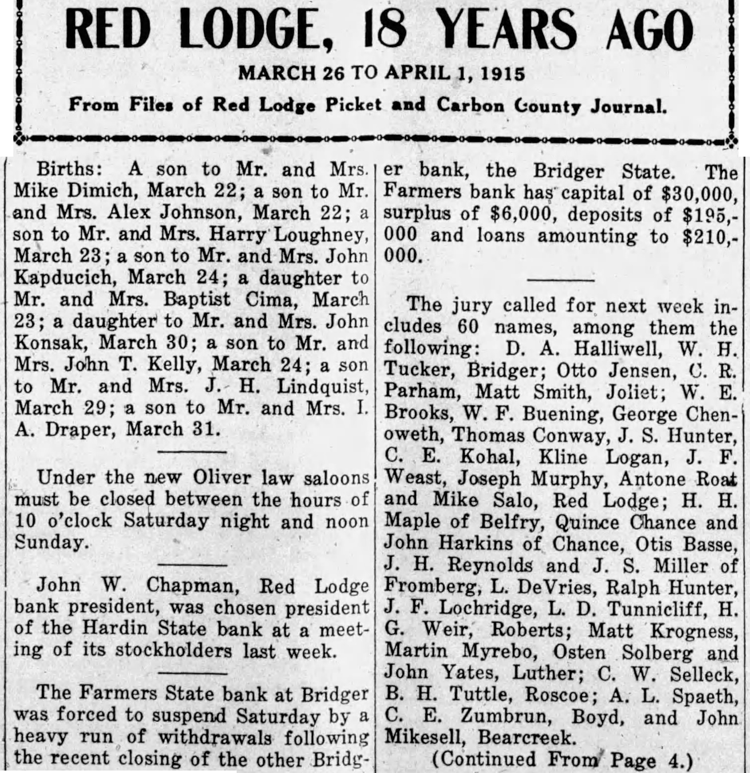 RED LODGE, 18 YEARS TO From Files of Red Picket and Carbon County Journal. Births: A son to Mr. and Mike Dimich, March to and Mrs. Alex Johnson, March to Mr. and Mrs. Harry Loughney, March to Mr. and Mrs. John Kapducich, March 24; daughter Mr. and Mrs. Baptist Cima, March daughter to Mr. and Mrs. John Konsak, March son to Mr. and Mrs. John Kelly, March to Mr. and Mrs. H. Lindquist, March 29; son to Mr. and Mrs. Draper, March 31. Under the new Oliver law saloons must be closed between the hours 10 o'clock Saturday night and noon Sunday. John W. Chapman, Red Lodge bank president, was chosen president of the Hardin State bank at of its stockholders last week. The Farmers State bank at Bridger forced to suspend Saturday heavy run of withdrawals following the recent closing of the other bank, the Bridger State. The Farmers bank has capital of surplus of $6,000, deposits of 000 and loans to amounting $210,000. The jury called for next week cludes 60 names, them among following: Halliwell, Tucker, Bridger; Otto Jensen, Parham, Matt Smith, Joliet; Brooks, Buening, George Chenoweth, Thomas Conway, Hunter, Kohal, Kline Logan, Weast, Joseph Murphy, Antone Roat and Mike Salo, Red H. Lodge; Maple of Belfry, Quince Chance and John Harkins of Chance, Otis Basse, Reynolds and Miller Fromberg, Ralph Hunter, Lochridge, Weir, Roberts; Matt Krogness, Martin Myrebo, Osten and Solberg John Yates, Luther; C. W. Selleck, Tuttle, Roscoe; Spaeth, Zumbrun, Boyd, and John Mikesell, Bearcreek. (Continued From Page
