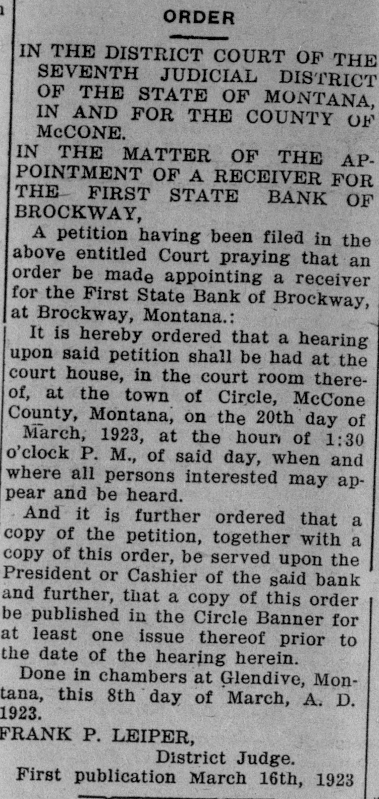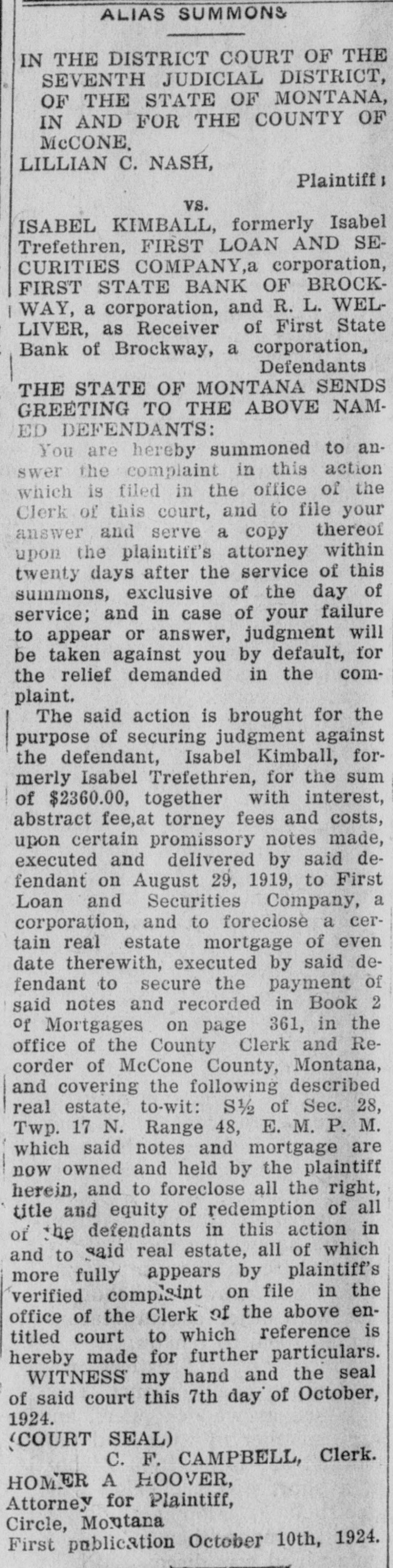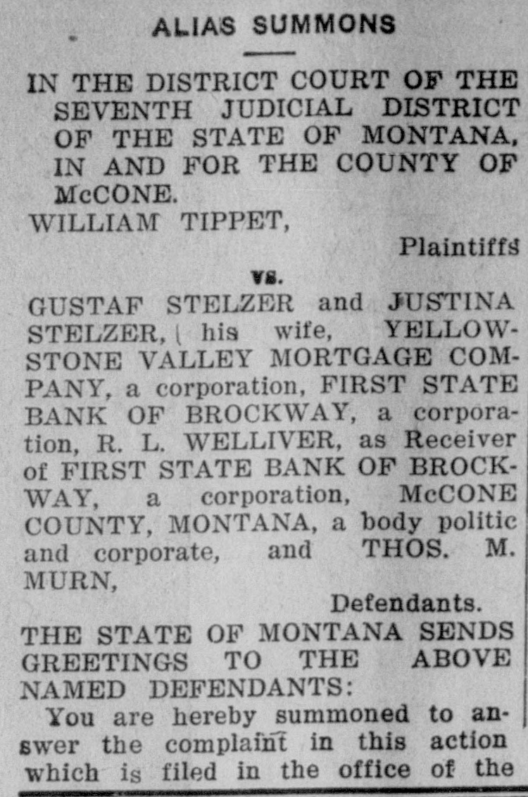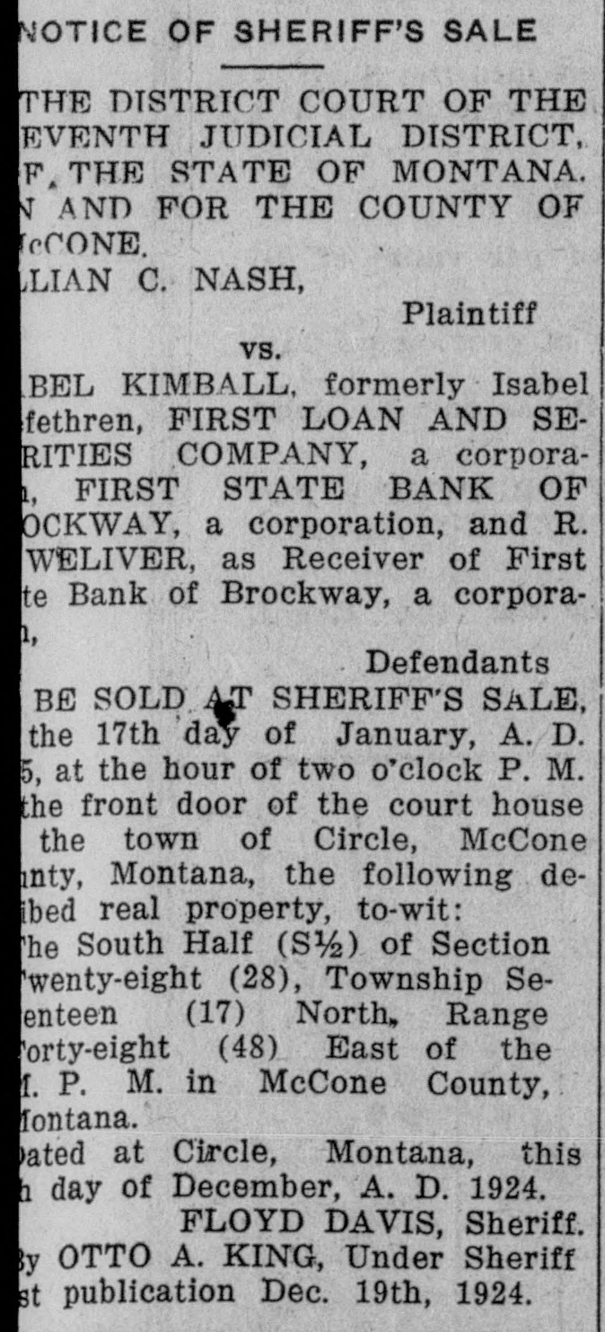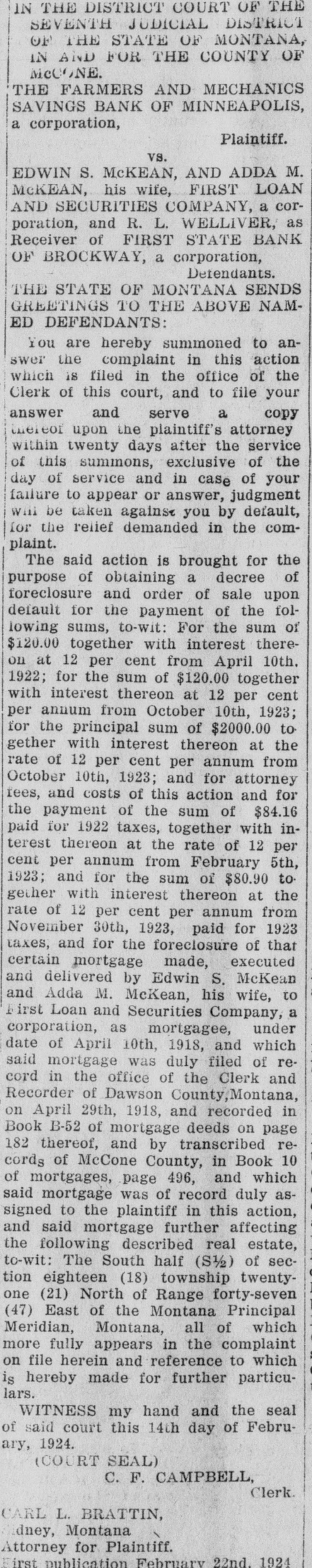 IN THE DISTRICT COURT OF THE SEVENTH JUDICIAL DISTRICT OF THE STATE OF MONTANA, IN AND FOR THE COUNTY OF MCCONE.