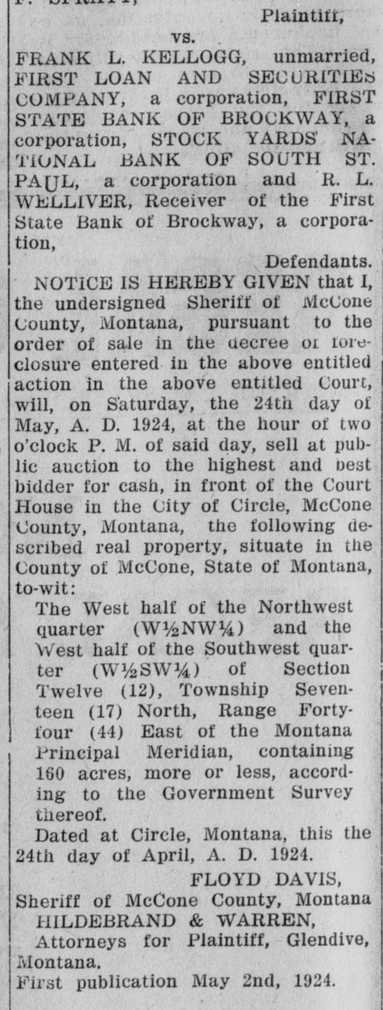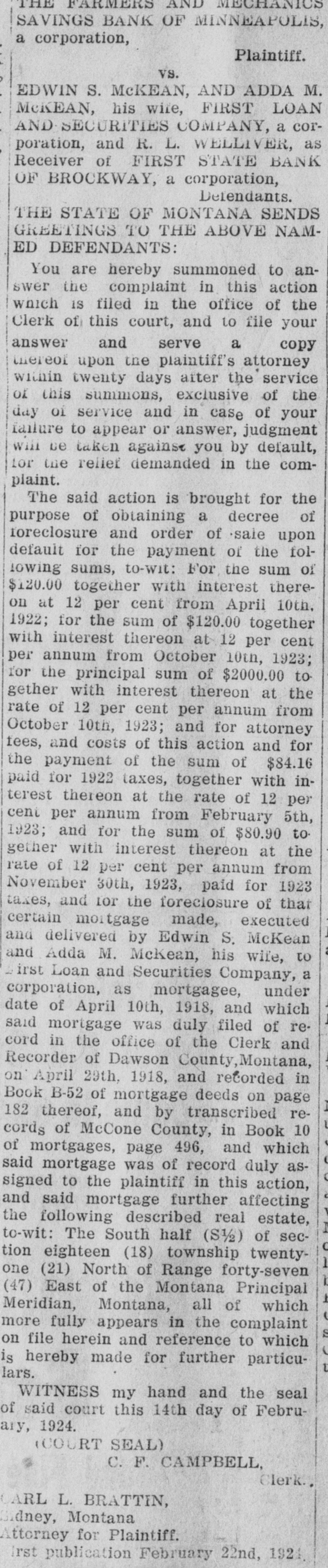 The said action is brought for the purpose of obtaining a decree of foreclosure and order of sale upon default for the payment of the following sums, to-wit: For the sum of $120.00 together with interest thereon at 12 per cent from April 10th, 1922; for the sum of $120.00 together with interest thereon at 12 per cent per annum from October 10th, 1923; for the principal sum of $2000.00 together with interest thereon at the rate of 12 per cent per annum from October 10th, 1923; and for attorney fees, and costs of this action and for the payment of the sum of $84.16 paid for 1922 taxes, together with interest thereon at the rate of 12 per cent per annum from February 5th, 1923; and for the sum of $80.90 together with interest thereon at the rate of 12 per cent per annum from November 30th, 1923, paid for 1923 taxes, and for the foreclosure of that certain mortgage made, executed and delivered by Edwin S. McKean and Adda M. McKean, his wife, to First Loan and Securities Company, a corporation, as mortgagee, under date of April 10th, 1918, and which said mortgage was duly filed of record in the office of the Clerk and Recorder of Dawson County, Montana, on April 29th, 1918, and recorded in Book B-52 of mortgage deeds on page 182 thereof, and by transcribed records of McCone County, in Book 10 of mortgages, page 496, and which said mortgage was of record duly assigned to the plaintiff in this action, and said mortgage further affecting the following described real estate, to-wit: The South half (S½) of section eighteen (18) township twenty-one (21) North of Range forty-seven (47) East of the Montana Principal Meridian, Montana, all of which more fully appears in the complaint on file herein and reference to which is hereby made for further particulars.