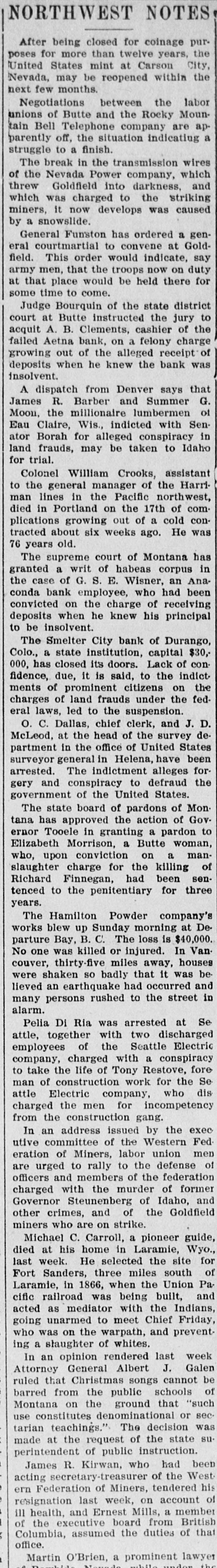 NORTHWEST After being closed for coinage poses for more than twelve years, United States mint at Carson Nevada, may be reopened within next few months. Negotiations between the unions of Butte and the Rocky tain Bell Telephone company are parently off, the situation indicating struggle to a finish. The break in the transmission wire of the Nevada Power company, whic threw Goldfield into darkness, which was charged to the strikin miners, it now develops was by a snowslide. General Funston has ordered a eral courtmartial to convene at field. This order would indicate, army men, that the troops now on at that place would be held there some time to come. Judge Bourquin of the state distric court at Butte instructed the jury acquit A. B. Clements, cashier of failed Aetna bank, on a felony charg growing out of the alleged receipt deposits when he knew the bank insolvent. A dispatch from Denver says tha James R. Barber and Summer Moon. the millionaire lumbermen Eau Claire, Wis., indicted with ator Borah for alleged conspiracy land frauds, may be taken to for trial. Colonel William Crooks, assistan to the general manager of the man lines in the Pacific northwes died in Portland on the 17th of plications growing out of a cold tracted about six weeks ago. He 76 years old. The supreme court of Montana granted a writ of habeas corpus the case of G. S. E. Wisner, an conda bank employee, who had convicted on the charge of receivin deposits when he knew his principa to be insolvent. The Smelter City bank of Durange Colo., a state institution, capital 000, has closed its doors. Lack of fidence, due, it is said, to the indic ments of prominent citizens on charges of land frauds under the eral laws, led to the suspension. O. C. Dallas, chief clerk, and J. McLeod, at the head of the survey partment in the office of United State surveyor general in Helena, have arrested. The indictment alleges fo gery and conspiracy to defraud government of the United States. The state board of pardons of tana has approved the action of ernor Tooele in granting a pardon Elizabeth Morrison, a Butte woman who, upon conviction on a slaughter charge for the killing Richard Finnegan, had been tenced to the penitentiary for thre years. The Hamilton Powder company works blew up Sunday morning at parture Bay, B. C. The loss is $40,00 No one was killed or injured. In couver, thirty-five miles away, house were shaken SO badly that it was lieved an earthquake had occurred many persons rushed to the street