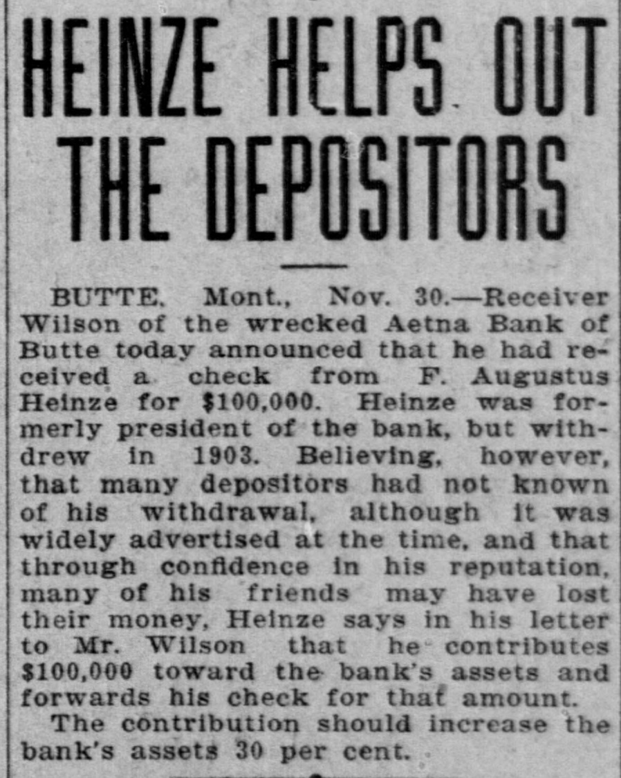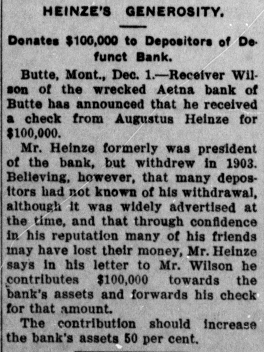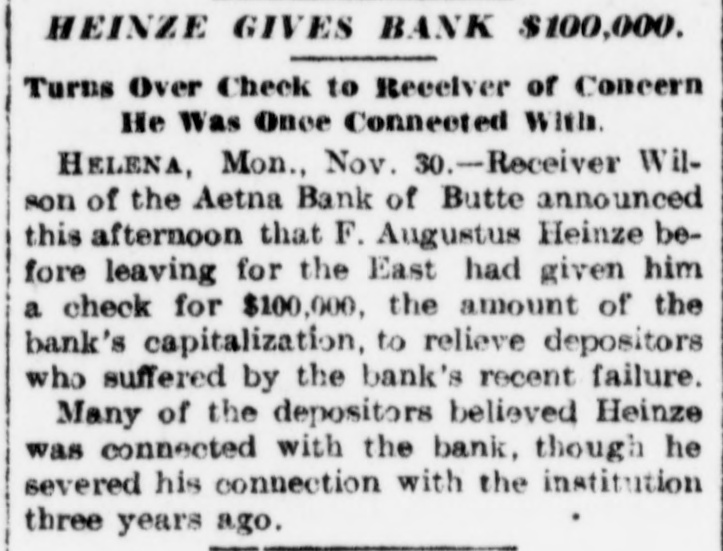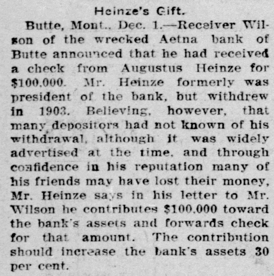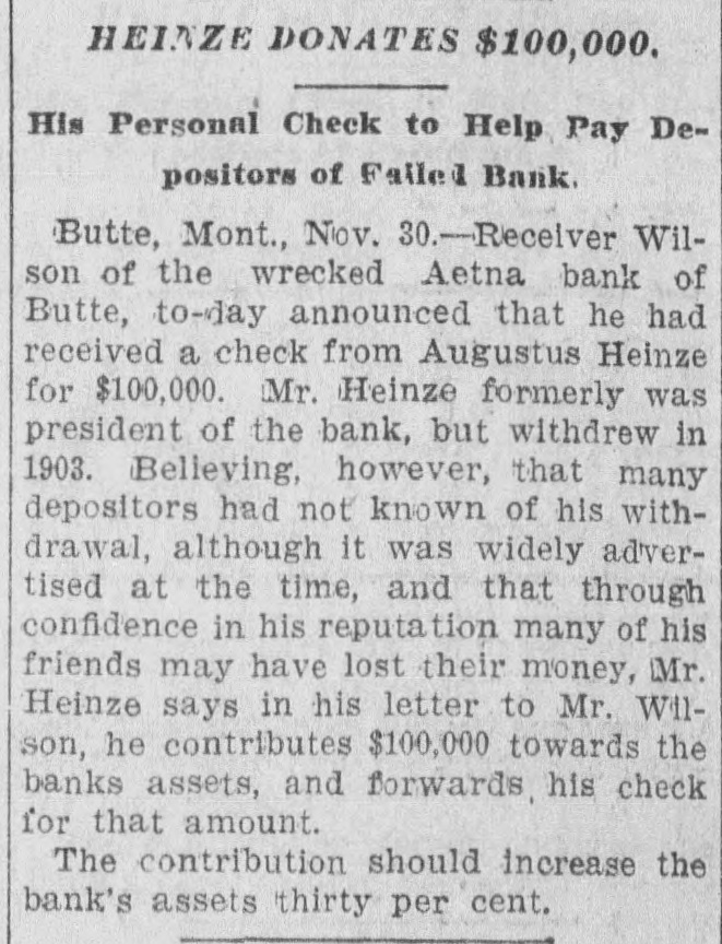 HEINZE GIVES BANK $100,000. Turns Over Check to Receiver of Concern He Was Once Connected With HELENA, Mon., Nov. 30.- Receiver Wilson of the Aetna Bank of Butte announced this afternoon that F. Augustus Heinze before leaving for the East had given him a check for $100,000, the amount of the bank's capitalization, to relieve depositors who suffered by the bank's recent failure. Many of the depositors believed Heinze was connected with the bank, though he severed his connection with the institution three years ago.