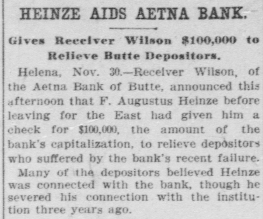 HEINZE AIDS AETNA BANK. Gives Receiver Wilson $100,000 to Relieve Butte Depositors. Helena, Nov. 30.-Receiver Wilson, of the Aetna Bank of Butte, announced this afternoon that F. Augustus Heinze before leaving for the East had given him a check for $100,000, the amount of the bank's capitalization, to relieve depositors who suffered by the bank's recent failure. Many of the depositors believed Heinze was connected with the bank, though he severed his connection with the institution three years ago.