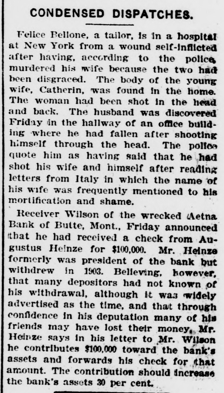 CONDENSED DISPATCHES. Felice Bellone, a tailor, is in a hospital at New York from a wound self-inflicted after having, according to the police murdered his wife because the two had been disgraced. The body of the young wife, Catherin, was found in the home. The woman had been shot in the head and back. The husband was discovered Friday in the hallway of an office building where he had fallen after shooting himself through the head. The pollee quote him as having said that he had shot his wife and himself after reading letters from Italy in which the name of his wife was frequently mentioned to his mortification and shame. Receiver Wilson of the wrecked Aetna Bank of Butte, Mont., Friday announced that he had received a check from Augustus Heinze for $100,000. Mr. Heinze formerly was president of the bank but withdrew in 1903. Believing, however, that many depositors had not known of his withdrawal, although It was widely advertised as the time, and that through confidence in his deputation many of his friends may have lost their money, Mr. Heinze says in his letter to Mr. Wilson he contributes $100,000 toward the bank's assets and forwards his check for that amount. The contribution should increase the bank's assets 30 per cent.