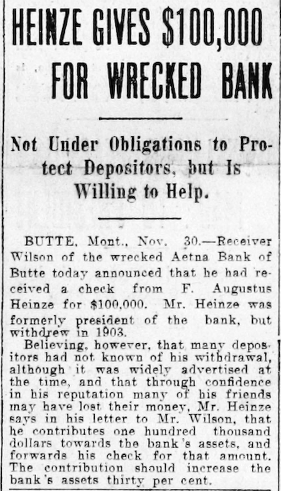 HEINZE GIVES $100,000 FOR WRECKED BANK Not Under Obligations to Protect Depositors, but Is Willing to Help. BUTTE. Mont., Nov. 30.-Receiver Wilson of the wrecked Aetna Bank of Butte today announced that he had received a check from F. Augustus Heinze for $100,000. Mr. Heinze was formerly president of the bank, but withdrew in 1903. Believing, however, that many depositors had not known of his withdrawal, although it was widely advertised at the time, and that through confidence in his reputation many of his friends may have lost their money, Mr. Heinze says in his letter to Mr. Wilson, that he contributes one hundred thousand dollars towards the bank's assets, and forwards his check for that amount. The contribution should increase the bank's assets thirty per cent.