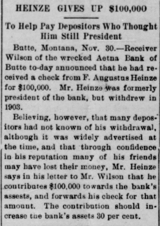 HEINZE GIVES UP $100,000 To Help Pay Depositors Who Thought Him Still President Butte, Montana, Nov. 30.-Receiver Wilson of the wrecked Aetna Bank of Butte to-day announced that he had received a check from F. Augustus Heinze for $100,000. Mr. Heinze was formerly president of the bank, but withdrew in 1903. Believing, however, that many depositors had not known of his withdrawal, although it was widely advertised at the time, and that through confidence in his reputation many of his friends may have lost their money, Mr. Heinze says in his letter to Mr. Wilson that he contributes $100,000 towards the bank's assests, and forwards his check for that amount. The contribution should increase the bank's assets 30 per cent.
