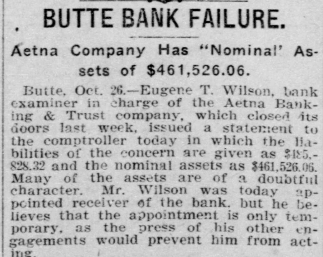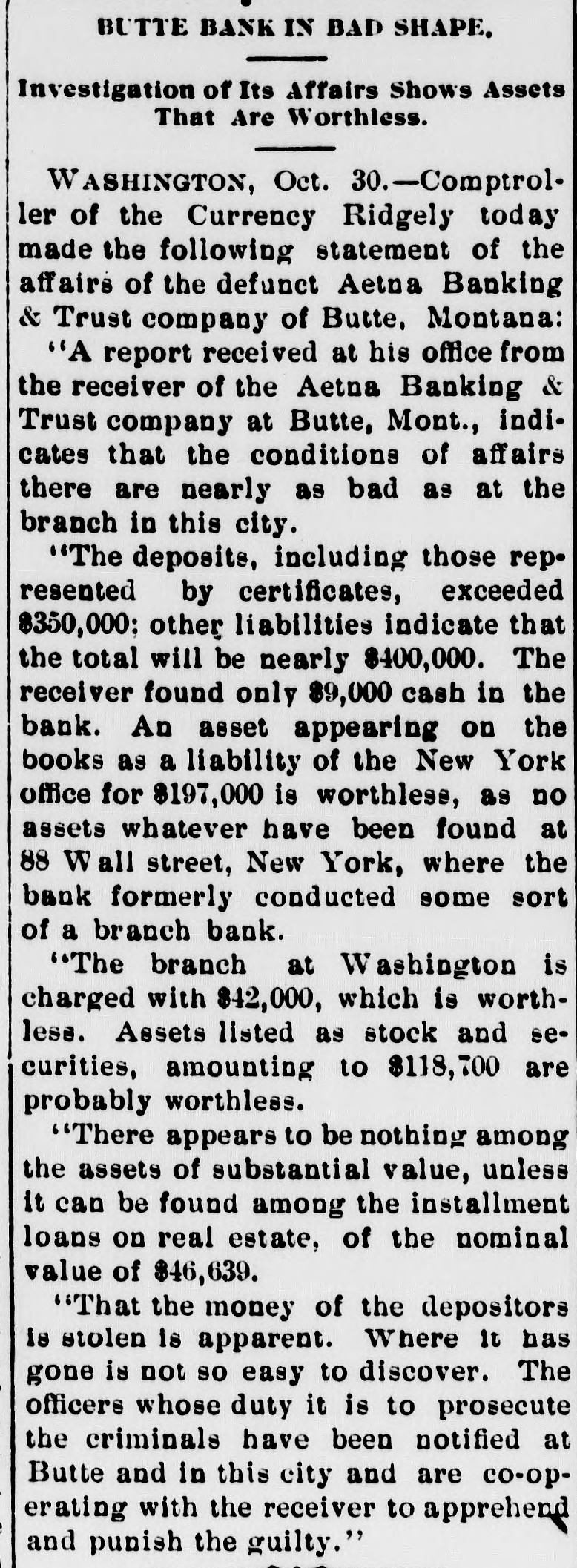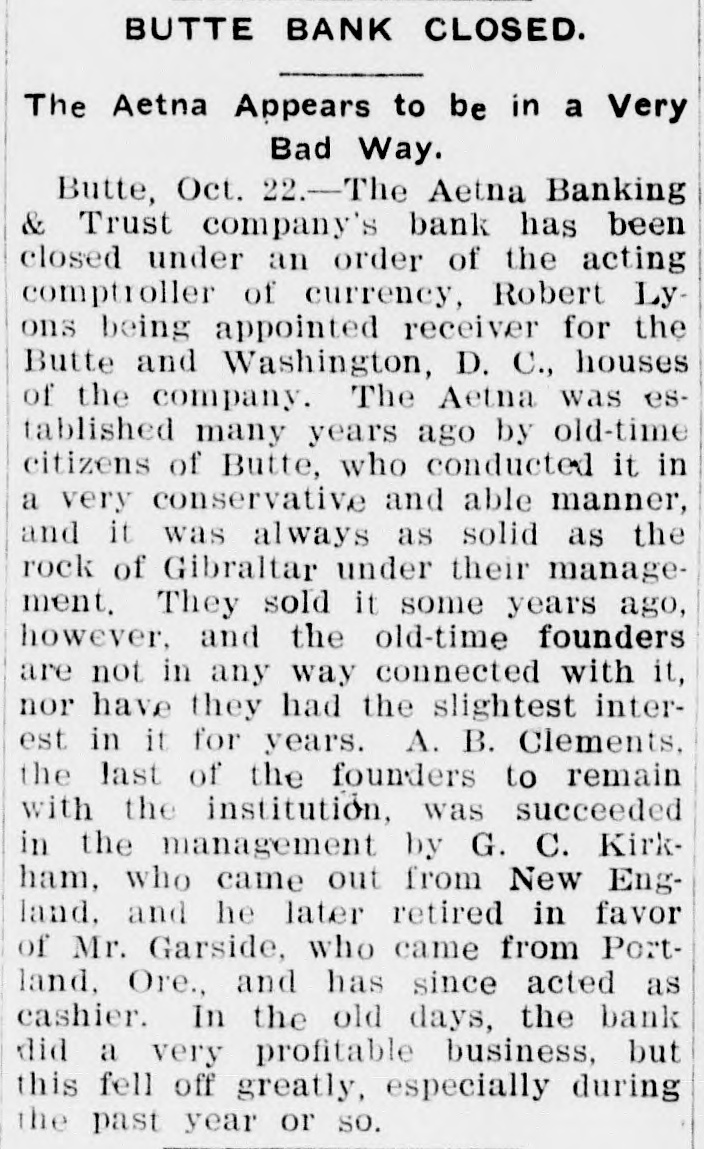 BUTTE BANK CLOSED. The Aetna Appears to be in a Very Bad Way. Butte, Oct. 22.-The Aetna Banking & Trust company's bank has been closed under an order of the acting comptroller of currency, Robert Lyons being appointed receiver for the Butte and Washington, D. C., houses of the company. The Aetna was established many years ago by old-time citizens of Butte, who conducted it in a very conservative and able manner, and it was always as solid as the rock of Gibraltar under their management. They sold it some years ago, however, and the old-time founders are not in any way connected with it, nor have they had the slightest interest in it for years. A. B. Clements, the last of the founders to remain with the institution, was succeeded in the management by G. C. Kirkham, who came out from New England. and he later retired in favor of Mr. Garside, who came from Portland, Ore., and has since acted as cashier. In the old days, the bank did a very profitable business, but this fell off greatly, especially during the past year or so.