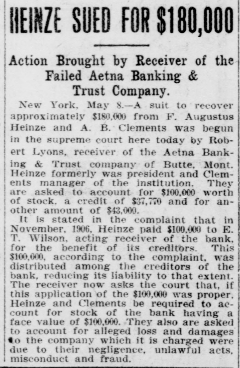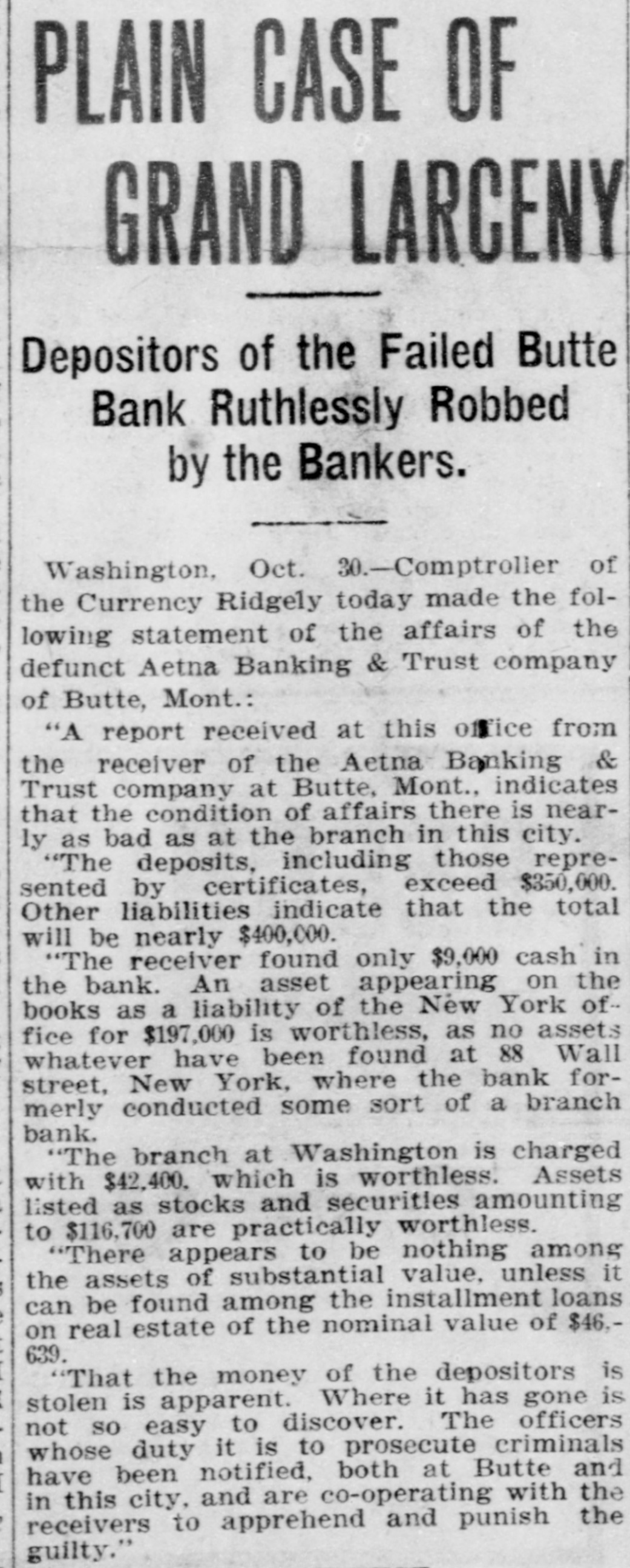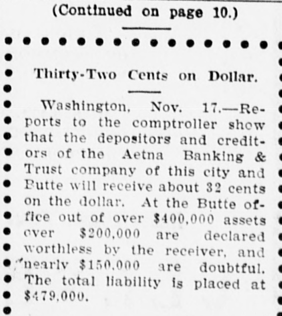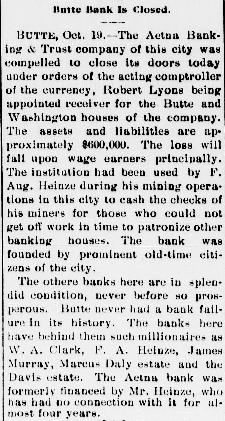 BUTTE BANK CLOSED. The Aetna Appears to be in a Very Bad Way. Butte, Oct. 22.-The Aetna Banking & Trust company's bank has been closed under an order of the acting comptroller of currency, Robert Lyons being appointed receiver for the Butte and Washington, D. C., houses of the company. The Aetna was established many years ago by old-time citizens of Butte, who conducted it in a very conservative and able manner, and it was always as solid as the rock of Gibraltar under their management. They sold it some years ago, however, and the old-time founders are not in any way connected with it, nor have they had the slightest interest in it for years. A. B. Clements, the last of the founders to remain with the institution, was succeeded in the management by G. C. Kirkham, who came out from New England. and he later retired in favor of Mr. Garside, who came from Portland, Ore., and has since acted as cashier. In the old days, the bank did a very profitable business, but this fell off greatly, especially during the past year or so.