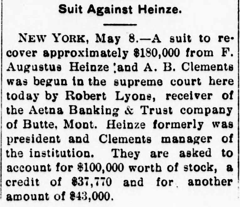 Suit Against Heinze. NEW YORK, May 8.-A suit to recover approximately $180,000 from F. Augustus Heinze :and A. B. Clements was begun in the supreme court here today by Robert Lyone, receiver of the Aetna Banking & Trust company of Butte. Mont. Heinze formerly was president and Clements manager of the institution. They are asked to account for $100,000 worth of stock, a credit of $37,770 and for another amount of 843,000.