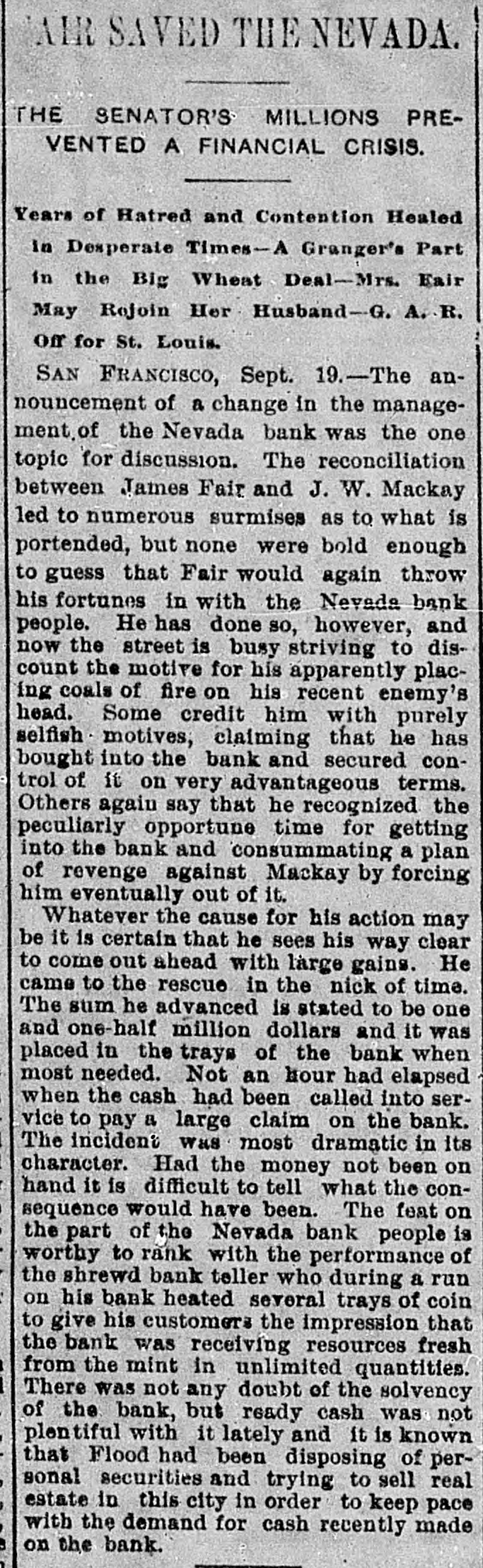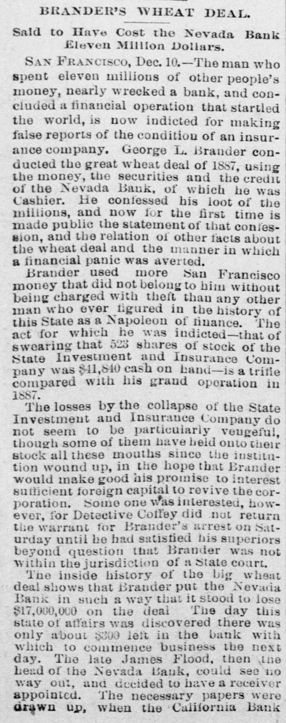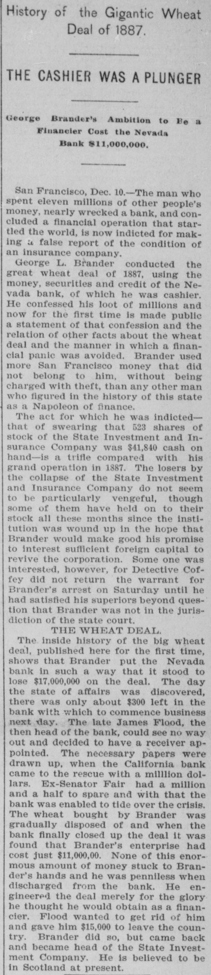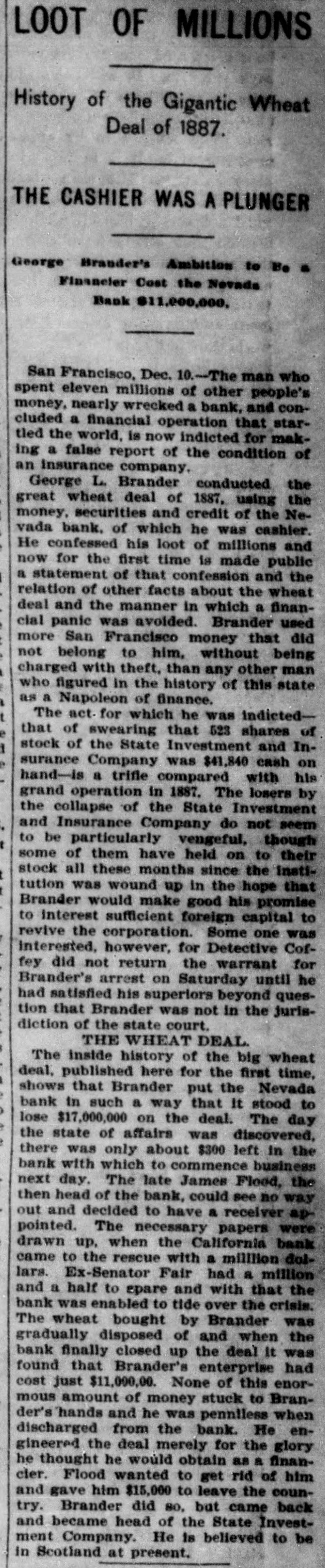 VAULTING AMBITION TO CORNER ALL THE WHEAT THERE WAS IN SIGHT Brings the 'Frisco Syndicate to a Very Deep Hole-The Nevada Bank in for $6,500,000, and the Syndicate Loses $7,500,000-National Bank Failure-Pope's Liabilities-A Fidelity Suit. SAN FRANCISCO, Sept. 17.-William Dresbach's statement of liabilities and assets, filed Friday, shows that the Nevada bank is a creditor for $550,000 on promissory notes and $6,000,000 guaranteed by Charles F. Reed. The bank is tbus shown to have advanced $6,500,000 to the wheat bull clique. Reed is a farmer and large land owner of Yolo county, and a brother of Mrs. Paran Stevens, of New York. He has other wealthy relatives, but it is not known how he satisfied the bank. The amount of cash on hand is $978. Among the assets are enormous amounts due from London and Liverpool consignees of wheat, but they merely present grain in transit. Rosenfelt's liability on joint account is $107,000. The total unsecured debts are $7,500,000, and this sum practically depresents the loss by the wheat deal. Mackay and Flood sold eight large valuable lots Friday afternoon. There are rumors that Flood has even placed his new brown stone Nob Hill mansion in the market, as well as Menlo park. Fair has advanced $1,500,000 to rescue the bank. Suit Against a Fidelity Stockholder. CINCINNATI, Sept. 17.-Suit was filed by the receiver of the Fidelity National bank, David Armstrong, through District Attorney Burnet and E. W. Kittredge, at 1:15 P. m., Friday, against William Wood for the payment of his subscription of $13,500 by note on the second $1,000,000 of stock. The Fidelity bank had advertised to increase its capital from $1,000,000 to $2,000,000, and by a vote of its directors resolved to increase it to that amount, but in doing so did not strictly follow the statute. The subscribers to the increase were given the privilege of paying in cash or note. This suit is brought to test the validity of the issue of the second million, it being claimed to be invalid because of the alleged irregularity and non-compliance with the statute. Failure of 24 National Bank. ERIE, Pa., Sept. 17.-The First National bank of Corry, Pa., closed its doors Tuesday morning by order of Bank Examiner Young. Thursday it was announced that the bank had purchased the Clark & Warren Independent Oil refinery for $133,000, property now said to have been taken to secure loans. Liabilities not stated. The Pope Failure Growing Worse. NEW YORK, Sept. 17.-The failure of T. J. Pope & Bros., iron merchants, proves more extensive than at first reported. The liabilities are now placed at $800,000. The assignee asserts that from 75 to 100 per cent. can be realized.
