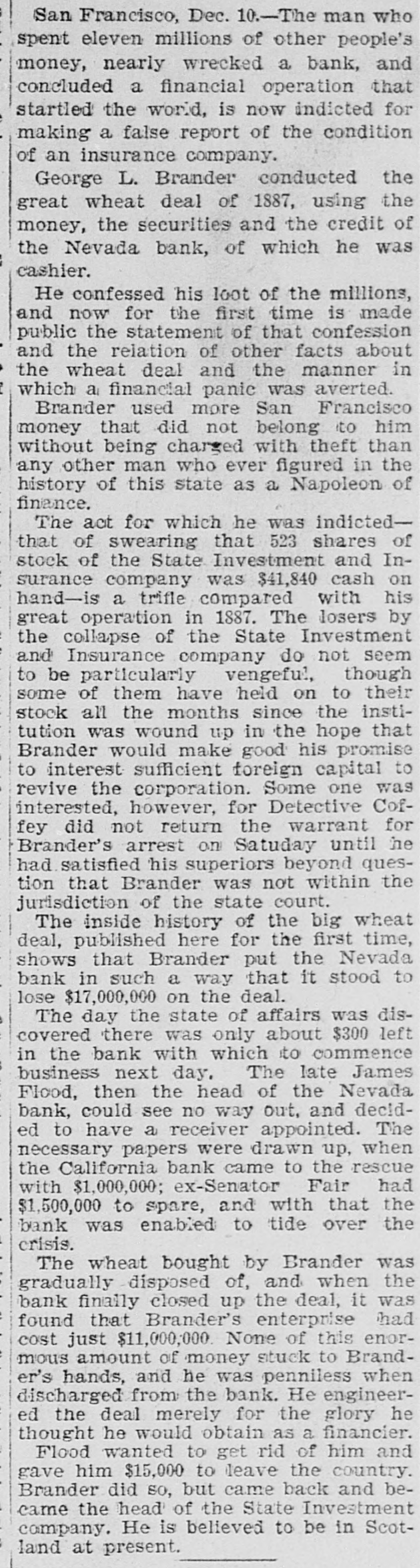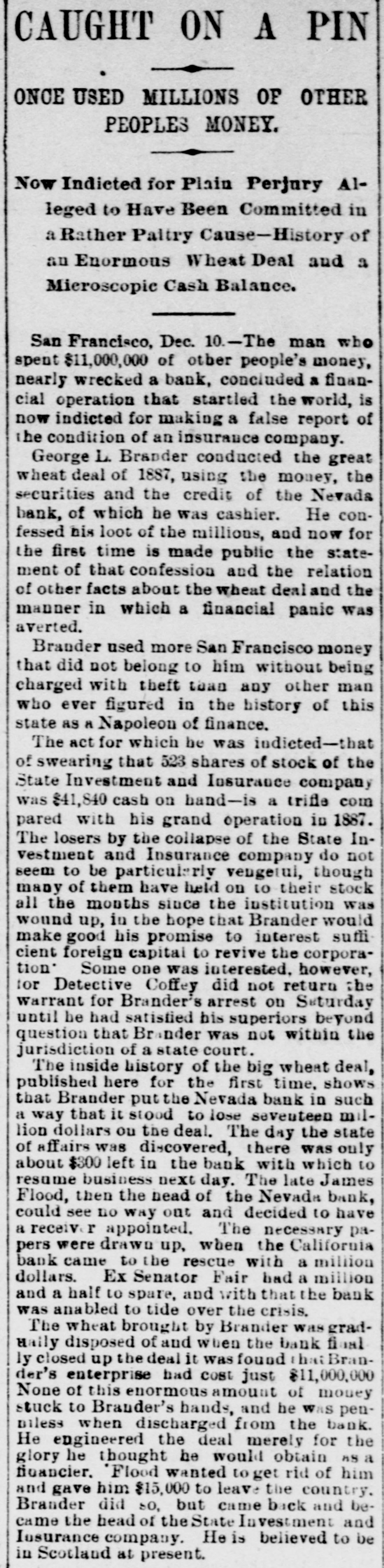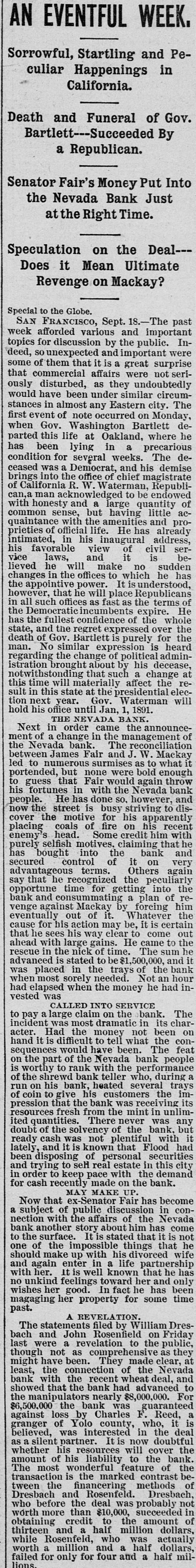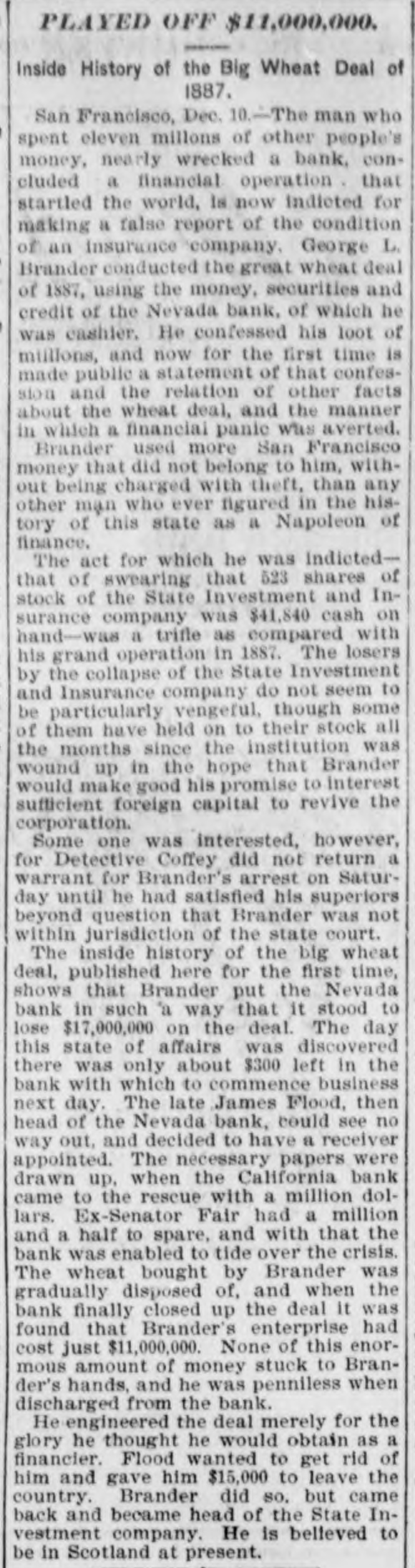 VAULTING AMBITION TO CORNER ALL THE WHEAT THERE WAS IN SIGHT Brings the 'Frisco Syndicate to a Very Deep Hole-The Nevada Bank in for $6,500,000, and the Syndicate Loses $7,500,000-National Bank Failure-Pope's Liabilities-A Fidelity Suit. SAN FRANCISCO, Sept. 17.-William Dresbach's statement of liabilities and assets, filed Friday, shows that the Nevada bank is a creditor for $550,000 on promissory notes and $6,000,000 guaranteed by Charles F. Reed. The bank is tbus shown to have advanced $6,500,000 to the wheat bull clique. Reed is a farmer and large land owner of Yolo county, and a brother of Mrs. Paran Stevens, of New York. He has other wealthy relatives, but it is not known how he satisfied the bank. The amount of cash on hand is $978. Among the assets are enormous amounts due from London and Liverpool consignees of wheat, but they merely present grain in transit. Rosenfelt's liability on joint account is $107,000. The total unsecured debts are $7,500,000, and this sum practically depresents the loss by the wheat deal. Mackay and Flood sold eight large valuable lots Friday afternoon. There are rumors that Flood has even placed his new brown stone Nob Hill mansion in the market, as well as Menlo park. Fair has advanced $1,500,000 to rescue the bank. Suit Against a Fidelity Stockholder. CINCINNATI, Sept. 17.-Suit was filed by the receiver of the Fidelity National bank, David Armstrong, through District Attorney Burnet and E. W. Kittredge, at 1:15 P. m., Friday, against William Wood for the payment of his subscription of $13,500 by note on the second $1,000,000 of stock. The Fidelity bank had advertised to increase its capital from $1,000,000 to $2,000,000, and by a vote of its directors resolved to increase it to that amount, but in doing so did not strictly follow the statute. The subscribers to the increase were given the privilege of paying in cash or note. This suit is brought to test the validity of the issue of the second million, it being claimed to be invalid because of the alleged irregularity and non-compliance with the statute. Failure of 24 National Bank. ERIE, Pa., Sept. 17.-The First National bank of Corry, Pa., closed its doors Tuesday morning by order of Bank Examiner Young. Thursday it was announced that the bank had purchased the Clark & Warren Independent Oil refinery for $133,000, property now said to have been taken to secure loans. Liabilities not stated. The Pope Failure Growing Worse. NEW YORK, Sept. 17.-The failure of T. J. Pope & Bros., iron merchants, proves more extensive than at first reported. The liabilities are now placed at $800,000. The assignee asserts that from 75 to 100 per cent. can be realized.