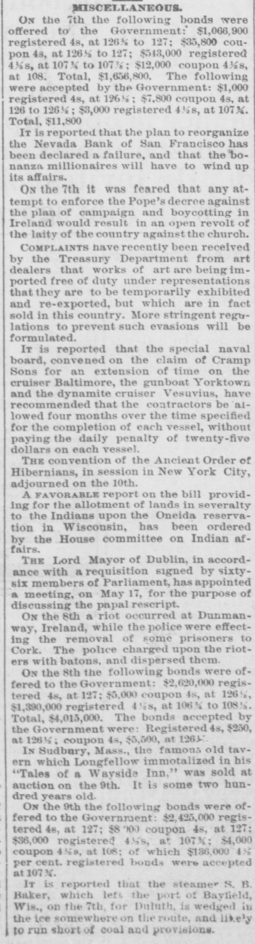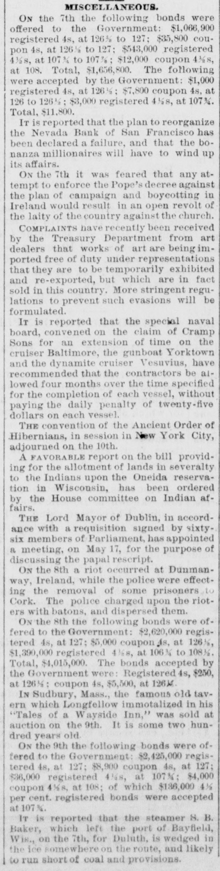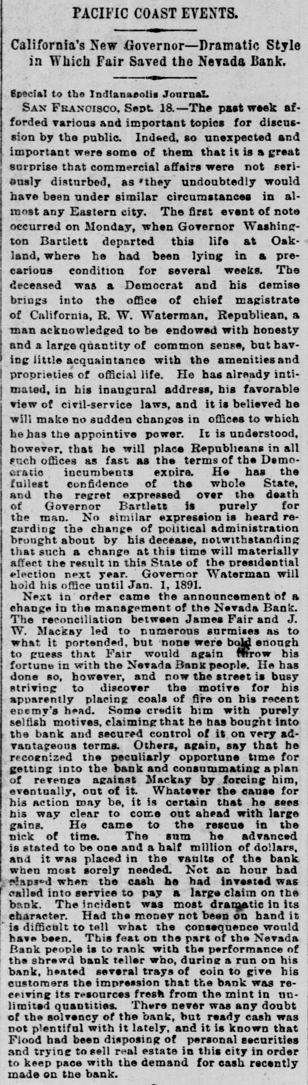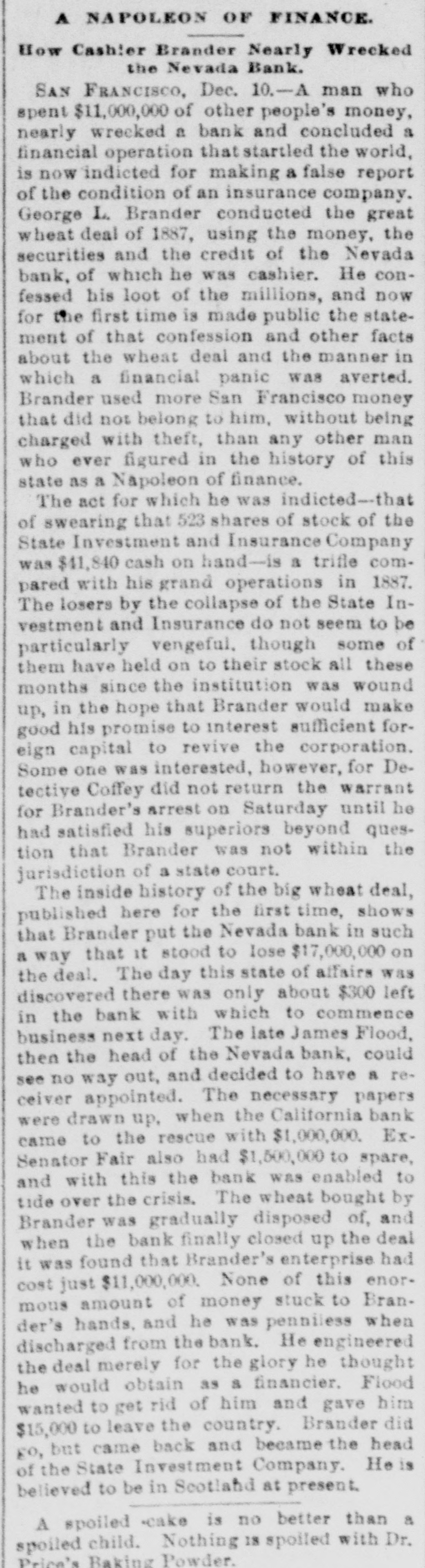 VAULTING AMBITION TO CORNER ALL THE WHEAT THERE WAS IN SIGHT Brings the 'Frisco Syndicate to a Very Deep Hole-The Nevada Bank in for $6,500,000, and the Syndicate Loses $7,500,000-National Bank Failure-Pope's Liabilities-A Fidelity Suit. SAN FRANCISCO, Sept. 17.-William Dresbach's statement of liabilities and assets, filed Friday, shows that the Nevada bank is a creditor for $550,000 on promissory notes and $6,000,000 guaranteed by Charles F. Reed. The bank is tbus shown to have advanced $6,500,000 to the wheat bull clique. Reed is a farmer and large land owner of Yolo county, and a brother of Mrs. Paran Stevens, of New York. He has other wealthy relatives, but it is not known how he satisfied the bank. The amount of cash on hand is $978. Among the assets are enormous amounts due from London and Liverpool consignees of wheat, but they merely present grain in transit. Rosenfelt's liability on joint account is $107,000. The total unsecured debts are $7,500,000, and this sum practically depresents the loss by the wheat deal. Mackay and Flood sold eight large valuable lots Friday afternoon. There are rumors that Flood has even placed his new brown stone Nob Hill mansion in the market, as well as Menlo park. Fair has advanced $1,500,000 to rescue the bank. Suit Against a Fidelity Stockholder. CINCINNATI, Sept. 17.-Suit was filed by the receiver of the Fidelity National bank, David Armstrong, through District Attorney Burnet and E. W. Kittredge, at 1:15 P. m., Friday, against William Wood for the payment of his subscription of $13,500 by note on the second $1,000,000 of stock. The Fidelity bank had advertised to increase its capital from $1,000,000 to $2,000,000, and by a vote of its directors resolved to increase it to that amount, but in doing so did not strictly follow the statute. The subscribers to the increase were given the privilege of paying in cash or note. This suit is brought to test the validity of the issue of the second million, it being claimed to be invalid because of the alleged irregularity and non-compliance with the statute. Failure of 24 National Bank. ERIE, Pa., Sept. 17.-The First National bank of Corry, Pa., closed its doors Tuesday morning by order of Bank Examiner Young. Thursday it was announced that the bank had purchased the Clark & Warren Independent Oil refinery for $133,000, property now said to have been taken to secure loans. Liabilities not stated. The Pope Failure Growing Worse. NEW YORK, Sept. 17.-The failure of T. J. Pope & Bros., iron merchants, proves more extensive than at first reported. The liabilities are now placed at $800,000. The assignee asserts that from 75 to 100 per cent. can be realized.