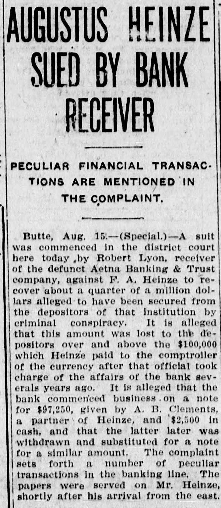 AUGUSTUS HEINZE SUED BY BANK RECEIVER PECULIAR FINANCIAL TRANSACTIONS ARE MENTIONED IN THE COMPLAINT. Butte, Aug. 15.-(Special.)-A suit was commenced in the district court here today by Robert Lyon, receiver of the defunct Aetna Banking & Trust company, against F. A. Heinze to recover about a quarter of a million dollars alleged to have been secured from the depositors of that institution by criminal conspiracy. It is alleged that this amount was lost to the depositors over and above the $100,000 which Heinze paid to the comptroller of the currency after that official took charge of the affairs of the bank severals years ago. It is alleged that the bank commenced business. on a note for $97,250, given by A. B. Clements, a partner " of Heinze, and $2,500 in cash, and that the latter later was withdrawn and substituted for a note for a similar amount. The complaint sets forth a number of peculiar transactions in the banking line, The papers were served on Mr. Heinze, shortly after his arrival from the east.