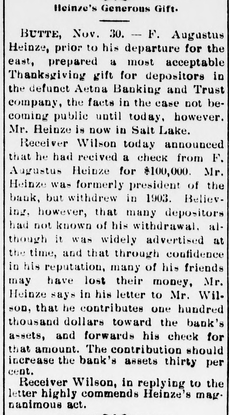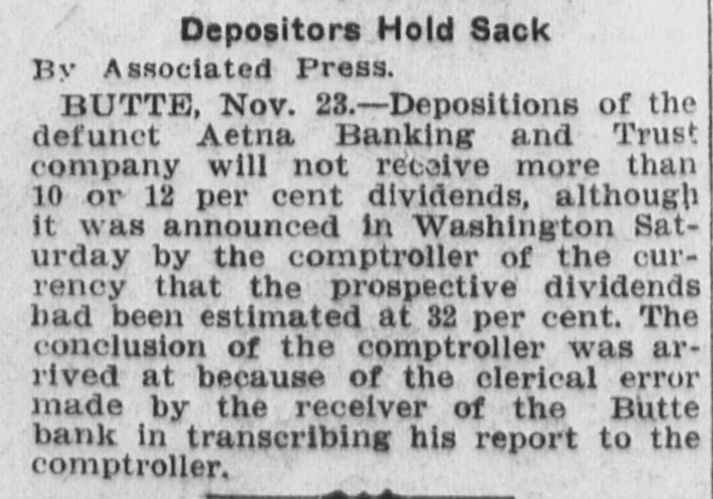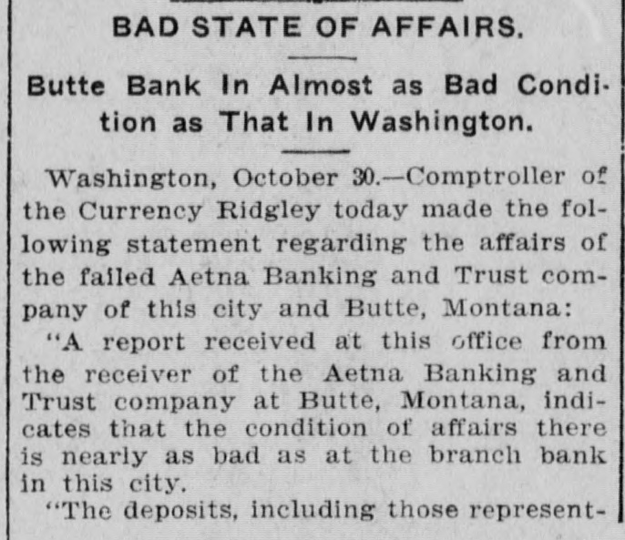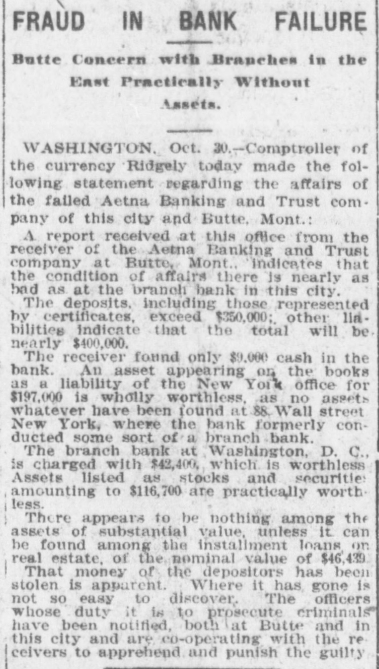 IN BANK FAILURE FRAUD Butte Concern with Branches in the East Practically Without Assets. WASHINGTON Oct. 30.-Comptroller of the currency Ridgely today made the following statement regarding the affairs of the failed Aetna Banking and Trust company of this city and Butte, Mont.: A report received at this office from the receiver of the Aetna Banking and Trust company at Butte, Mont. indicates that the condition of affairs there is nearly as bad as at the branch bank in this city. The deposits, including those represented by certificates, exceed $350,000; other lialbilities indicate that the total will be. nearly $400,000. The receiver found only $9,000 cash in the bank. An asset appearing on the books as a liability of the New York office for $197,000 is wholly worthless, as no assets whatever have been found at 88. Wall street New York, where the bank formerly conducted some sort of a branch bank. The branch bank at Washington, D. C., is charged with $42,400, which is worthless Assets listed as stocks and securities amounting to $116,700 are practically worth less. There appears to be nothing among the assets of substantial value, unless it can be found among the installment loans on real estate, of the nominal value of $46,439 That money of the depositors has been stolen is apparent. Where it has gone is not so easy to discover. The officers whose duty it is to prosecute criminals have been notified, both at Butte and in this city and are co-operating with the receivers to apprehend and punish the guilty