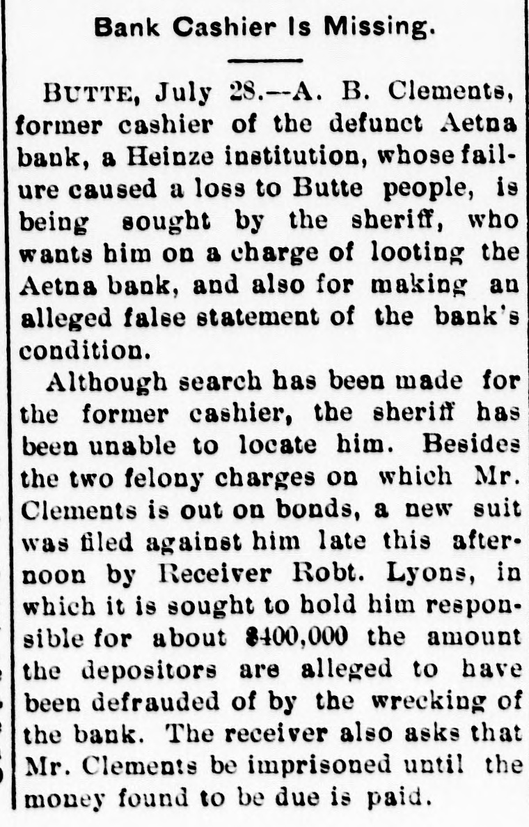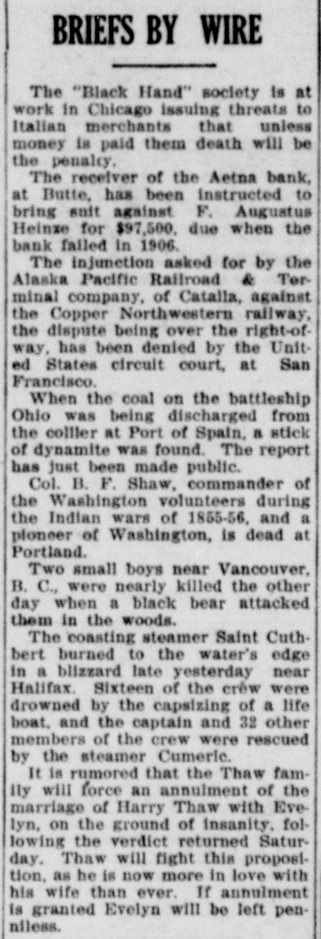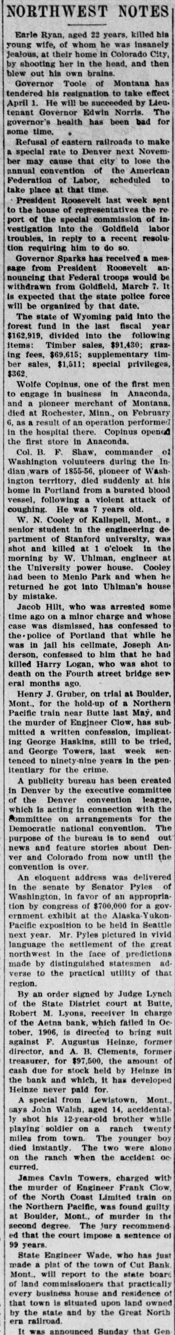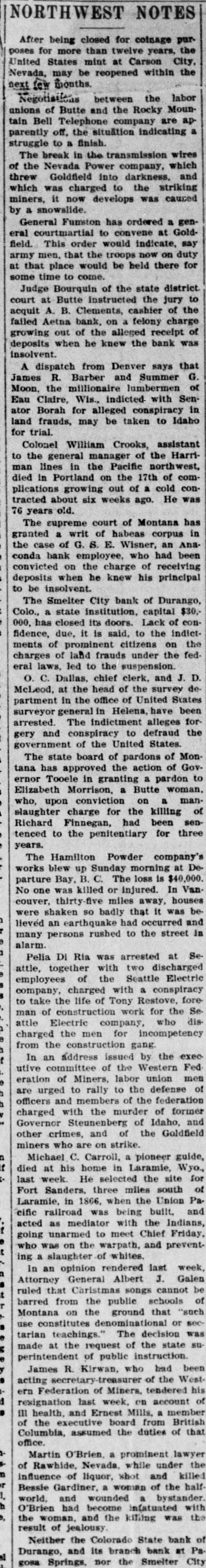 NORTHWEST NOTES After being closed for coinage purposes for more than twelve years, the United States mint at Carson City, Nevada, may be reopened within the next few months. Negotistions between the labor unions of Butte and the Rocky Mountain Bell Telephone company are apparently off, the situation indicating a to struggle # faish. The break in the transmission wires of the Nevada Power company, which threw Goldfield into darkness, and which was charged to the striking permo SEA Mou = miliers, by a snowslide. General Funston has ordered a general courtmartial to convene at Goldfield. This order would indicate, say army men. that the troops now on duty at that place would be held there for come of emm euros Judge Bourquin of the state district court at Butte instructed the jury to acquit A. B. Clements, cashier of the failed Aetna bank, on a felony charge growing out of the alleged receipt of deposits when he knew the bank was insolvent. A dispatch from Denver says that James R. Barber and Summer G. Moon. the millionaire lumbermen of Eau Claire, Wis., indicted with Senator Borah for alleged conspiracy in 01 taken eq ABUI for trial. Colonel William Crooks, assistant to the general manager of the Harriman lines in the Pacific northwest, died in Portland on the 17th of complications growing out of a cold contracted about six weeks ago. He was "PIO Years 92 The supreme court of Montana has granted a writ of habeas corpus in the case of G. S. E. Wisner, an Anaconda bank employee, who had been convicted on the charge of receiving deposits when he knew his principal to be insolvent. The Smelter City bank of Durango, Colo., a state institution, capital $30,000, has closed its doors. Lack of confidence, due, it is said, to the indictments of prominent citizens on the charges of land frauds under the federal laws, led to the suspension. 'a T pus clerk chile Datisa, O o McLeod, at the head of the survey department in the office of United States surveyor general in Helena, have been arrested. The indictment alleges forgery and conspiracy to defraud the government of the United States. The state board of pardons of Montana has approved the action of Gov. or perdon E up Toolele Jou.19 Elizabeth Morrison, a Butte woman, -UBUI 8 uo contriction uodn 'OUM slaughter charge for the killing of Richard Finnegan, had been sentenced to the penitentiary for three years. The Hamilton Powder company's works blew up Sunday morning at Departure Bay, B. C. The loss is $40,000. No one was killed or injured. In Van. couver, thirty-five miles away, houses were shaken so badly that it was believed an earthquake had occurred and many persons rushed to the street in alarm. Pelia DI Ria was arrested at Seattle, together with two discharged employees of the Seattle Electric E THE charged 'Xueduoo to take the life of Tony Restove, fore man of construction work for the Sesip oqa 'Aueduros eme charged the men for incompetency from the construction gang. In an address issued by the exec I utive committee of the Western Fed eration of Miners, labor union men e are urged to rally to the defense of e officers and members of the federation q charged with the murder of former Governor Steunenberg of Idaho, and other crimes, and of the Goldfield miners who are on strike. d Michael C. Carroll, a pioneer guide, I died at his home in Laramie, Wyo., last week. He selected the site for Fort Sanders, three miles south of Laramie, in 1866, when the Union Pa. cific railroad was being built. and acted as mediator with the Indians, going unarmed to meet Chief Friday, . pus a em uo SUM oqn 3 ing a slaughter of whites. In an opinion rendered last week, # Attorney General Albert J. Galen . ruled that Christmas songs cannot be 1 barred from the public schools of Montana on the ground that "such use constitutes denominational or sectarian teachings." The decision was made at the request of the state su 2 perintendent of public instruction. James R. Kirwan, who had been # acting secretary-treasurer of the Western Federation of Miners, tendered his P resignation last week, on account of III health. and Ernest Mills, a member of the executive board from British Columbia, assumed the duties of that office. Martin O'Brien, a prominent lawyer of Rawhide, Nevada, while under the # influence of liquor, shot and killed 20 Bessie Gardiner, a woman of the half 8 pepunom pus mord O'Brien had become infatuated with em SEM supply am pus "ившом em jo Then