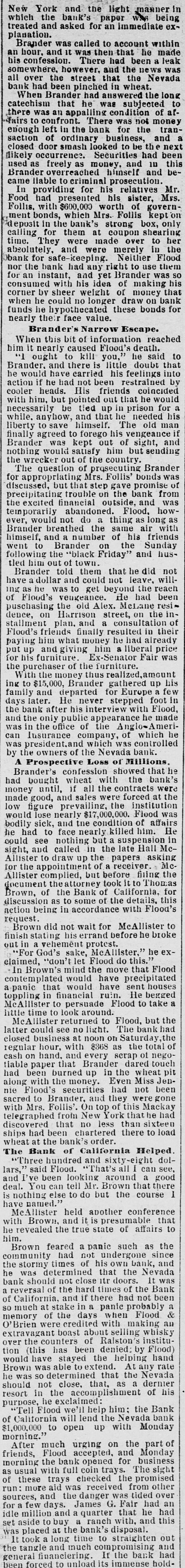 New York and the light manner in which the bank's paper was being treated and asked for an immediate explanation. Brander was called to account within an hour, and it was then that he made his confession. There had been a leak somewhere, however, and the news was all over the street that the Nevada bank had been pinched in wheat. When Brander had answered the long catechism that he was subjected to there was an appalling condition of affairs to confront. There was not money enough left in the bank for the transaction of ordinary business, and a closed door smash looked to be the next likely occurrence. Securities had been used as freely as money, and in this Brander overreached himself and became liable to criminal prosecution. In providing for his relatives Mr. Food had presented his sister, Mrs. Follis, with $600,000 worth of government bonds, which Mrs. Follis kept on deposit in the bank's strong box, only calling for them at coupon shearing time. They were made over to her absolutely, and were merely in the bank for safe-keeping. Neither Flood nor the bank had any right to use them for an instant, and yet Brander was so consumed with his idea of making his corner by sheer weight of money that when he could no longer draw on bank funds he hypothecated these bonds for nearly their face value. # Brander's Narrow Escape. When this bit of information reached him it nearly caused Flood's death. "I ought to kill you," he said to Brander, and there is little doubt that he would have carried his feelings into action if he had not been restrained by cooler heads. His friends coincided with him, but pointed out that he would necessarily be tied up in prison for a while, anyhow, and that he needed his liberty to save himself. The old man finally agreed to forego his vengeance if Brander was kept out of sight, and nothing would satisfy him but sending the wrecker out of the country. The question of prosecuting Brander for appropriating Mrs. Follis' bonds was discussed, but that step gave promise of precipitating trouble on the bank from the excited financial outside, and was temporarily abandoned. Flood, however, would not do a thing as long as Brander breathed the same air with himself, and a number of his friends went to Brander on the Sunday following the "black Friday" and hustled him out of town. Brander told them that he did not have a dollar and could not leave, willing as he was to get beyond the reach of Flood's vengeance. He had been puschasing the old Alex. McLane residence, on Harrison street, on the installment plan, and a consultation of Flood's friends finally resulted in their paying him what money he had already put up and giving him a liberal price for his furniture. Ex-Senator Fair was the purchaser of the furniture. With the money thus realized, amounting to $15,000, Brander gathered up his family and departed for Europe a few days later. He never stepped foot in the bank after his interview with Flood, and the only public appearance he made was in the office of the Anglo-American lusurance company, of which he was president, and which was controlled by the owners of the Nevada bank. # A Prospective Loss of Millions. Brander's confession showed that he had bought wheat with the bank's money until, if all the contracts were made good, and sales were forced at the low figure prevailing, the institution would lose nearly $17,000,000. Flood was bodily sick, and the condition of affairs he had to face nearly killed him. He could see nothing but a suspension in sight, and called in the late Hall McAllister to draw up the papers asking for the appointment of a receiver. McAllister complied, but before fiting the document the attorney took it to Thomas Brown, of the Bank of California, for discussion as to some of the details, this action being in accordance with Flood's request. Brown did not wait for McAllister to finish stating his errand before he broke out in a vehement protest. "For God's sake, McAllister," he exclaimed, "don't let Flood do this." In Brown's mind the move that Flood contemplated would have precipitated a panic that would have sent houses toppling in financial ruin. He begged McAllister to persuade Flood to take a little time to look around. McAllister returned to Flood, but the latter could see no light. The bank had closed business at noon on Saturday, the regular hour, with $368 as the total of cash on hand, and every scrap of negotiable paper that Brander dared touch had been burned up in the wheat pit along with the money. Even Miss Jennie Flood's securities had not been sacred to Brander, and they were gone with Mrs. Follis'. On top of this Mackay telegraphed from New York that he had discovered that no less than sixteen ships had been chartered there to load wheat at the bank's order. # The Bank of California Helped. "Three hundred and sixty-eight dollars," said Flood. "That's all I can see, and I've been looking around a good deal. You can tell Mr. Brown that there is nothing else to do but the course 1 have named." McAllister held another conference with Brown, and it is presumable that he revealed the true state of affairs to him. Brown feared a panic such as the community had not undergone since the stormy times of his own bank, and he was determined that the Nevada bank should not close itr doors. It was a reversal of the hard times of the Bank of California, and if there had not been so much at stake in a panic probably a memory of the days when Flood & O'Brien were credited with making au extravagant boast about selling whisky over the counters of Ralston's institution (this has been denied; by Flood) would have stayed the helping hand Brown was able to extend. At any rate he was so determined that the Nevada should not close, that, as a dermer resort in the accomplishment of his purpose, he exclaimed: "Tell Flood we'll help him; the Bank of California will lend the Nevada bank $1,000,000 to open up with Monday morning." After much urging on the par