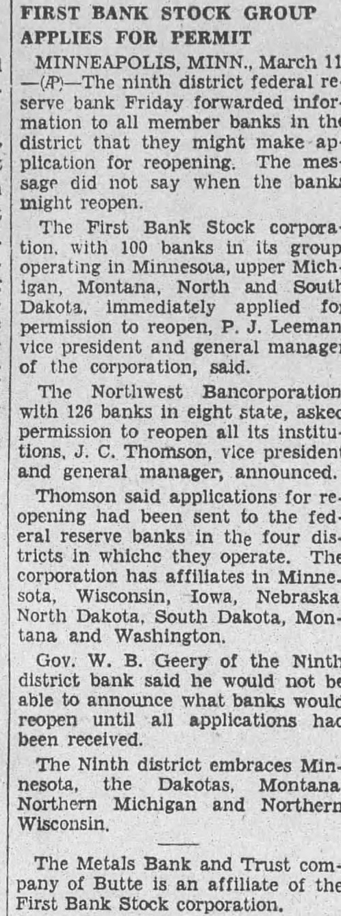 FIRST BANK STOCK GROUP APPLIES FOR PERMIT MINNEAPOLIS, MINN., March 11. ninth district federal reserve bank Friday forwarded information to all member banks in the district that they might make application for reopening The message did not say when the banks might reopen. The First Bank Stock corporation. with 100 banks in its group, operating in Minnesota, upper Michigan, Montana, North and South Dakota. immediately applied for permission to reopen, P J. Leeman, vice and general manager of the corporation, said. The Northwest Bancorporation with 126 banks in eight state, asked permission to reopen all its institutions, J. C. Thomson, vice president and general manager, announced. Thomson said applications for reopening had been sent to the federal banks in the four districts in whiche they operate. The corporation has affiliates in Minnesota, Wisconsin, Iowa, Nebraska. North Dakota. South Dakota, Montana and Washington. Gov. W. B. Geery of the Ninth district bank said he would not be able to announce what banks would reopen until all applications had been received. The Ninth district embraces Minnesota, the Dakotas, Montana, Northern Michigan and Northern The Metals Bank and Trust company of Butte an affiliate of the First Bank Stock corporation.