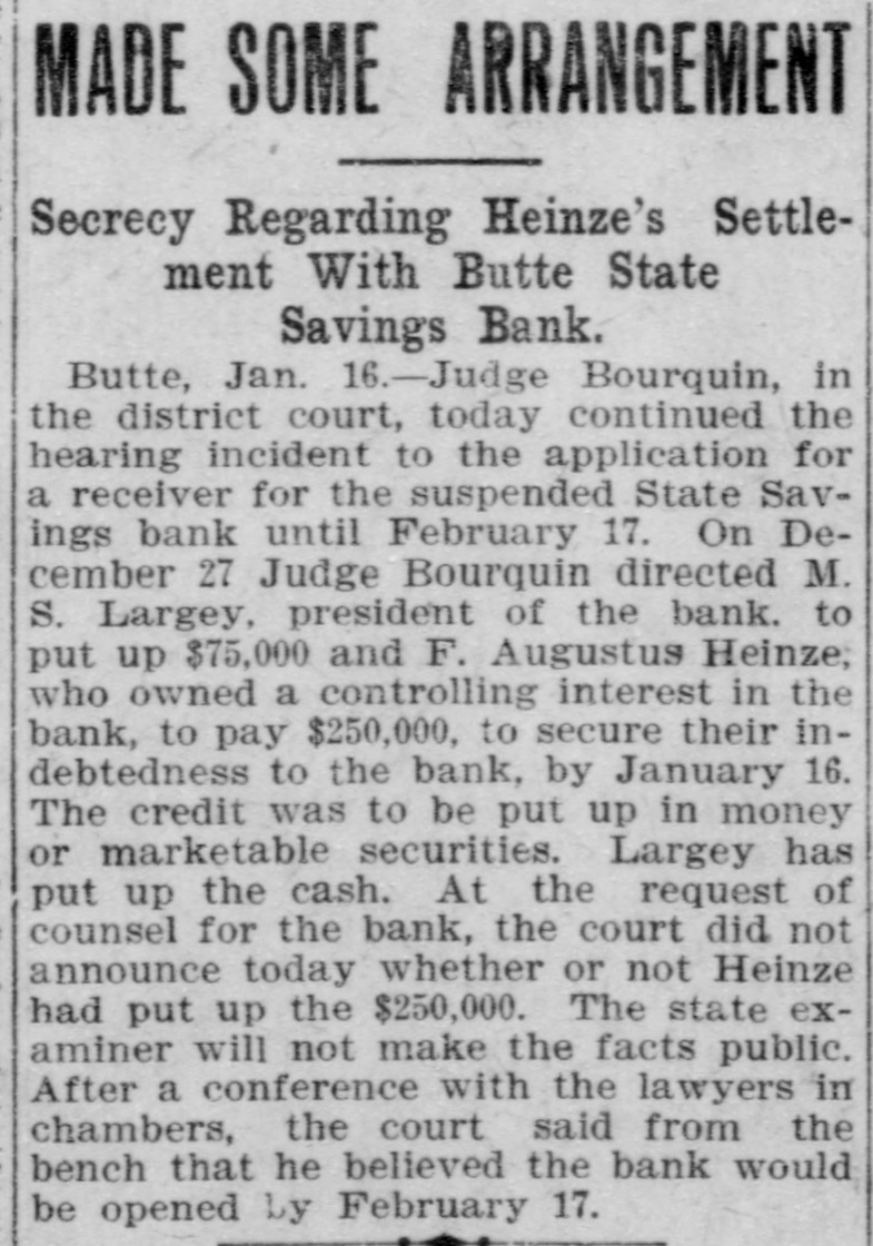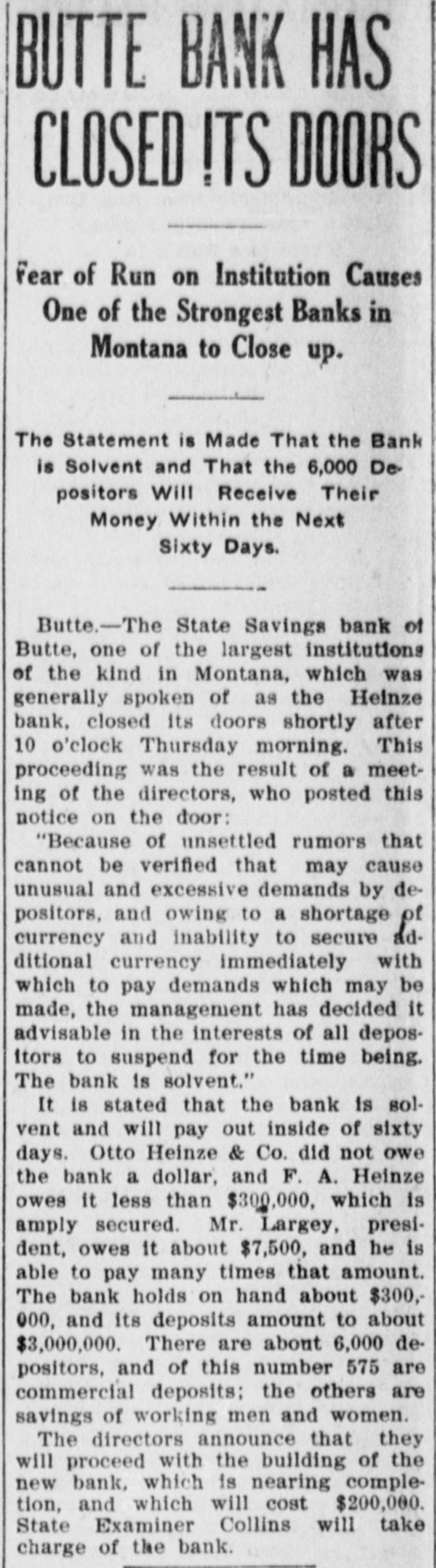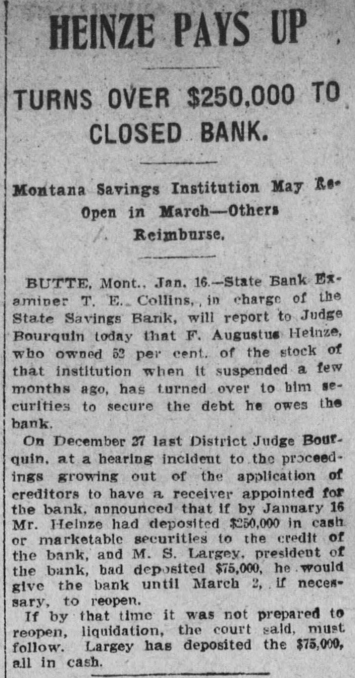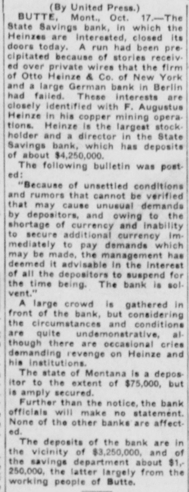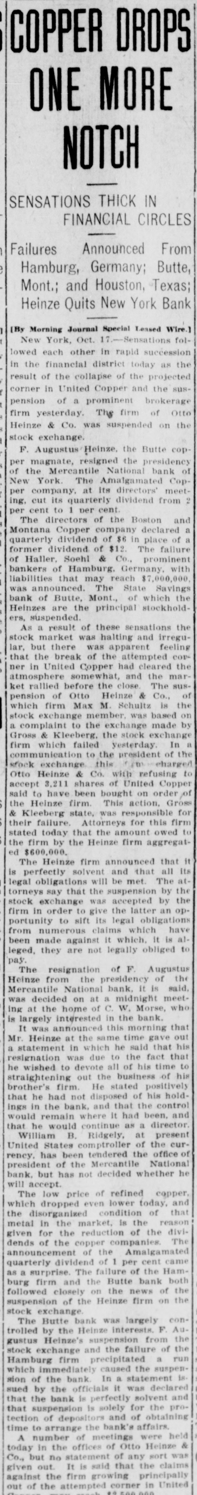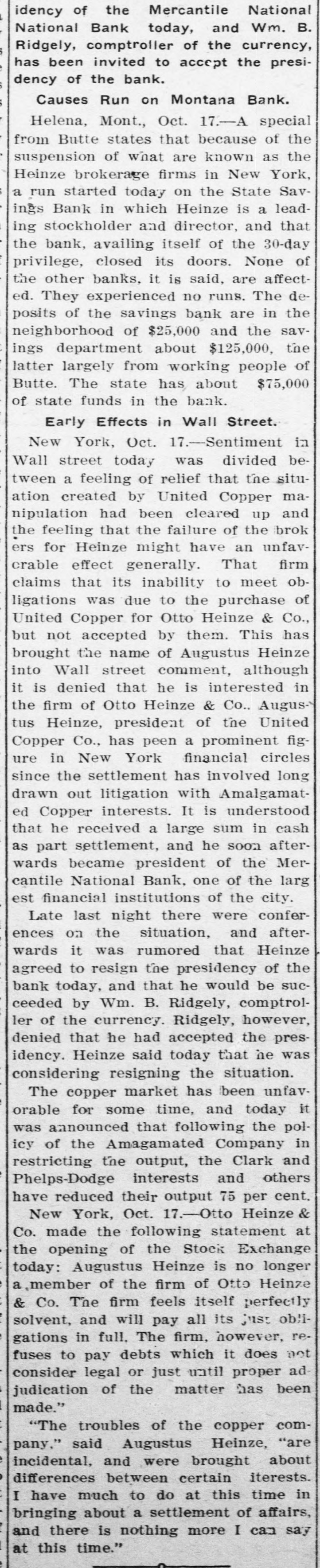 idency of the Mercantile National National Bank today, and Wm. B. Ridgely, comptroller of the currency, has been invited to accept the presidency of the bank. Causes Run on Montana Bank. Helena, Mont., Oct. 17.-A special from Butte states that because of the suspension of what are known as the Heinze brokerage firms in New York, a run started today on the State Savings Bank in which Heinze is a leading stockholder and director, and that the bank, availing itself of the 30-day privilege, closed its doors. None of the other banks, it is said, are affected. They experienced no runs. The deposits of the savings bank are in the neighborhood of $25,000 and the savings department about $125,000, the latter largely from working people of Butte. The state has about $75,000 of state funds in the bank. Early Effects in Wall Street. New York, Oct. 17.-Sentiment in Wall street today was divided between a feeling of relief that the situation created by United Copper manipulation had been cleared up and the feeling that the failure of the brok ers for Heinze might have an unfavcrable effect generally. That firm claims that its inability to meet obligations was due to the purchase of United Copper for Otto Heinze & Co., but not accepted by them. This has brought the name of Augustus Heinze into Wall street comment, although it is denied that he is interested in the firm of Otto Heinze & Co., Augustus Heinze, president of the United Copper Co., has peen a prominent figure in New York financial circles since the settlement has involved long drawn out litigation with Amalgamated Copper interests. It is understood that he received a large sum in cash as part settlement, and he soon afterwards became president of the Mercantile National Bank, one of the larg est financial institutions of the city. Late last night there were conferences on the situation, and afterwards it was rumored that Heinze agreed to resign the presidency of the bank today, and that he would be succeeded by Wm. B. Ridgely, comptroller of the currency. Ridgely, however, denied that he had accepted the presidency. Heinze said today that he was considering resigning the situation. The copper market has been unfavorable for some time, and today it was announced that following the policy of the Amagamated Company in restricting the output, the Clark and Phelps-Dodge interests and others have reduced their output 75 per cent. New York, Oct. 17.-Otto Heinze & Co. made the following statement at the opening of the Stock Exchange today: Augustus Heinze is no longer a member of the firm of Otto Heinze & Co. The firm feels itself perfectly solvent, and will pay all its just obligations in full. The firm, however, refuses to pay debts which it does not consider legal or just until proper ad judication of the matter has been made." "The troubles of the copper company," said Augustus Heinze, "are incidental, and were brought about differences between certain iterests. I have much to do at this time in bringing about a settlement of affairs, and there is nothing more I can say at this time."