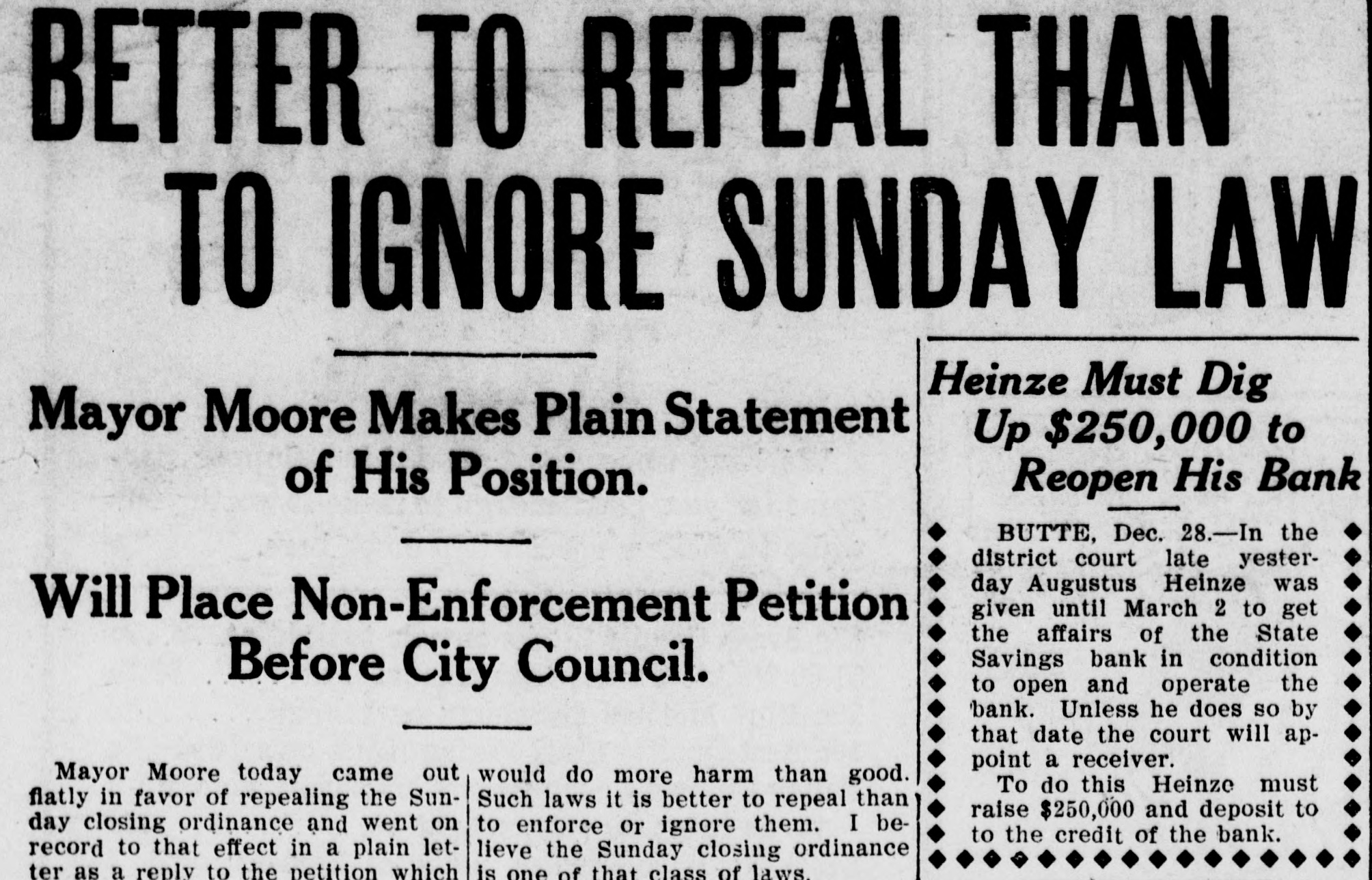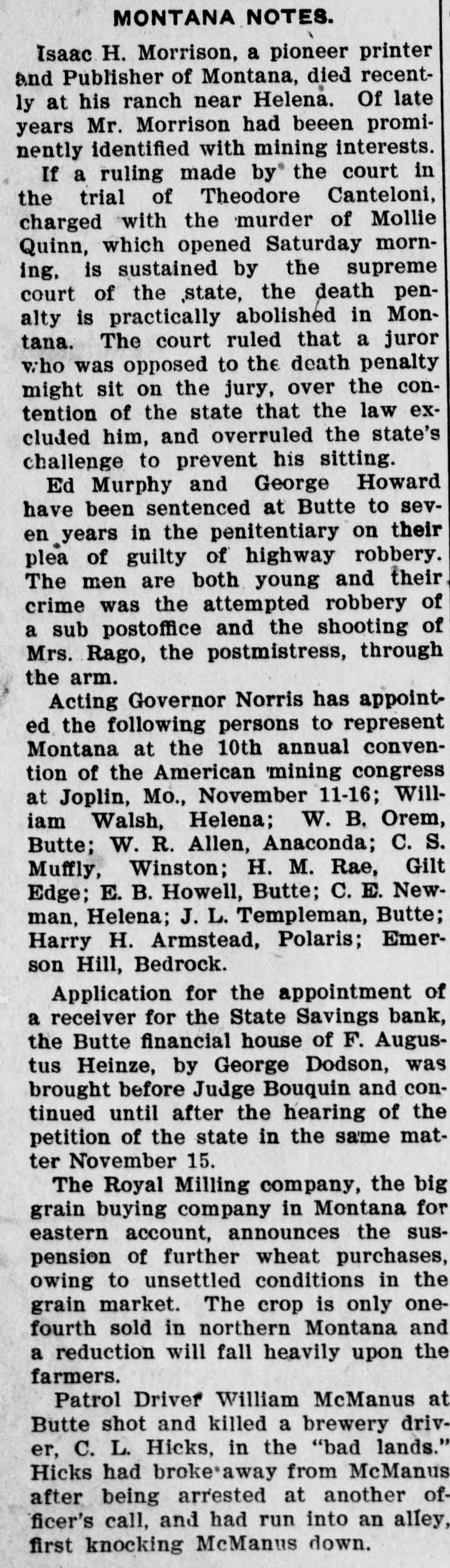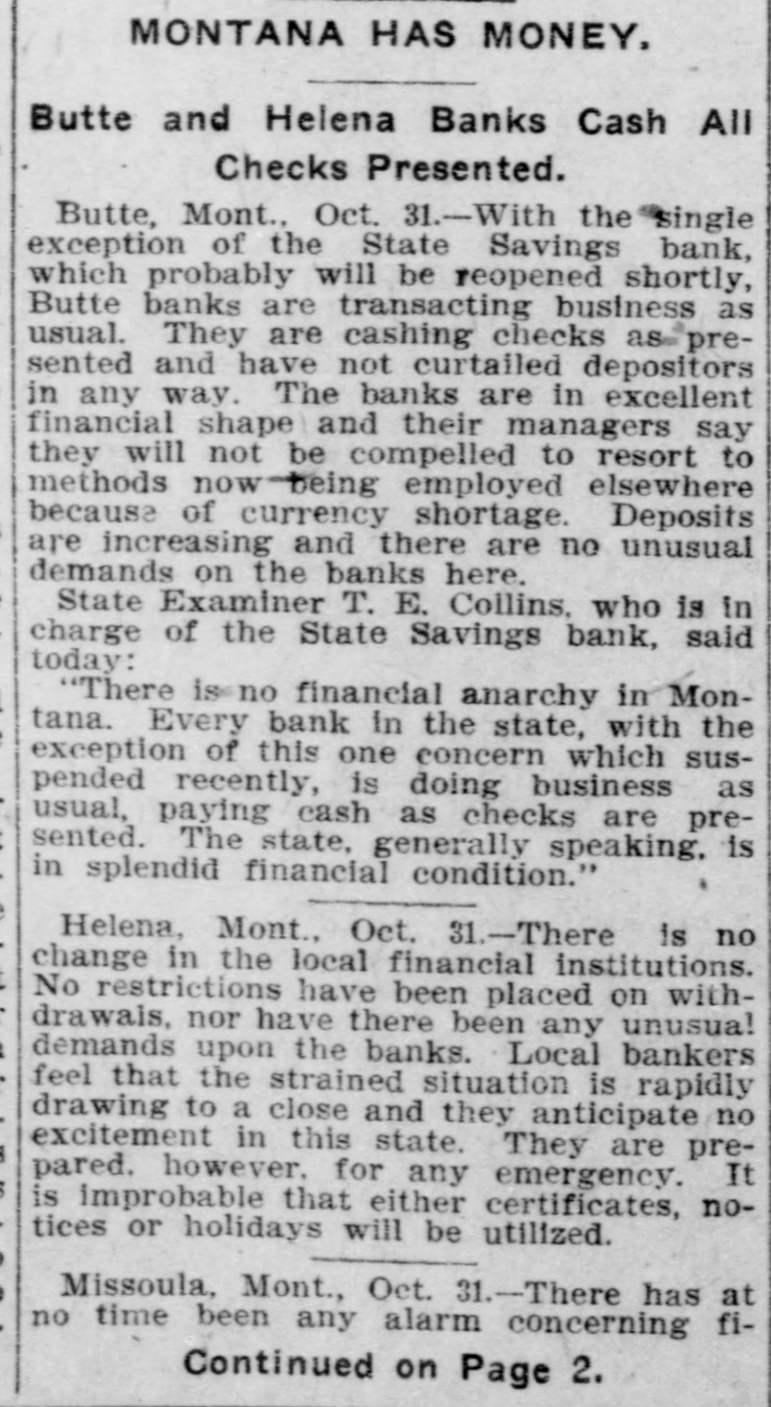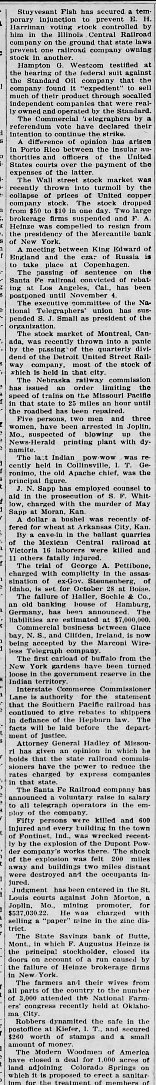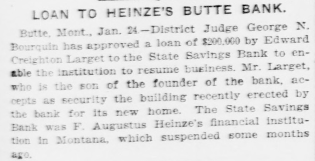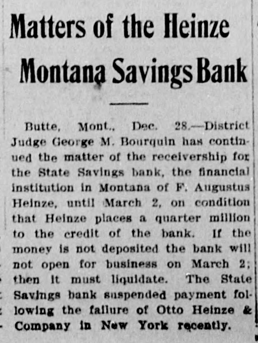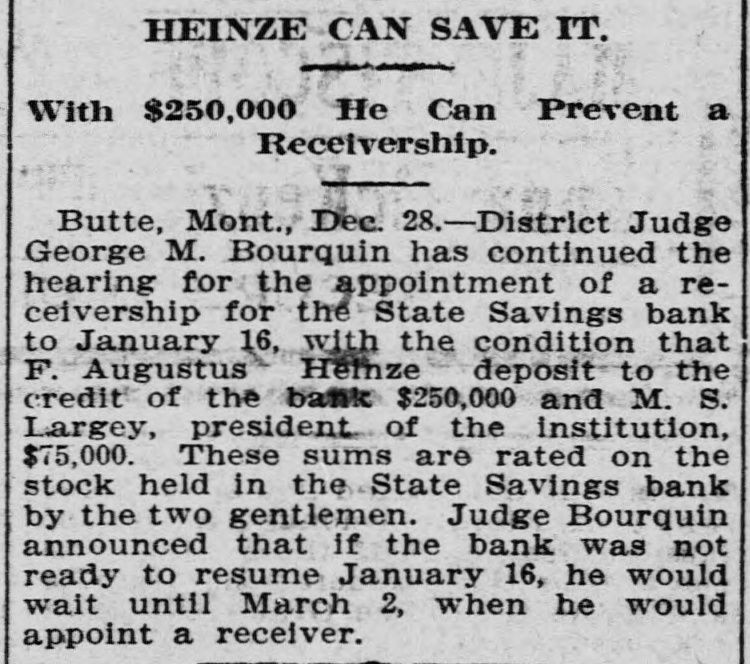 idency of the Mercantile National National Bank today, and Wm. B. Ridgely, comptroller of the currency, has been invited to accept the presidency of the bank. Causes Run on Montana Bank. Helena, Mont., Oct. 17.-A special from Butte states that because of the suspension of what are known as the Heinze brokerage firms in New York, a run started today on the State Savings Bank in which Heinze is a leading stockholder and director, and that the bank, availing itself of the 30-day privilege, closed its doors. None of the other banks, it is said, are affected. They experienced no runs. The deposits of the savings bank are in the neighborhood of $25,000 and the savings department about $125,000, the latter largely from working people of Butte. The state has about $75,000 of state funds in the bank. Early Effects in Wall Street. New York, Oct. 17.-Sentiment in Wall street today was divided between a feeling of relief that the situation created by United Copper manipulation had been cleared up and the feeling that the failure of the brok ers for Heinze might have an unfavcrable effect generally. That firm claims that its inability to meet obligations was due to the purchase of United Copper for Otto Heinze & Co., but not accepted by them. This has brought the name of Augustus Heinze into Wall street comment, although it is denied that he is interested in the firm of Otto Heinze & Co., Augustus Heinze, president of the United Copper Co., has peen a prominent figure in New York financial circles since the settlement has involved long drawn out litigation with Amalgamated Copper interests. It is understood that he received a large sum in cash as part settlement, and he soon afterwards became president of the Mercantile National Bank, one of the larg est financial institutions of the city. Late last night there were conferences on the situation, and afterwards it was rumored that Heinze agreed to resign the presidency of the bank today, and that he would be succeeded by Wm. B. Ridgely, comptroller of the currency. Ridgely, however, denied that he had accepted the presidency. Heinze said today that he was considering resigning the situation. The copper market has been unfavorable for some time, and today it was announced that following the policy of the Amagamated Company in restricting the output, the Clark and Phelps-Dodge interests and others have reduced their output 75 per cent. New York, Oct. 17.-Otto Heinze & Co. made the following statement at the opening of the Stock Exchange today: Augustus Heinze is no longer a member of the firm of Otto Heinze & Co. The firm feels itself perfectly solvent, and will pay all its just obligations in full. The firm, however, refuses to pay debts which it does not consider legal or just until proper ad judication of the matter has been made." "The troubles of the copper company," said Augustus Heinze, "are incidental, and were brought about differences between certain iterests. I have much to do at this time in bringing about a settlement of affairs, and there is nothing more I can say at this time."