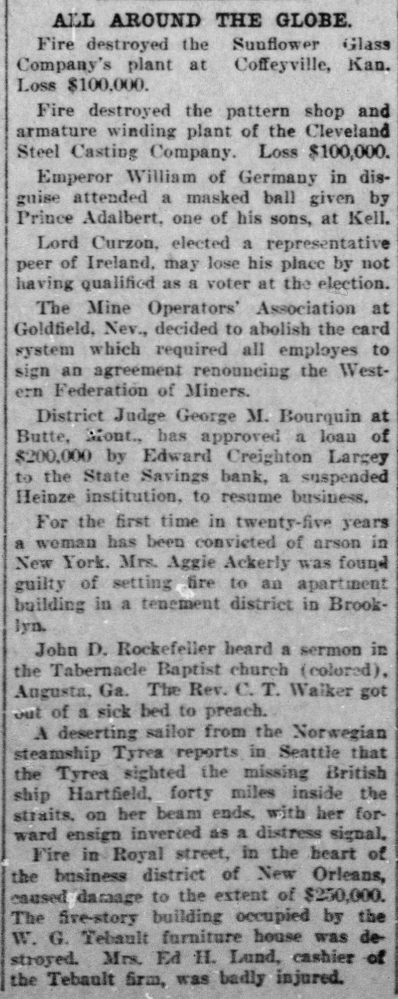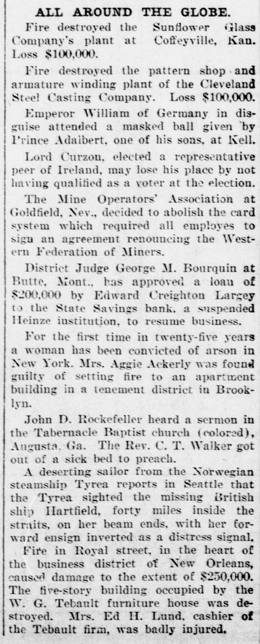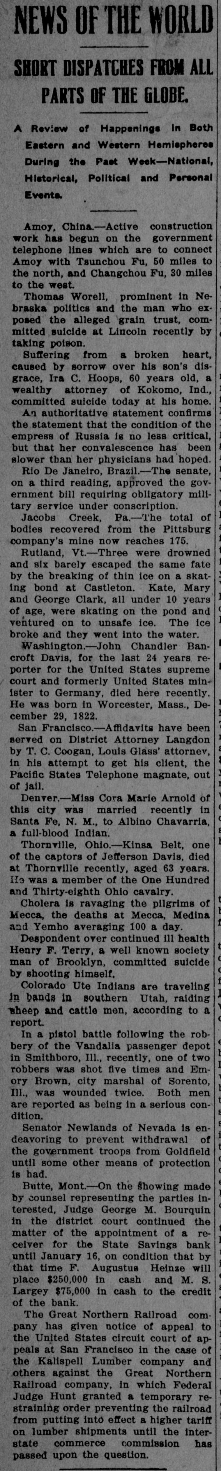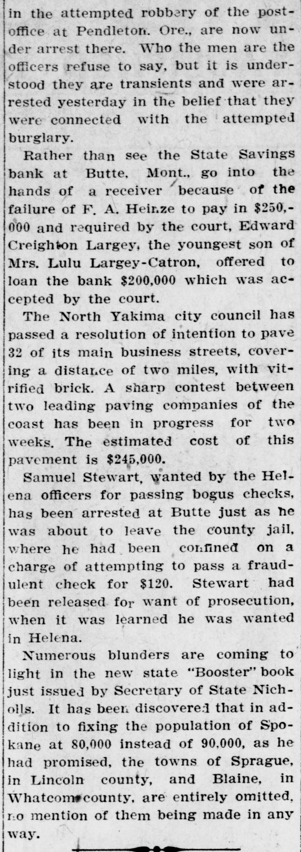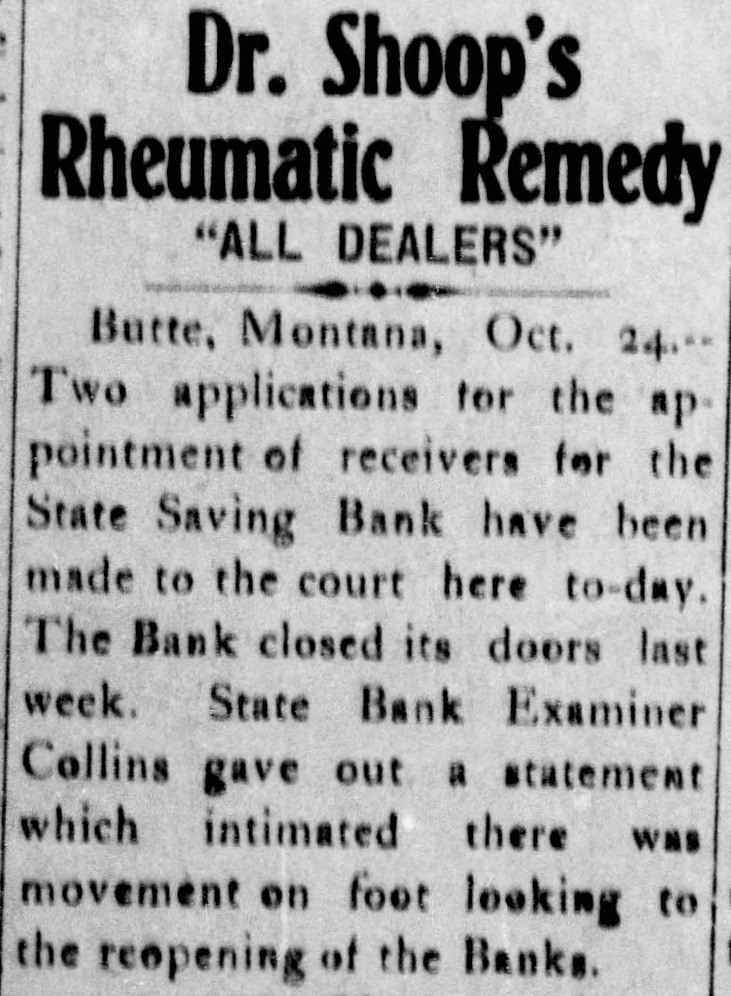 idency of the Mercantile National National Bank today, and Wm. B. Ridgely, comptroller of the currency, has been invited to accept the presidency of the bank. Causes Run on Montana Bank. Helena, Mont., Oct. 17.-A special from Butte states that because of the suspension of what are known as the Heinze brokerage firms in New York, a run started today on the State Savings Bank in which Heinze is a leading stockholder and director, and that the bank, availing itself of the 30-day privilege, closed its doors. None of the other banks, it is said, are affected. They experienced no runs. The deposits of the savings bank are in the neighborhood of $25,000 and the savings department about $125,000, the latter largely from working people of Butte. The state has about $75,000 of state funds in the bank. Early Effects in Wall Street. New York, Oct. 17.-Sentiment in Wall street today was divided between a feeling of relief that the situation created by United Copper manipulation had been cleared up and the feeling that the failure of the brok ers for Heinze might have an unfavcrable effect generally. That firm claims that its inability to meet obligations was due to the purchase of United Copper for Otto Heinze & Co., but not accepted by them. This has brought the name of Augustus Heinze into Wall street comment, although it is denied that he is interested in the firm of Otto Heinze & Co., Augustus Heinze, president of the United Copper Co., has peen a prominent figure in New York financial circles since the settlement has involved long drawn out litigation with Amalgamated Copper interests. It is understood that he received a large sum in cash as part settlement, and he soon afterwards became president of the Mercantile National Bank, one of the larg est financial institutions of the city. Late last night there were conferences on the situation, and afterwards it was rumored that Heinze agreed to resign the presidency of the bank today, and that he would be succeeded by Wm. B. Ridgely, comptroller of the currency. Ridgely, however, denied that he had accepted the presidency. Heinze said today that he was considering resigning the situation. The copper market has been unfavorable for some time, and today it was announced that following the policy of the Amagamated Company in restricting the output, the Clark and Phelps-Dodge interests and others have reduced their output 75 per cent. New York, Oct. 17.-Otto Heinze & Co. made the following statement at the opening of the Stock Exchange today: Augustus Heinze is no longer a member of the firm of Otto Heinze & Co. The firm feels itself perfectly solvent, and will pay all its just obligations in full. The firm, however, refuses to pay debts which it does not consider legal or just until proper ad judication of the matter has been made." "The troubles of the copper company," said Augustus Heinze, "are incidental, and were brought about differences between certain iterests. I have much to do at this time in bringing about a settlement of affairs, and there is nothing more I can say at this time."