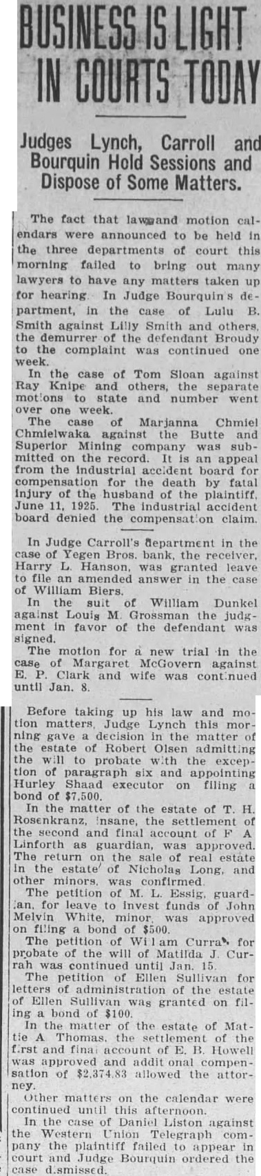 BUSINESS IS LIGHT IN COURTS TODAY Judges Lynch, Carroll and Bourquin Hold Sessions and Dispose of Some Matters. The fact that lawgand motion calendars were announced to be held in the three departments of court this morning failed to bring out many lawyers to have any matters taken up for hearing In Judge Bourquin de partment, in the case of Lulu B. Smith against Lilly Smith and others the demurrer of the defendant Broudy to the complaint was continued one week. In the case of Tom Sloan against Ray Knipe and others, the separate motions to state and number went over one week. The case of Marjanna Chmiel Chmielwaka against the Butte and Superior Mining company was submitted on the It is an appeal from the Industrial accident board for compensation for the death by fatal injury of the husband of the plaintiff June 11, 1925. The industrial accident board denied the compensation claim In Judge Carroll's department in the case of Yegen Bros. bank, the receiver. Harry L. Hanson, was granted leave to file an amended answer in the case of William Biers. In the of William Dunkel against Louis M Grossman the judg ment in favor of the defendant was signed. The motion for a new trial in the case of Margaret McGovern against E. P. Clark and wife was continued until Jan. 8. Before taking up his law and motion matters, Judge Lynch this morning gave a decision in the matter of the estate of Robert Olsen admitting the will to probate with the exception of paragraph six and appointing Hurley Shaad executor on filing a bond of In the matter of the estate of T. H. Rosenkranz, Insane, the settlement of the second and final account of F A Linforth as guardian, was approved The return on the sale of real estate In the estate of Nicholas Long, and other minors. was confirmed The petition of M. L. Essig guard(an, for leave to Invest funds of John Melvin White, minor was approved on filing bond of $500. The of Wi am Curra for probate of the will of Matilda Currah was continued until Jan. 15 The petition of Ellen Sullivan for letters of administration of the estate of Ellen Sullivan was granted on filing a bond of $100 In the matter of the estate of Mattie A Thomas. the settlement of the first and final account of E. B. Howell was approved and addit onal compensation of $2,374.83 allowed the attorney. Other matters on the calendar were continued until this afternoon. In the case of Daniel Liston against the Western Union Telegraph company the plaintiff failed to appear in court and Judge Bourquin ordered the case