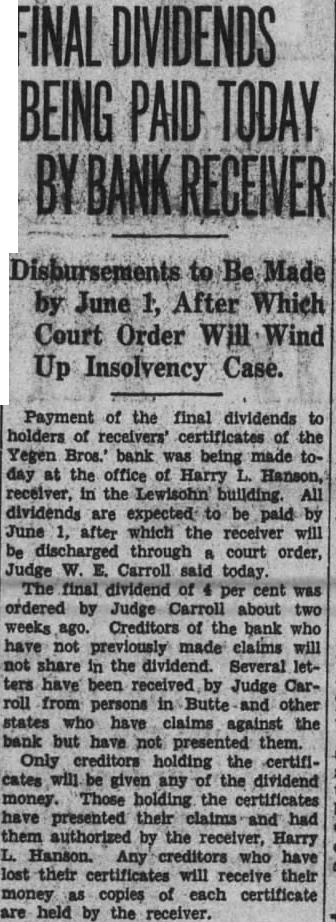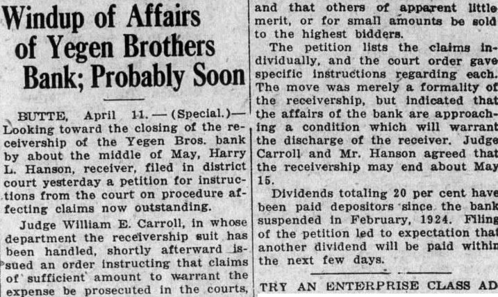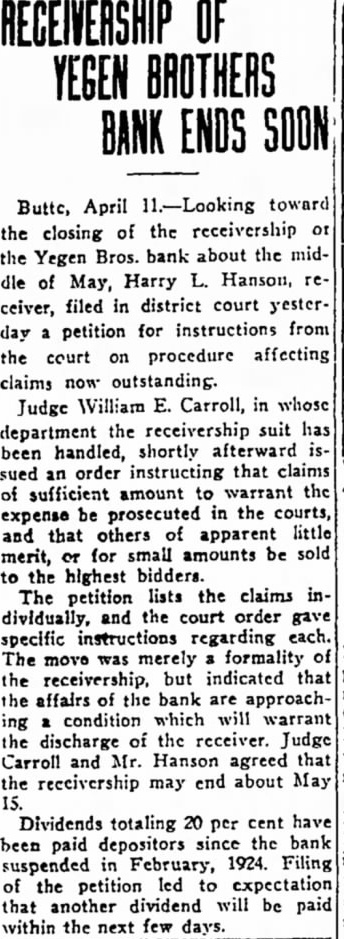 Butte, April toward the closing of the receivership the Yegen Bros. bank about the of May, Harry L. Hanson, ceiver, filed in district court yesterday petition for instructions from the court on procedure affecting claims now outstanding. Judge William Carroll, in whose department the receivership suit has been handled, shortly afterward sued order instructing that claims sufficient amount warrant the expense be prosecuted in the courts, and that others of apparent little merit, for small amounts be sold the highest bidders. The petition lists the claims dividually, and the court order specific instructions regarding each. The merely formality but indicated that the the affairs of the bank are approachcondition which will the discharge of the receiver. Judge Carroll and Mr. Hanson agreed that the receivership may end about May Dividends totaling 20 per cent have been depositors since the bank paid suspended in February, 1924. Filing the petition led expectation another dividend will be within the next few days.