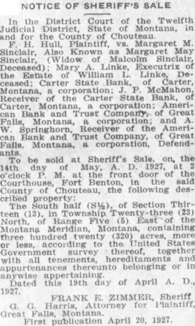 NOTICE OF SHERIFF'S SALE In the District Court of the Twelfth Judicial District, State Montana, in and for the County of Chouteau Hull, Plaintiff, vs. Margaret M. Sinclair, Also Known as Margaret May Sinclair, (Widow of Malcolm Sinclair, Deceased) Mary Linke, Executrix of the Estate of William L. Linke, Deceased: Carter State Bank, Carter, Montana, McMahon, Receiver of the Carter State Bank, of Carter, Montana, corporation; American Bank and Trust Company, Great Falls, Montana, corporation; and W Springhorn, Receiver of the American Bank and Trust Company, of Great Falls, Montana, a corporation, Defendants. be sold at Sheriff's Sale, on, the 14th day May, D. 1927, o'clock M at the front door of the Courthouse, Fort Benton, the said County Chouteau, the following described The South half (S½), of Section Thirteen (13), in Township Twenty three (23) North, of Range Five (5) East the Montana Meridian, Montana, containing three hundred twenty (320) acres, more or less, according to the United States Government survey thereof, together with all tenements, hereditaments and thereunto belonging or in anywise Dated apper this 19th day of April A. D., 1927. FRANK E. ZIMMER, Sheriff G. G. Harris, Attorney for Plaintiff, Great First publication April 20, 1927