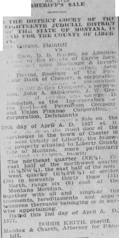 SHERIFF'S SALE OF THE THE DISTRICT DISTRICT FOR THE COUN OF LIBER AdminisDevine, Receiver of Chester Bank Gra John A. D. the ohnston, Company Union Finance and Defendants corporation. the Sale on D. 1927 of April day the door of Chester in the town the follow Liberty, Liberty County ticularly more of Montana, The northeast quarter (NE%) quarter the east half the sout half of the east west quarter thirty three in township (30) of the (6) east six North, Montana the and singu.ar all appu tenements, tenances thereunto hereditaments belonging or in wise appertaining. this 2nd day of April A. D., 1927. Sheriff. DODDS KEITH. Attorney for & Church, tiff.