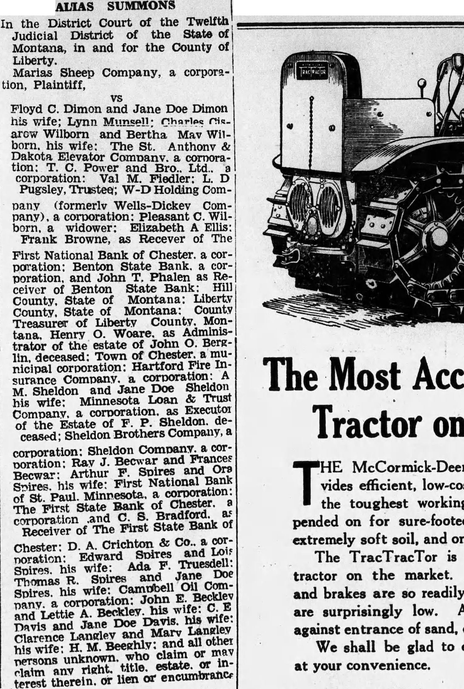 ALIAS SUMMONS In the District Court of the Twelfth Judicial District of the State of Montana, in and for the County of Liberty. Marias Sheep Company, a corporation, Plaintiff, Floyd C. Dimon and Jane Doe Dimon his wife; Lynn Munsell: Charles Cis. arow Wilborn and Bertha Mav Wilborn. his wife: The St. Anthonv & Dakota Elevator Company. a cornoration: T. C. Power and Bro. Ltd.. corporation: Val M. Fiedler: L. D Pugsley, Trustee; W-D Holding Company (formerly Wells-Dickev Company) a corporation: Pleasant C. Wilborn. a widower: Elizabeth A Ellis: Frank Browne, as Recever of The First National Bank of Chester. a corporation: Benton State Bank. a corporation. and John T. Phalen as Receiver of Benton State Bank: Hill County. State of Montana: Liberty County. State of Montana: County Treasurer of Liberty County. Montana, Henry O. Woare. as Administrator of the estate of John O. Berglin. deceased: Town of Chester. municipal corporation: Hartford Fire Insurance Company. a corporation A M. Sheldon and Jane Doe Sheldon his wife: Minnesota Loan & Trust Company. a corporation. as Executor of the Estate of F. P. Sheldon. deceased; Sheldon Brothers Company, a corporation: Sheldon Company. a corporation: Rav J. Becwar and Frances Becwar Arthur F. Spires and Ora Spires. his wife: First National Bank T of St Paul Minnesota. a corporation: The First State Bank of Chester. corporation and C. S. Bradford. as Receiver of The First State Bank of Chester: D. Crichton & Co., a cornoration Edward Spires and Lois Spires. his wife: Ada F. Truesdell: Thomas R. Spires and Jane Doe Spires. his wife: Campbell Oil Company. a corporation: John E. Becklev and Lettie A. Beckley his wife: C. E Davis and Jane Doe Davis. his wife: Clarence Langley and Marv Langley his wife: H. M. Beeghly: and all other persons unknown. title. who estate. claim or or may inat your convenience. claim terest therein. any right. or lien or encumbrance