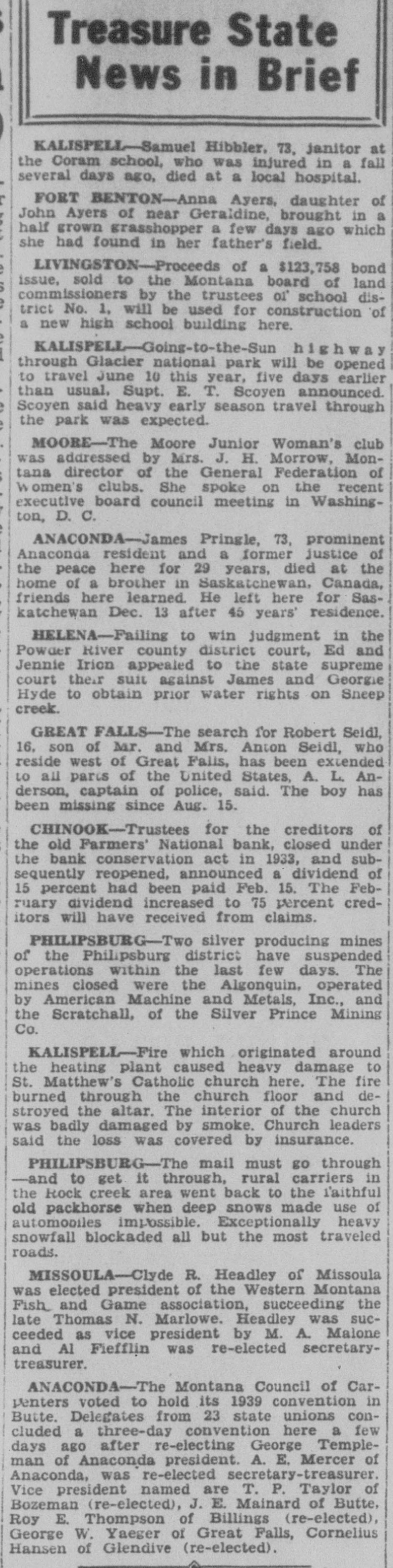 Treasure State News in Brief KALISPELL-Samuel Hibbler. 73, janitor at the Coram school, who was injured in a fall several days ago, died at a local hospital. FORT BENTON-Anna Ayers, daughter of John Ayers of near Geraldine, brought in a half grown grasshopper a few days ago which she had found in her father's field. LIVINGSTON-Proceeds of a $123,758 bond issue, sold to the Montana board of land commissioners by the trustees of school district No. 1, will be used for construction of a new high school building here. KALISPELL-Going-to-the-Sun highway through Glacier national park will be opened to travel June 10 this year, five days earlier than usual. Supt. E. T. Scoyen announced. Scoyen said heavy early season travel through the park was expected. MOORE-The Moore Junior Woman's club was addressed by Mrs. J. H. Morrow, Montana director of the General Federation of women's clubs. She spoke on the recent executive board council meeting in Washington, D. C. ANACONDA-James Pringle, 73, prominent Anaconda resident and a former justice of the peace here for 29 years, died at the home of a brother in Saskatchewan, Canada, friends here learned. He left here for Saskatchewan Dec. 13 after 45 years' residence. HELENA-Failing to win judgment in the Powder River county district court, Ed and Jennie Irion appealed to the state supreme court their suit against James and Georgie Hyde to obtain prior water rights on Sneep creek. GREAT FALLS-The search for Robert Seidl, 16. son of Mr. and Mrs. Anton Seidl, who reside west of Great Falls, has been extended to all parts of the United States, A. L. Anderson, captain of police, said. The boy has been missing since Aug. 15. CHINOOK-Trustees for the creditors of the old Farmers' National bank, closed under the bank conservation act in 1933, and subsequently reopened, announced a dividend of 15 percent had been paid Feb. 15. The February dividend increased to 75 percent creditors will have received from claims. PHILIPSBURG-Two silver producing mines of the Philipsburg district have suspended operations within the last few days. The mines closed were the Algonquin, operated by American Machine and Metals, Inc., and the Scratchall, of the Silver Prince Mining Co. KALISPELL-Fire which originated around the heating plant caused heavy damage to St. Matthew's Catholic church here. The fire burned through the church floor and destroyed the altar. The interior of the church was badly damaged by smoke. Church leaders said the loss was covered by insurance. PHILIPSBURG-The mail must go through -and to get it through, rural carriers in the Rock creek area went back to the faithful old packhorse when deep snows made use of automobiles impossible. Exceptionally heavy snowfall blockaded all but the most traveled roads. MISSOULA-Clyde R. Headley of Missoula was elected president of the Western Montana Fish, and Game association, succeeding the late Thomas N. Marlowe. Headley was succeeded as vice president by M. A. Malone and Al Fiefflin was re-elected secretarytreasurer. ANACONDA-The Montana Council of Carpenters voted to hold its 1939 convention in Butte. Delegates from 23 state unions concluded a three-day convention here a few days ago after re-electing George Templeman of Anaconda president. A. E. Mercer of Anaconda, was re-elected secretary-treasurer. Vice president named are T. P. Taylor of Bozeman (re-elected), J. E. Mainard of Butte, Roy E. Thompson of Billings (re-elected), George W. Yaeger of Great Falls, Cornelius Hansen of Glendive (re-elected).