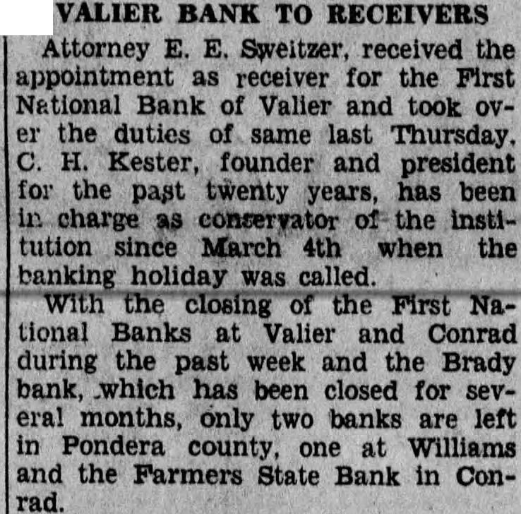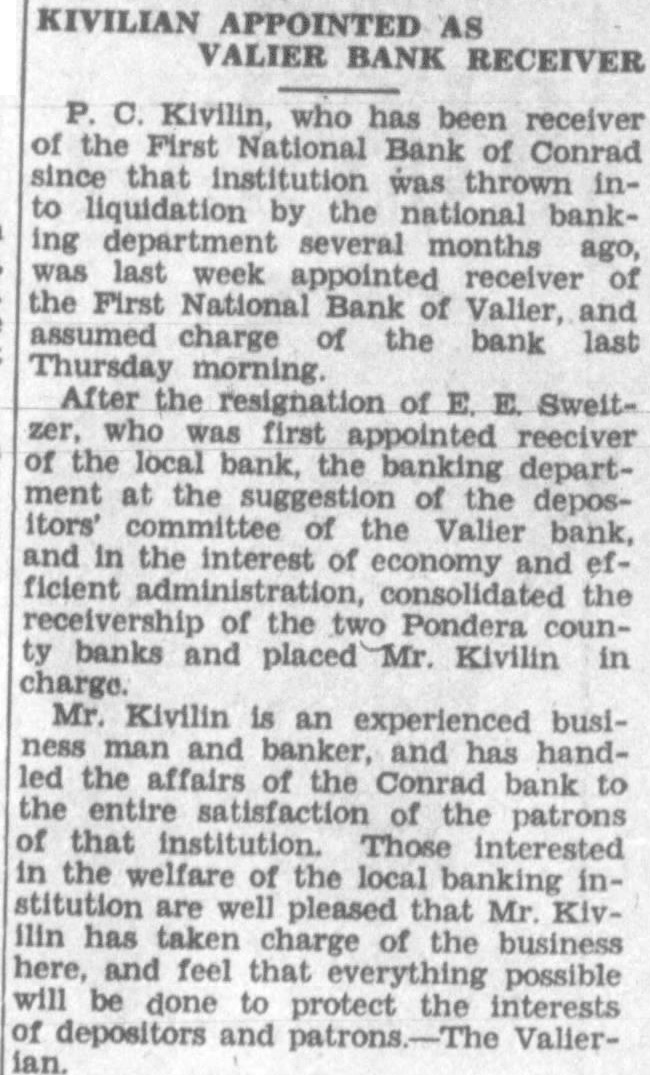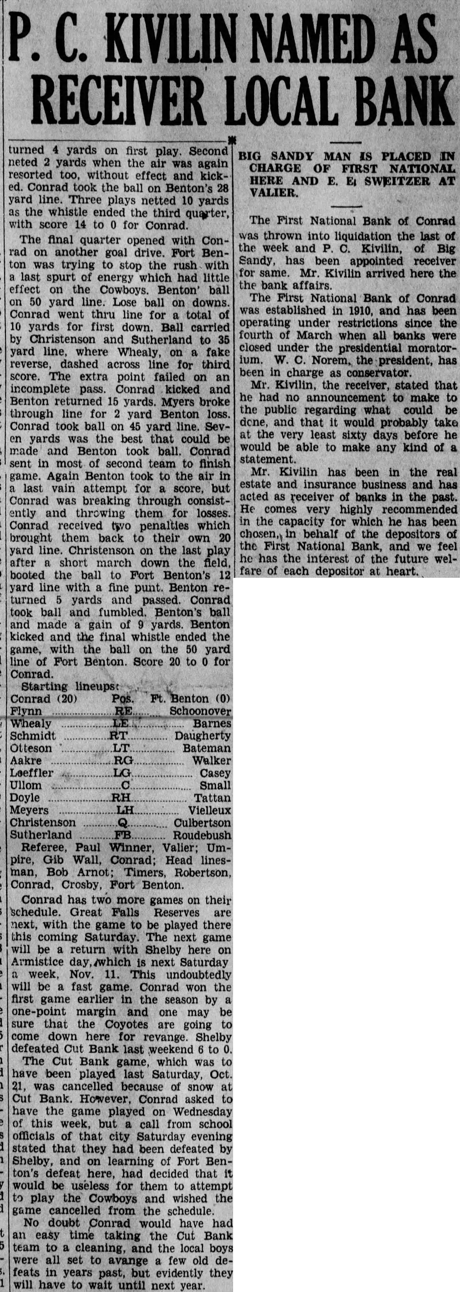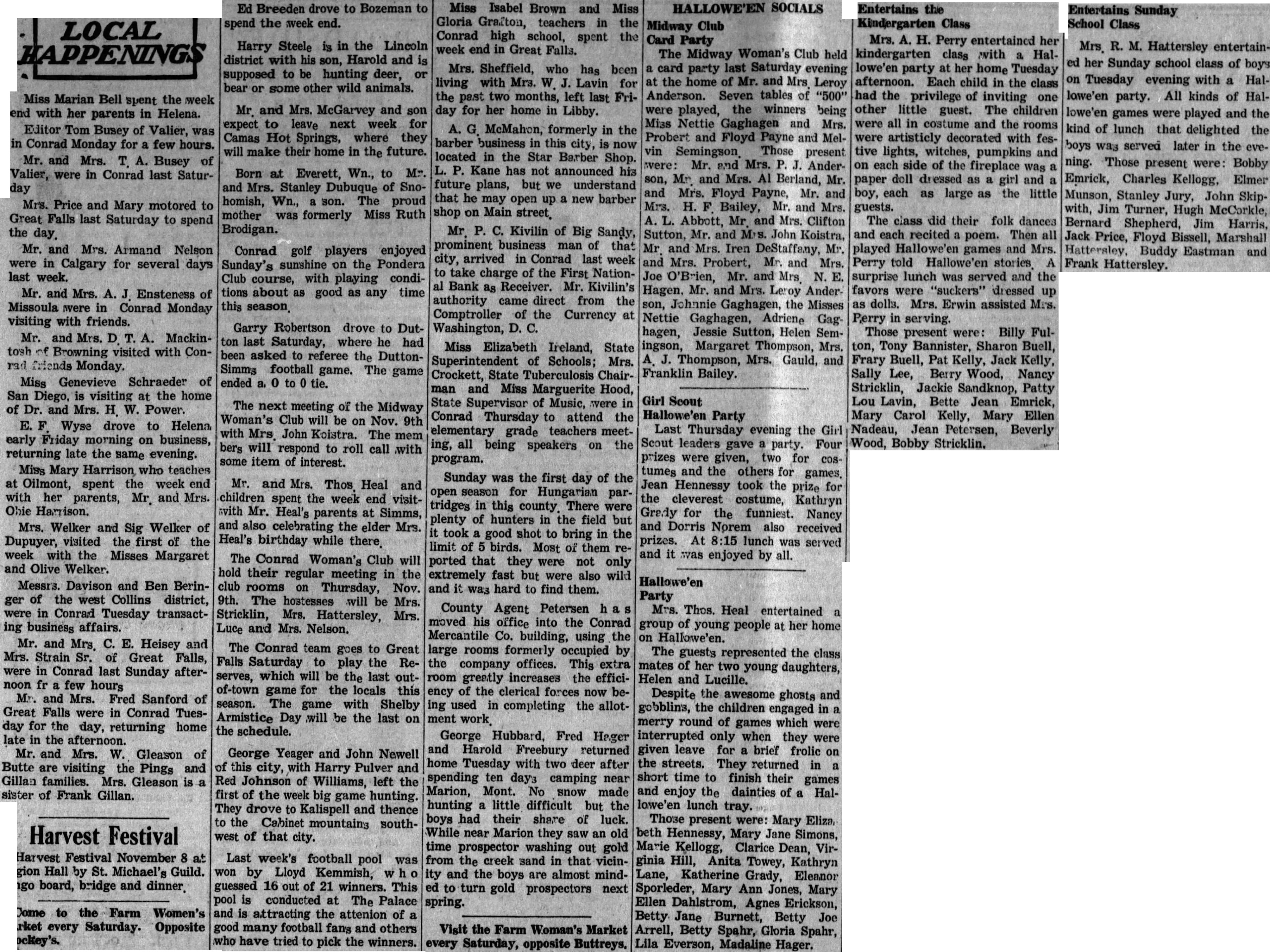LOCAL APPENINGS Miss Marian Bell spent the week end with her parents in Helena. Editor Tom Busey of Valier, was in Conrad Monday for a few hours. Mr. and Mrs. T. A. Busey of Valier, were in Conrad last Saturday Mrs. Price and Mary motored to Great Falls last Saturday to spend the day. Mr. and Mrs. Armand Nelson were in Calgary for several days last week. Mr. and Mrs. A. J. Ensteness of Missoula were in Conrad Monday visiting with friends. Mr. and Mrs. D T. A. Mackintosh of Browning visited with Conrad friends Monday. Miss Genevieve Schraeder of San Diego, is visiting at the home of Dr. and Mrs. H. W. Power. E. F Wyse drove to Helena early Friday morning on business, returning late the same evening. Miss Mary Harrison who teaches at Oilmont, spent the week end with her parents, Mr. and Mrs. Ohie Harrison. Mrs. Welker and Sig Welker of Dupuyer, visited the first of the week with the Misses Margaret and Olive Welker. Messrs. Davison and Ben Beringer of the west Collins district, were in Conrad Tuesday transacting business affairs. Mr. and Mrs. C. E. Heisey and Mrs. Strain Sr. of Great Falls, were in Conrad last Sunday afternoon fr a few hours Mr. and Mrs. Fred Sanford of Great Falls were in Conrad Tuesday for the day, returning home late in the afternoon. Mr. and Mrs. W. Gleason of Butte are visiting the Pings and Gillan families. Mrs. Gleason is a sister of Frank Gillan. Ed Breeden drove to Bozeman to Miss Isabel Brown and Miss spend the week end. Gloria Grafton, teachers in the Harry Steele is in the Lincoln week end in Great Falls. district with his son, Harold and is Mrs. Sheffield, who has been supposed to be hunting deer, or living with Mrs. W. J. Lavin for bear or some other wild animals. Mr. and Mrs. McGarvey and son day for her home in Libby. expect to leave next week for A. G. McMahon, formerly in the Camas Hot Springs, where they barber business in this city, is now will make their home in the future. located in the Star Barber Shop. L. P. Kane has not announced his Born at Everett, Wn., to Mr. future plans, but we understand and Mrs. Stanley Dubuque of Snothat he may open up a new barber homish, Wn., a son. The proud shop on Main street mother was formerly Miss Ruth Brodigan. Mr P. C. Kivilin of Big Sandy, Conrad golf players enjoyed Sunday's sunshine on the Pondera Club course, with playing conditions about as good as any time this season Garry Robertson drove to Dutton last Saturday, where he had been asked to referee the DuttonSimms football game. The game ended a. 0 to 0 tie. The next meeting of the Midway Woman's Club will be on Nov. 9th with Mrs. John Koistra. The mem bers will respond to roll call with some item of interest. Conrad high school, spent the the past two months, left last Fri- prominent business man of that city, arrived in Conrad last week to take charge of the First National Bank as Receiver. Mr. Kivilin's authority came direct from the Comptroller of the Currency at Washington, D. C. Miss Elizabeth Ireland, State Superintendent of Schools; Mrs. Crockett, State Tuberculosis Chairman and Miss Marguerite Hood, State Supervisor of Music, were in Conrad Thursday to attend the elementary grade teachers meeting, all being speakers on the program. Mr. and Mrs. Thos Heal and children spent the week end visitwith Mr. Heal's parents at Simms, and also celebrating the elder Mrs. Heal's birthday while there. The Conrad Woman's Club will hold their regular meeting in the club rooms on Thursday, Nov. 9th. The hostesses will be Mrs. Stricklin, Mrs. Hattersley, Mrs. Luce and Mrs. Nelson. The Conrad team goes to Great Falls Saturday to play the Reserves, which will be the last outof-town game for the locals this season. The game with Shelby Armistice Day will be the last on the schedule. George Yeager and John Newell of this city, with Harry Pulver and Red Johnson of Williams, left the first of the week big game hunting. They drove to Kalispell and thence to the Cabinet mountains southwest of that city. Last week's football pool was won by Lloyd Kemmish, W h O guessed 16 out of 21 winners. This pool is conducted at The Palace and is attracting the attenion of a good many football fans and others who have tried to pick the winners. Sunday was the first day of the open season for Hungarian partridges in this county. There were plenty of hunters in the field but it took a good shot to bring in the limit of 5 birds. Most of them reported that they were not only extremely fast but were also wild and it was hard to find them. County Agent Petersen h a S moved his office into the Conrad Mercantile Co. building, using the large rooms formerly occupied by the company offices. This extra room greatly increases the efficiency of the clerical forces now being used in completing the allotment work George Hubbard, Fred Hager and Harold Freebury returned home Tuesday with two deer after spending ten days camping near Marion, Mont. No snow made hunting a little difficult but the boys had their share of luck. While near Marion they saw an old time prospector washing out gold from the creek sand in that vicinity and the boys are almost minded to turn gold prospectors next spring. Visit the Farm Woman's Market every Saturday, opposite Buttreys. HALLOWE'EN SOCIALS Midway Club Card Party The Midway Woman's Club held a card party last Saturday evening at the home of Mr. and Mrs Leroy Anderson. Seven tables of "500" were played, the winners being Miss Nettie Gaghagen and Mrs. Probert and Floyd Payne and Melvin Semingson. Those present were: Mr. and Mrs. P. J. Anderson, Mr. and Mrs. Al Berland, Mr. and Mrs. Floyd Payne, Mr. and Mrs. H. F Bailey, Mr. and Mrs. A. L. Abbott, Mr. and Mrs. Clifton Sutton, Mr. and Mrs. John Koistra, Mr and Mrs. Iren DeStaffany, Mr. and Mrs. Probert, Mr. and Mrs. Joe O'Brien, Mr. and Mrs. N. E. Hagen, Mr. and Mrs. Leroy Anderson, Johnnie Gaghagen, the Misses Nettie Gaghagen, Adriene Gag hagen, Jessie Sutton, Helen Semingson, Margaret Thompson, Mrs. A. J. Thompson, Mrs. G