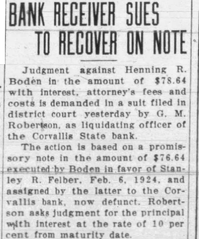Judgment against Henning Boden in the amount of $78.64 with interest. attorney's fees and costs demanded suit filed district court yesterday by Robertson. liquidating officer of the Corvallis State bank. The action is based on promissory note in the amount of $76.64 executed Boden favor of Stanley Felber. Feb. 1924. and assigned by the latter to the Corvallis bank. now defunct. Robertson asks judgment for the principal with interest nt the rate of 10 per cent from maturity date.