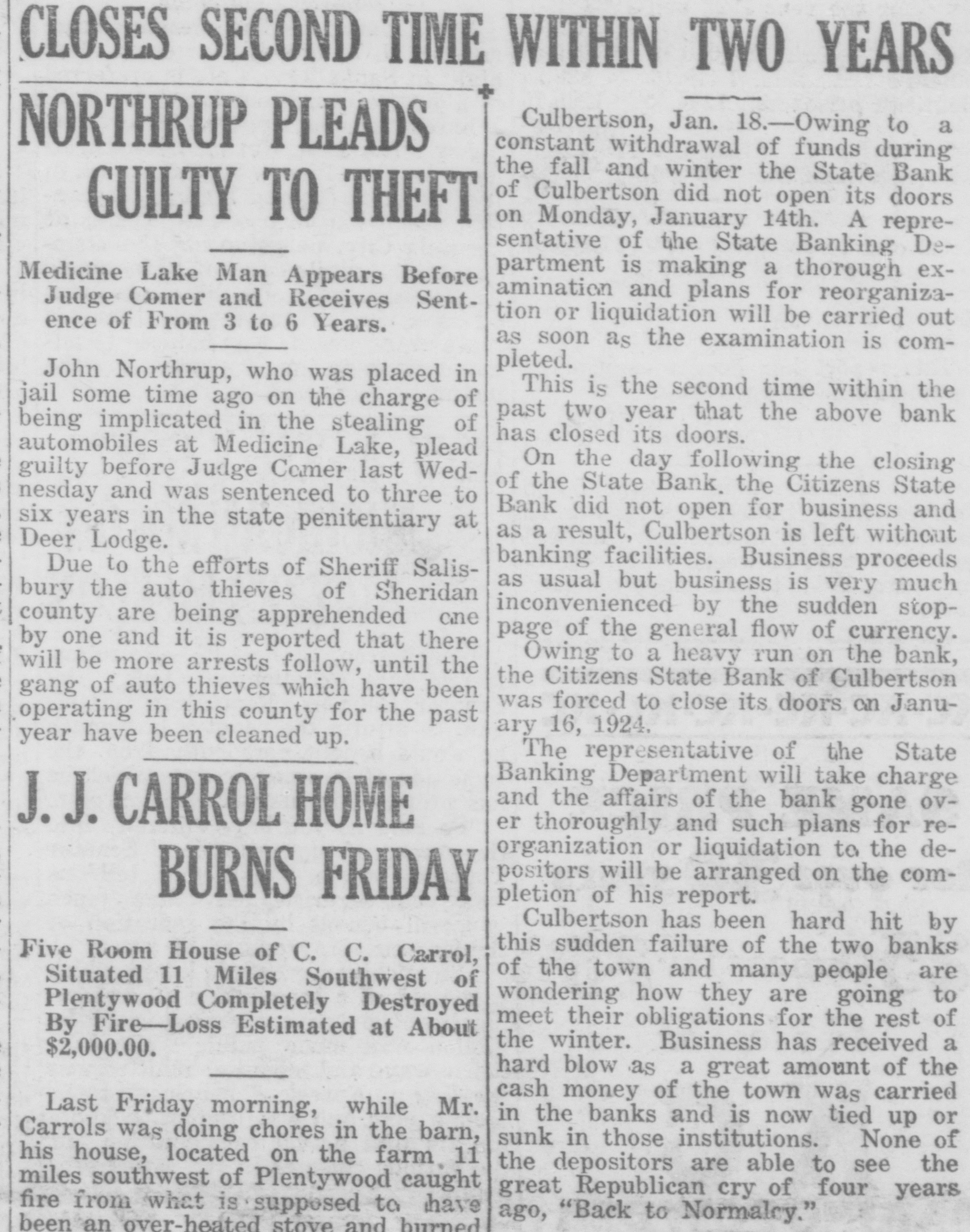 CLOSES SECOND TIME WITHIN TWO YEARS Culbertson, Jan. -Owing to a NORTHRUP PLEADS constant withdrawal of funds during the fall and winter the State Bank of Culbertson did not open its doors GUILTY TO THEFT on Monday, January 14th. A representative of the State Banking Department is making a thorough exMedicine Lake Man Appears Before amination and plans for reorganizaJudge Comer and Receives Senttion or liquidation will be carried out ence of From 3 to 6 Years. as soon as the examination is completed. John Northrup, who was placed in This is the second time within the jail some time ago on the charge of past two year that the above bank being implicated in the stealing of has closed its doors. automobiles at Medicine Lake, plead On the day following the closing guilty before Judge Camer last Wedof the State Bank. the Citizens State nesday and was sentenced to three to Bank did not open for business and six years in the state penitentiary at as a result, Culbertson is left without Deer Lodge. banking facilities. Business proceeds Due to the efforts of Sheriff Salisas usual but business is very much bury the auto thieves of Sheridan inconvenienced by the sudden stopcounty are being apprehended one page of the general flow of currency. by one and it is reported that there Owing to a heavy run on the bank, will be more arrests follow, until the the Citizens State Bank of Culbertson gang of auto thieves which have been was forced to close its doors on Januoperating in this county for the past ary 16, 1924. year have been cleaned up. The representative of the State Banking Department will take charge and the affairs of the bank gone OVJ.J. CARROL HOME er thoroughly and such plans for reorganization or liquidation to the depositors will be arranged on the comBURNS FRIDAY pletion of his report. Culbertson has been hard hit by this sudden failure of the two banks Five Room House of C. C. Carrol, of the town and many people are Situated 11 Miles Southwest of wondering how they are going to Plentywood Completely Destroyed meet their obligations for the rest of By Fire-Loss Estimated at About the winter. Business has received a $2,000.00. hard blow as a great amount of the cash money of the town was carried Last Friday morning, while Mr. in the banks and is new tied up or Carrols was doing chores in the barn, sunk in those institutions. None of his house, located on the farm, 11 the depositors are able to see the miles southwest of Plentywood caught great Republican cry of four years fire from what is supposed to have ago, "Back to Normalcy." been an over-heated stove and burned
