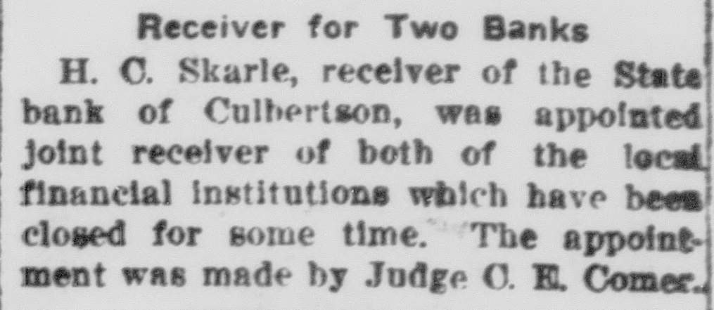 # Receiver for Two Banks H. C. Skarle, receiver of the State bank of Culbertson, was appointed joint receiver of both of the local financial institutions which have been closed for some time: The appointment was made by Judge C. E. Comer.