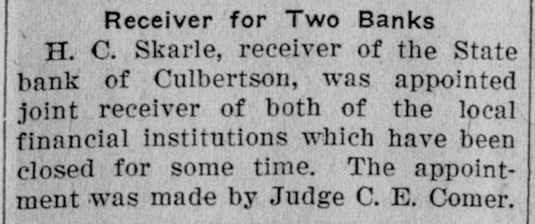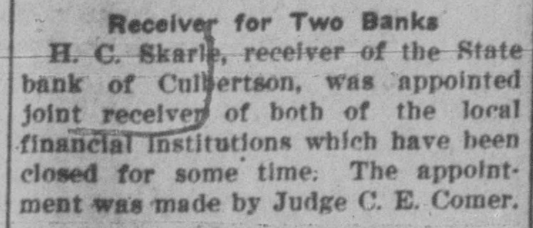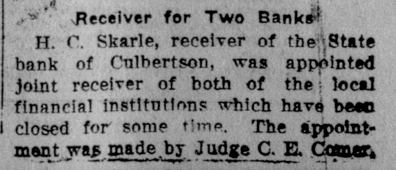 Receiver for Two Banks H. C. Skarle, receiver of the State bank of Culbertson, was appointed joint receiver of both of the local financial institutions which have been closed for some time. The appointment was made by Judge C. E. Comer,